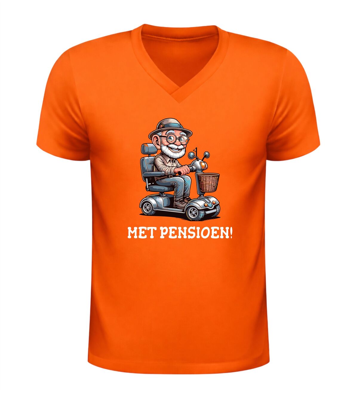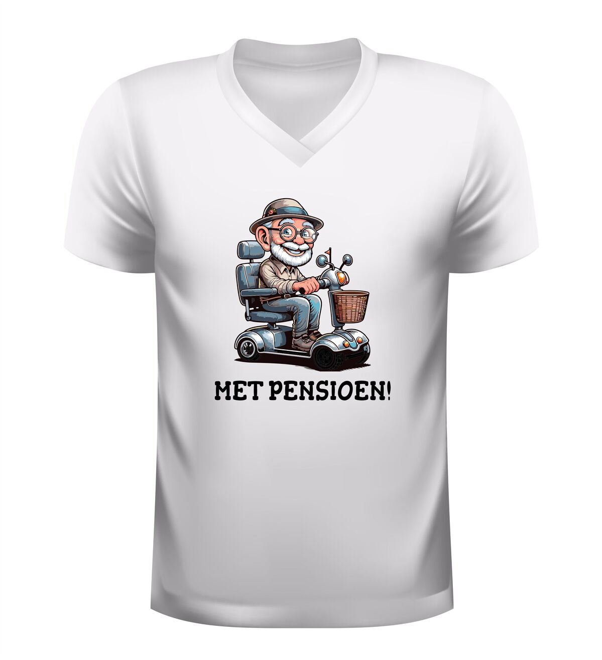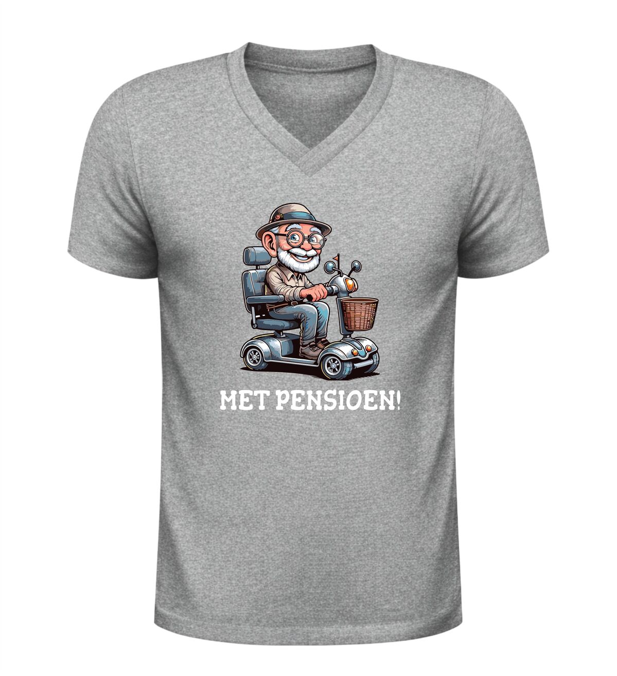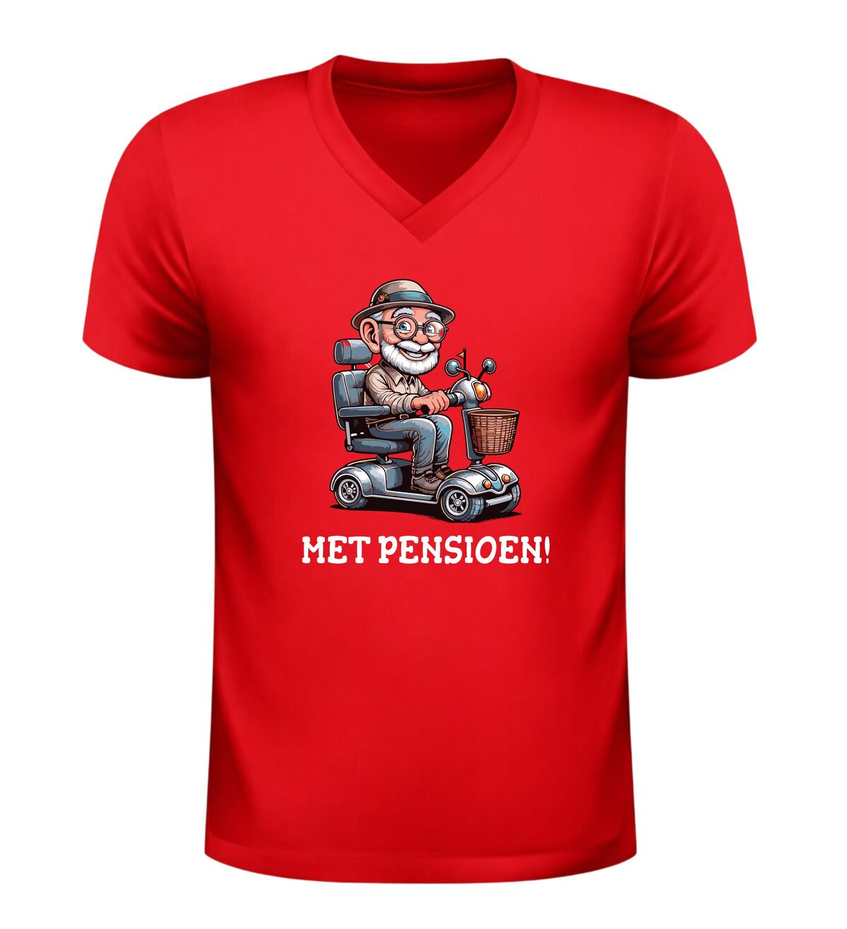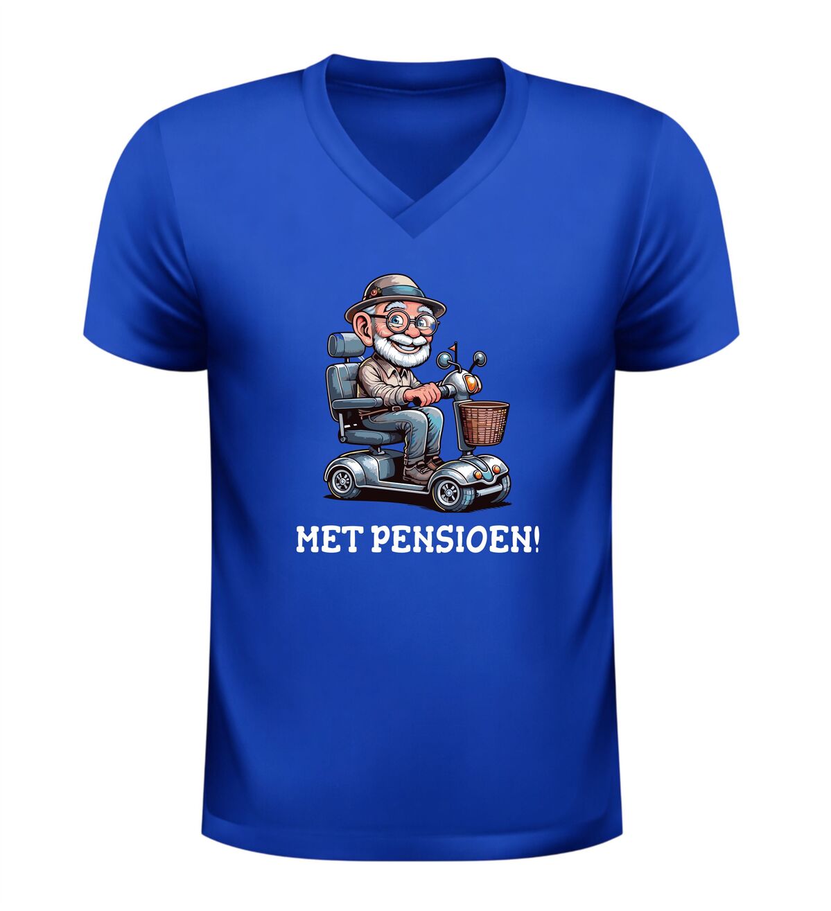 Dit V-hals shirt voor heren met de tekst pensioen en een grappige afbeelding van een oude man op een scootmobiel is een perfect kledingstuk om het pensioen op een luchtige en humoristische manier te vieren. Met pensioen gaan is een bijzondere mijlpaal en dit pensioen shirt laat zien dat deze nieuwe levensfase draait om vrijheid, ontspanning en plezier. De vrolijke afbeelding van de oude man op de scootmobiel geeft het shirt een speelse uitstraling en benadrukt dat pensioen vooral genieten betekent.