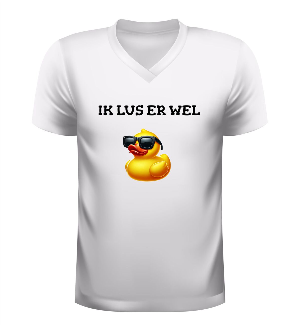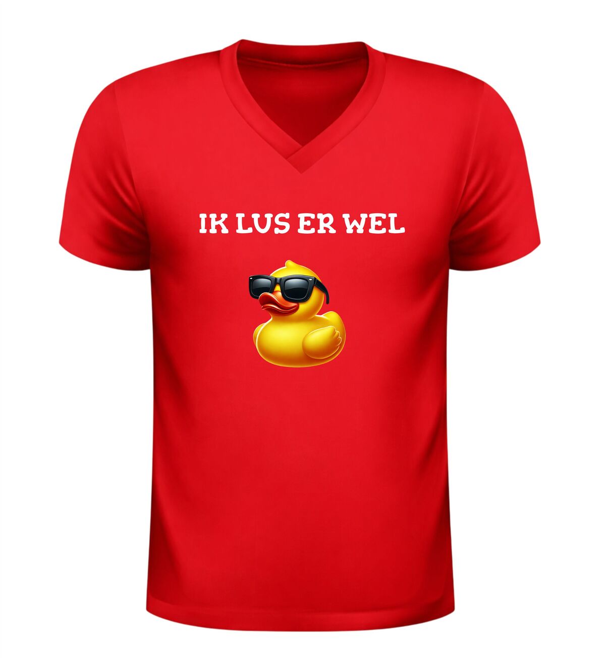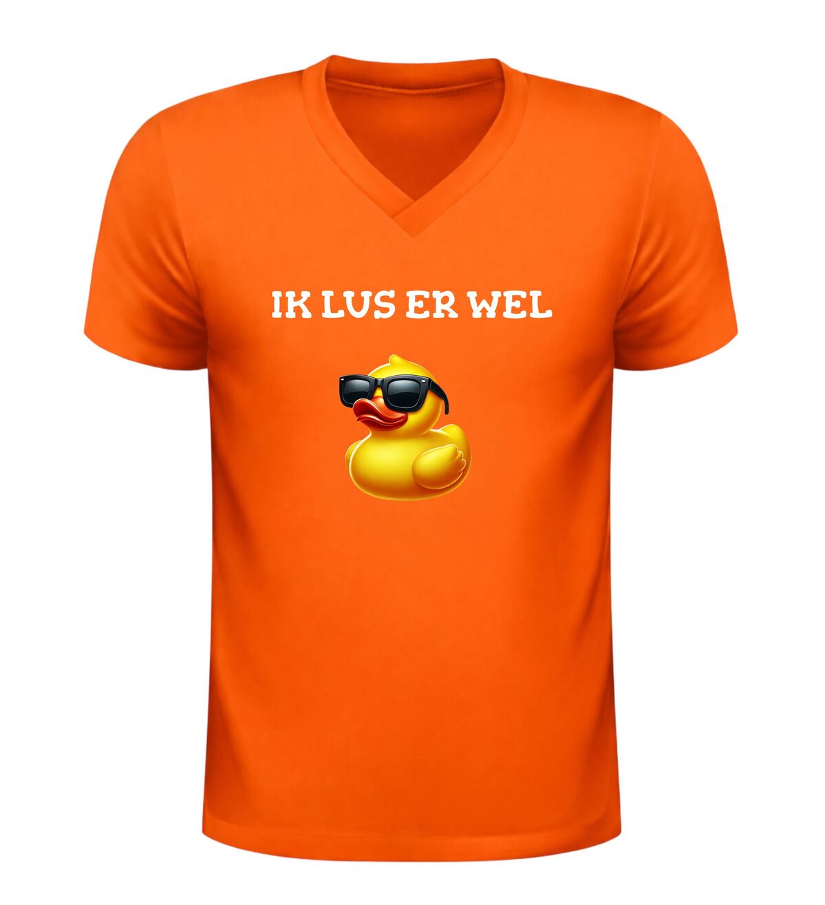 Dit v-hals shirt met de tekst ik lus er wel eentje en een vrolijke afbeelding van een eend met zonnebril is een echte blikvanger voor carnaval, feestjes en andere gezellige momenten. Het speelse en humoristische ontwerp straalt ontspanning en feestplezier uit en zorgt direct voor een lach bij iedereen die het ziet. Ideaal voor carnavalsoptochten, kroegentochten, festivals of een themafeest waarbij een luchtige en grappige outfit perfect past. De comfortabele V-hals en prettige pasvorm maken het shirt fijn om te dragen tijdens lange avonden vol gezelligheid. De combinatie van de bekende uitspraak en de grappige eend met zonnebril geeft het shirt een unieke en herkenbare uitstraling. Met dit feestelijke V-hals shirt laat je zien dat je zin hebt in gezelligheid en maak je van elke gelegenheid een feestje.