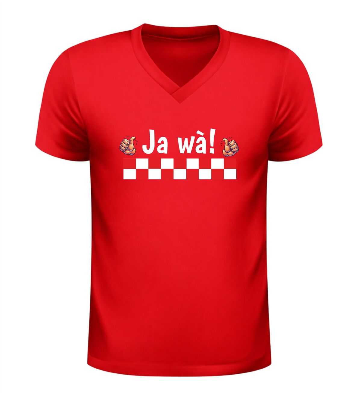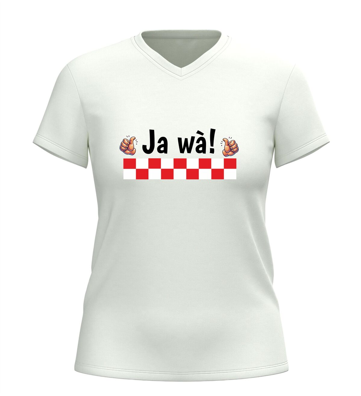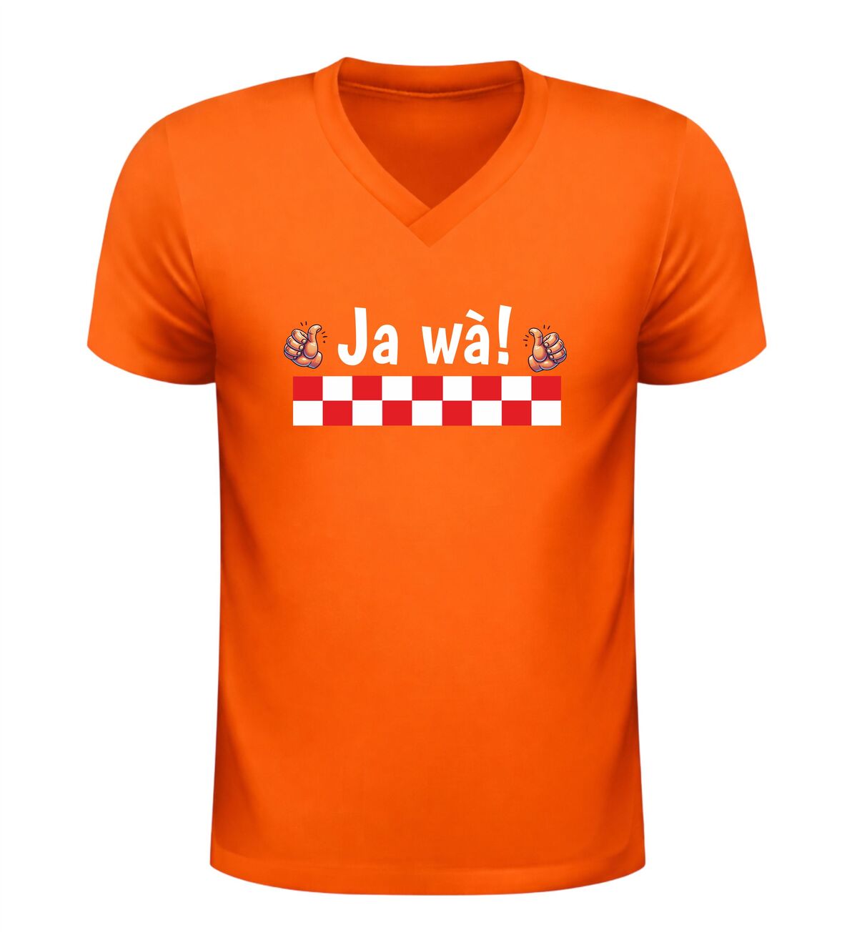 Dit V-hals T-shirt met de Brabantse tekst ja wa is hét perfecte shirt voor carnaval, feestjes en lange avonden vol gezelligheid. De herkenbare Brabantse uitspraak zorgt meteen voor sfeer en laat zien dat jij het feest niet te serieus neemt. Dankzij de comfortabele V-hals en de fijne pasvorm zit het shirt heerlijk, zelfs tijdens urenlang hossen, dansen en meezingen in de kroeg of feesttent. Met zijn eenvoudige maar opvallende design is dit Brabants V-hals shirt makkelijk te combineren met een jasje, sjaal of carnavalsaccessoires. Ben je op zoek naar een grappig en herkenbaar carnavals shirt met Brabantse tekst, dan is dit “Ja wa” T-shirt een echte must-have en ook een perfect cadeau voor iedere carnavalsliefhebber.
