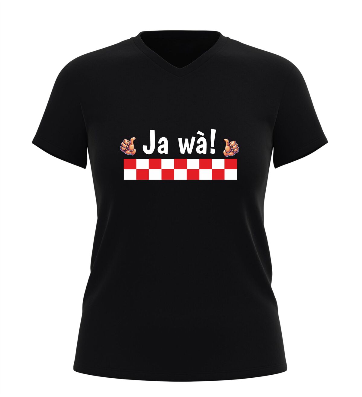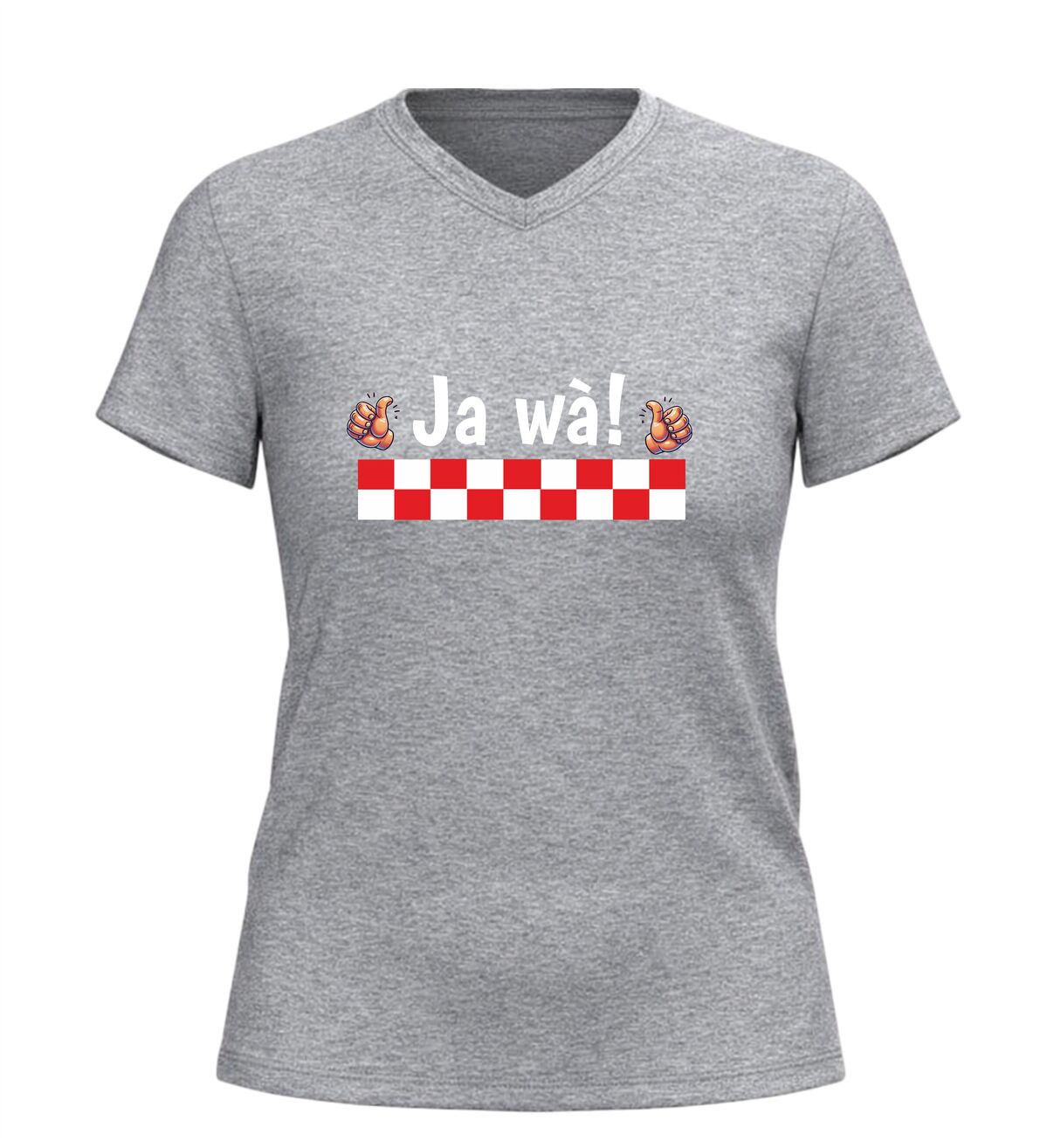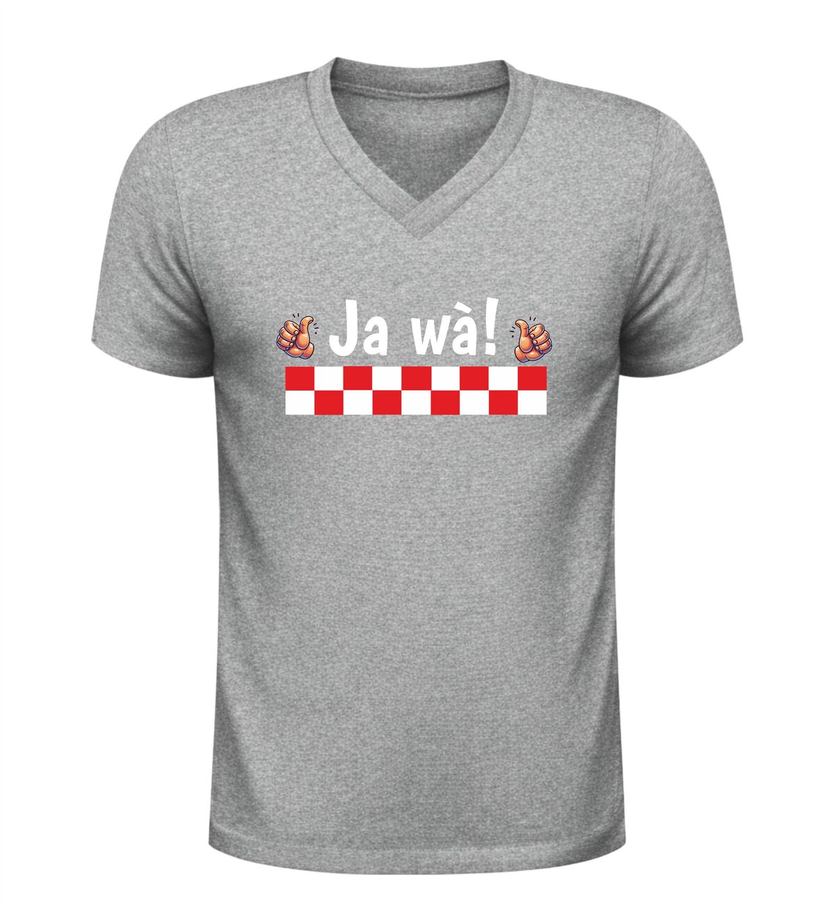 Dit V-hals T-shirt met de Brabantse tekst ja wa is hét perfecte shirt voor carnaval, feestjes en lange avonden vol gezelligheid. De herkenbare Brabantse uitspraak zorgt meteen voor sfeer en laat zien dat jij het feest niet te serieus neemt. Dankzij de comfortabele V-hals en de fijne pasvorm zit het shirt heerlijk, zelfs tijdens urenlang hossen, dansen en meezingen in de kroeg of feesttent. Met zijn eenvoudige maar opvallende design is dit Brabants V-hals shirt makkelijk te combineren met een jasje, sjaal of carnavalsaccessoires. Ben je op zoek naar een grappig en herkenbaar carnavals shirt met Brabantse tekst, dan is dit “Ja wa” T-shirt een echte must-have en ook een perfect cadeau voor iedere carnavalsliefhebber.
