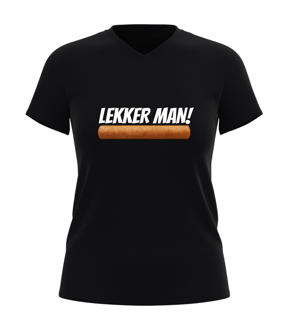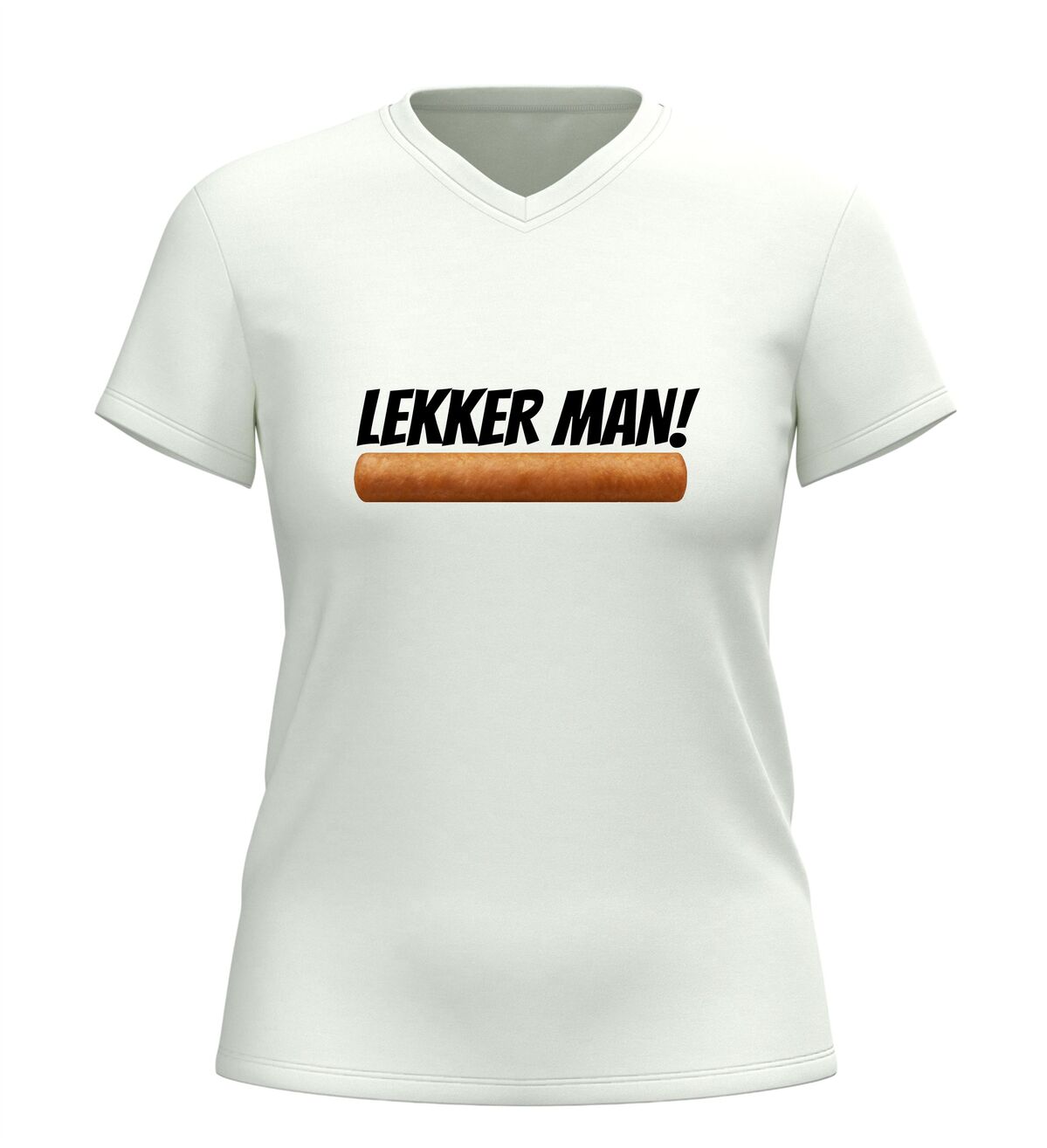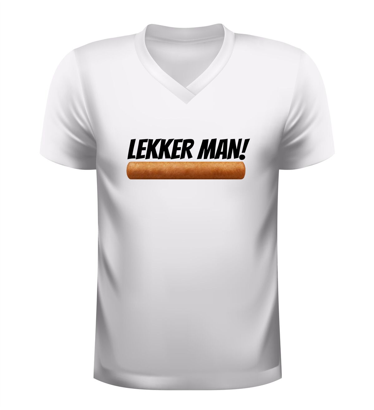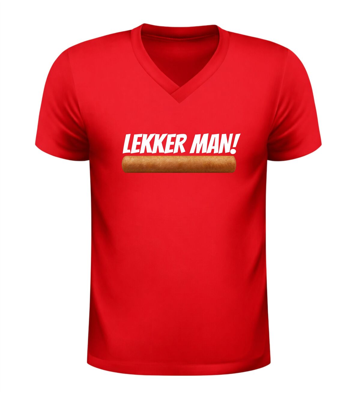 Dit V-hals shirt met de tekst lekker man en een frikandel afbeelding is gemaakt voor mensen met gevoel voor humor en een liefde voor Nederlandse snackcultuur. De combinatie van de brutale tekst en de herkenbare frikandel zorgt direct voor een lach en maakt dit shirt een echte blikvanger op elk feestje.