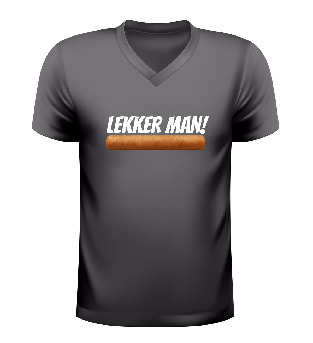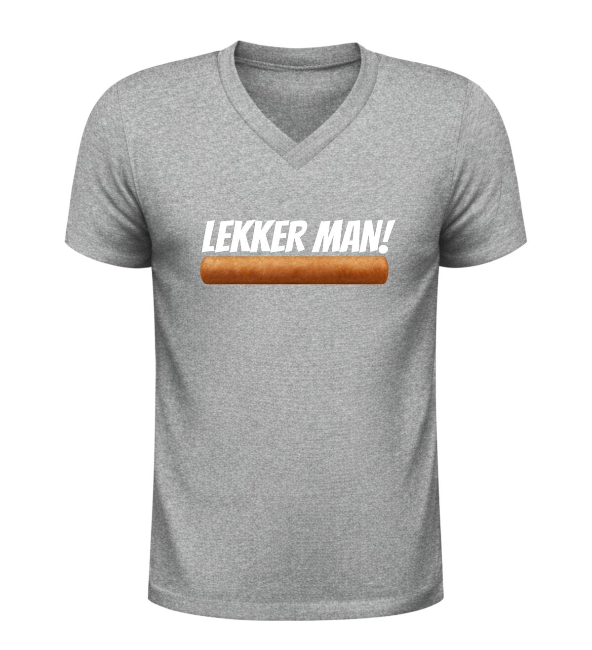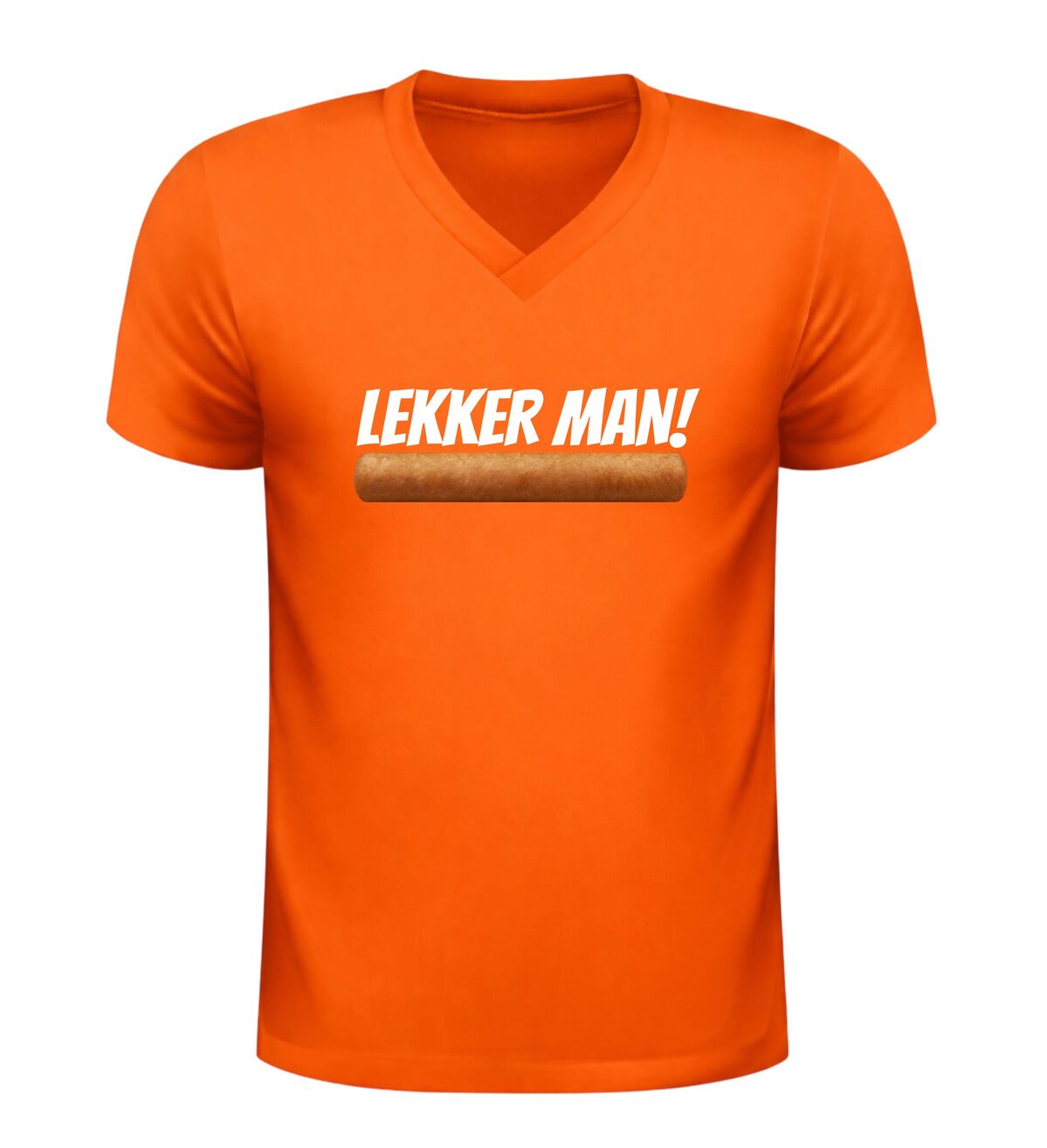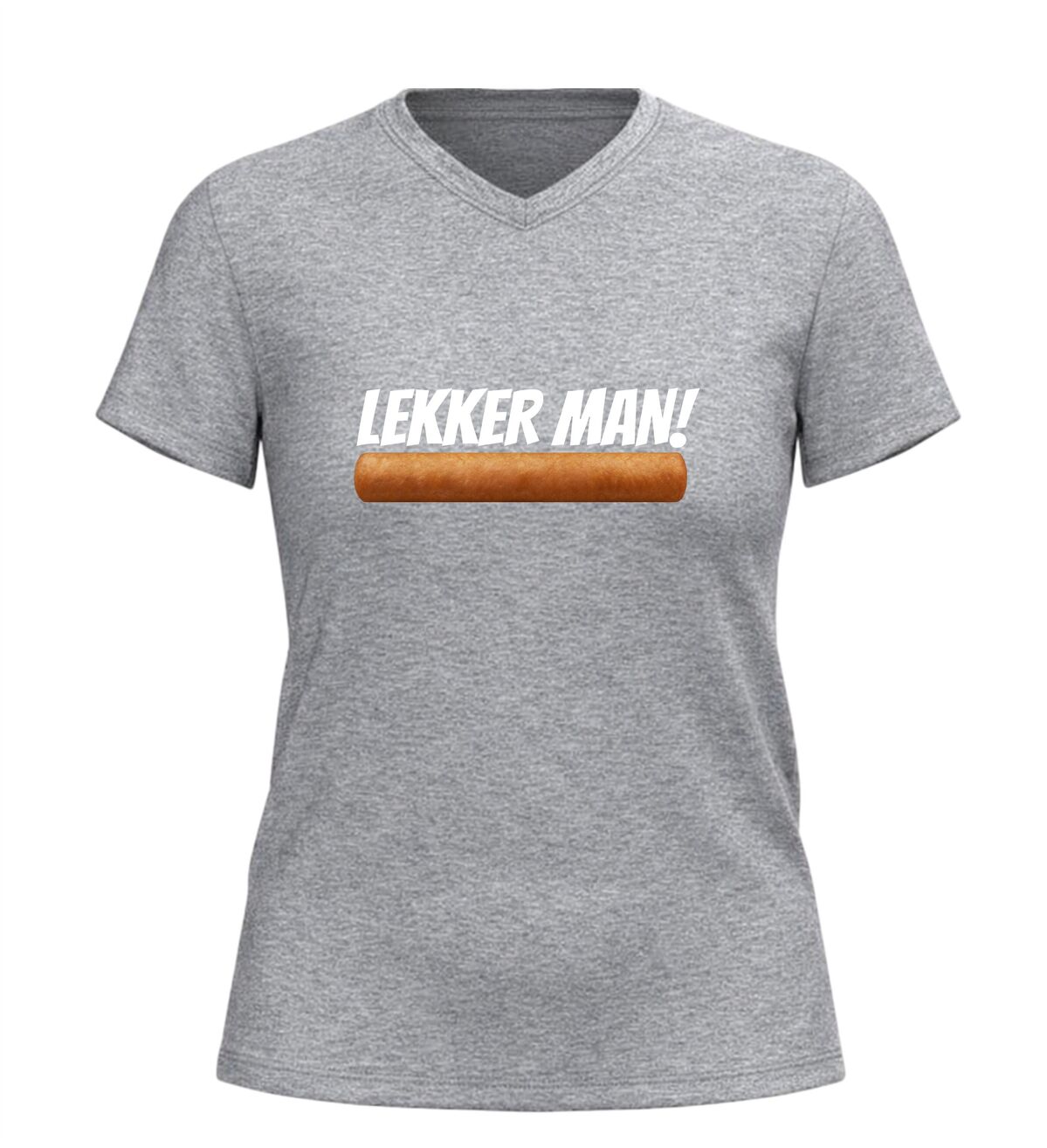 Dit V-hals shirt met de tekst lekker man en een frikandel afbeelding is gemaakt voor mensen met gevoel voor humor en een liefde voor Nederlandse snackcultuur. De combinatie van de brutale tekst en de herkenbare frikandel zorgt direct voor een lach en maakt dit shirt een echte blikvanger op elk feestje.