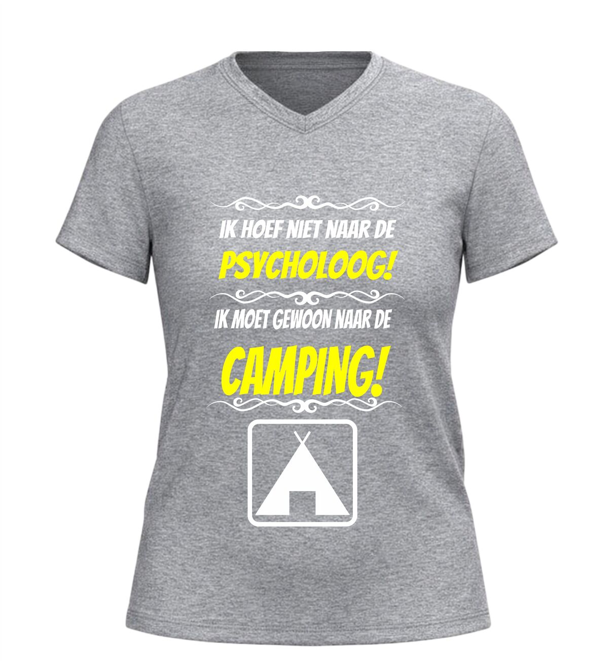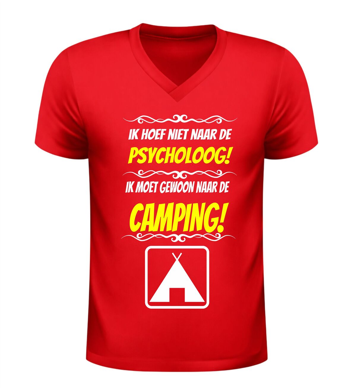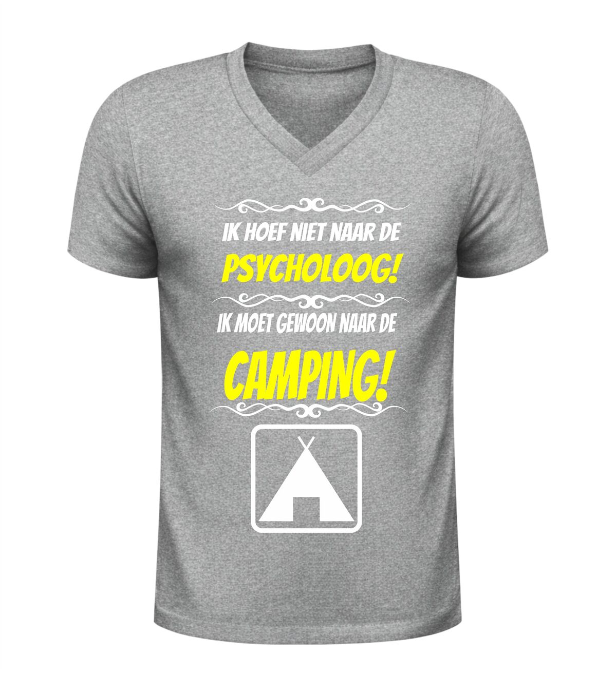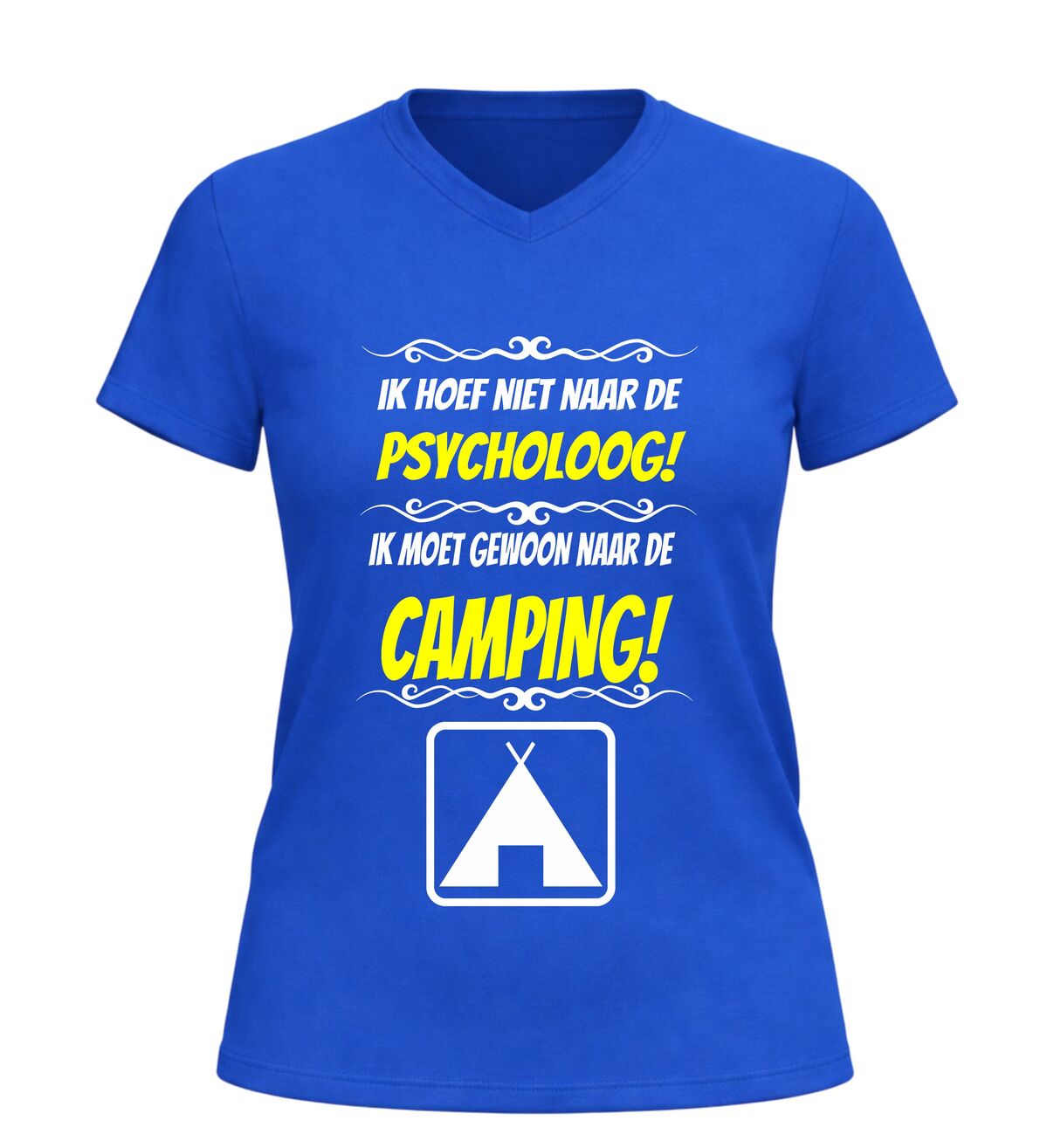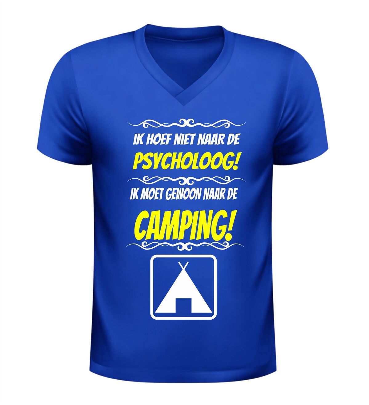 Dit V-hals shirt met de tekst Ik hoef niet naar de psycholoog, ik moet gewoon naar de camping is gemaakt voor iedereen die ontspanning vindt tussen tentdoek, caravan of camper. Het shirt verwoordt op een humoristische manier wat veel kampeerders voelen: even weg van de drukte en terug naar het eenvoudige campingleven doet meer dan duizend gesprekken. De comfortabele V-hals en fijne pasvorm maken dit shirt ideaal voor lange zomerdagen op de camping, tijdens het barbecueën, wandelen of ontspannen voor de tent. Door de herkenbare tekst is het een leuke gesprekstarter en een perfect cadeau voor fanatieke kampeerders, vakantiegangers en liefhebbers van het buitenleven. Dit shirt past perfect bij wie zoekt naar een origineel camping shirt met tekst, een grappig kampeer T-shirt, of een ontspannen vakantie shirt dat laat zien waar jij echt tot rust komt.