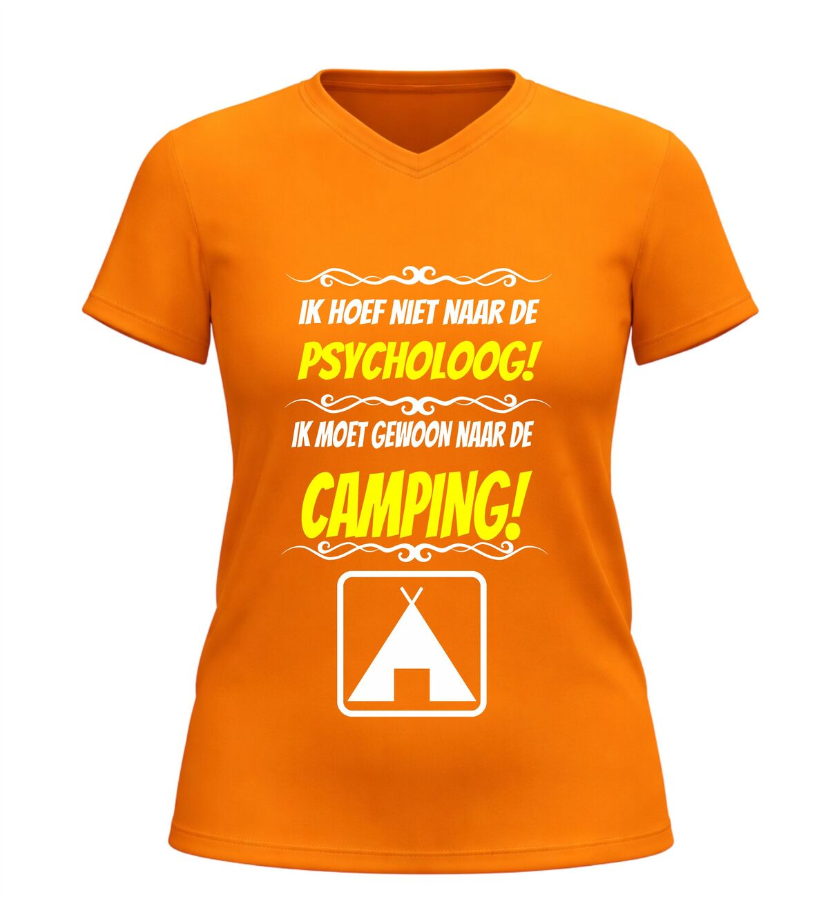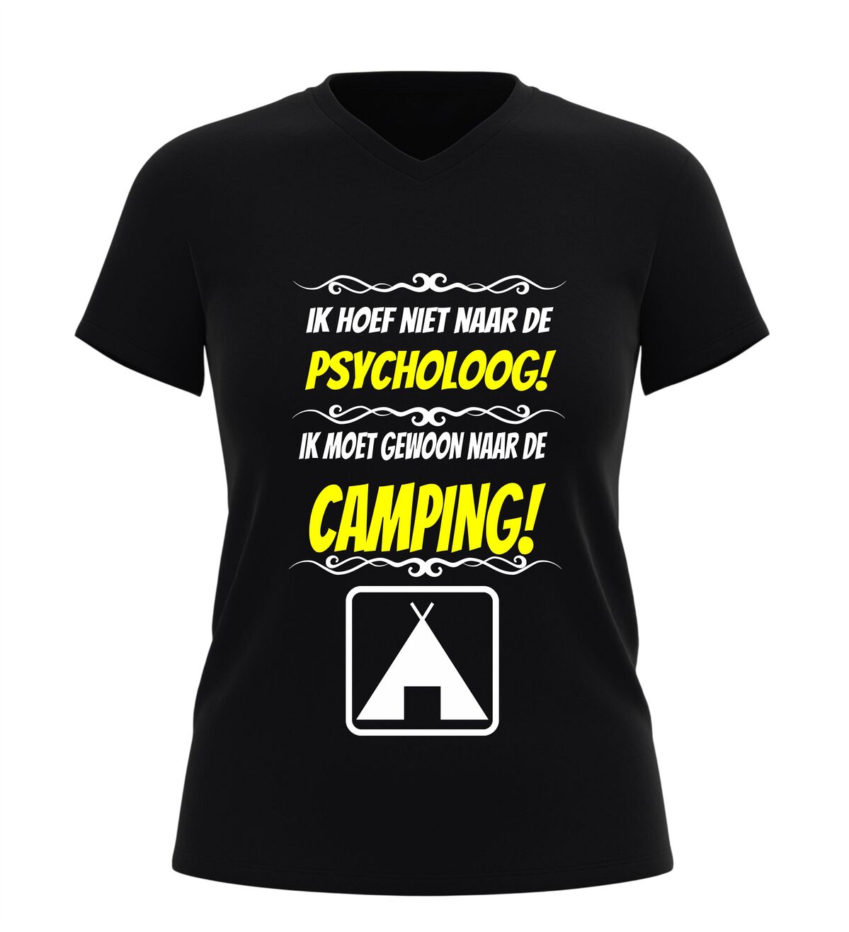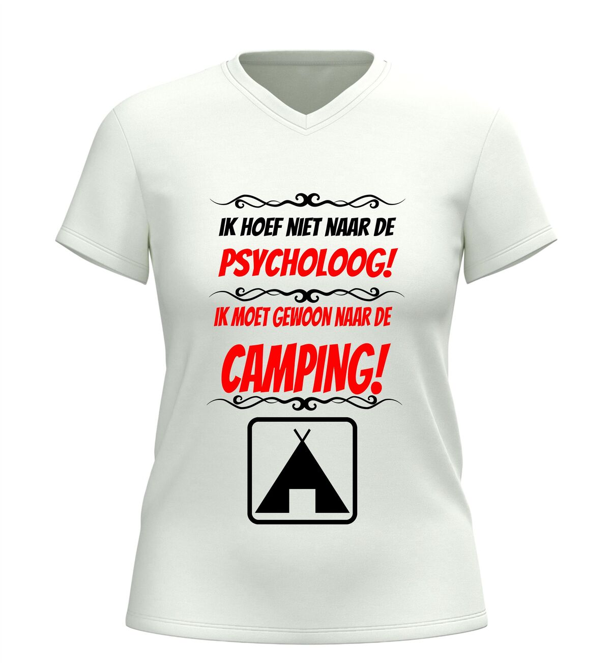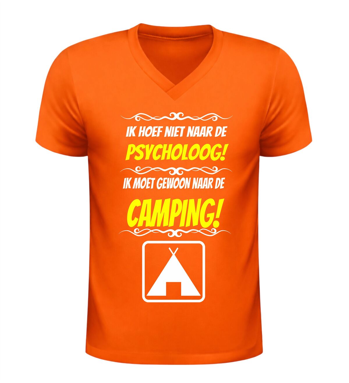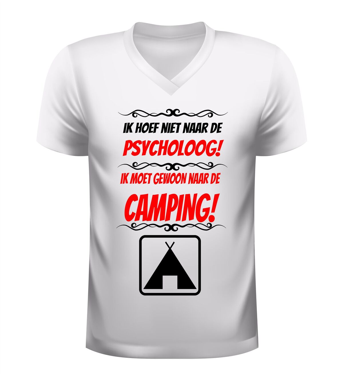 Dit V-hals shirt met de tekst Ik hoef niet naar de psycholoog, ik moet gewoon naar de camping is gemaakt voor iedereen die ontspanning vindt tussen tentdoek, caravan of camper. Het shirt verwoordt op een humoristische manier wat veel kampeerders voelen: even weg van de drukte en terug naar het eenvoudige campingleven doet meer dan duizend gesprekken. De comfortabele V-hals en fijne pasvorm maken dit shirt ideaal voor lange zomerdagen op de camping, tijdens het barbecueën, wandelen of ontspannen voor de tent. Door de herkenbare tekst is het een leuke gesprekstarter en een perfect cadeau voor fanatieke kampeerders, vakantiegangers en liefhebbers van het buitenleven. Dit shirt past perfect bij wie zoekt naar een origineel camping shirt met tekst, een grappig kampeer T-shirt, of een ontspannen vakantie shirt dat laat zien waar jij echt tot rust komt.