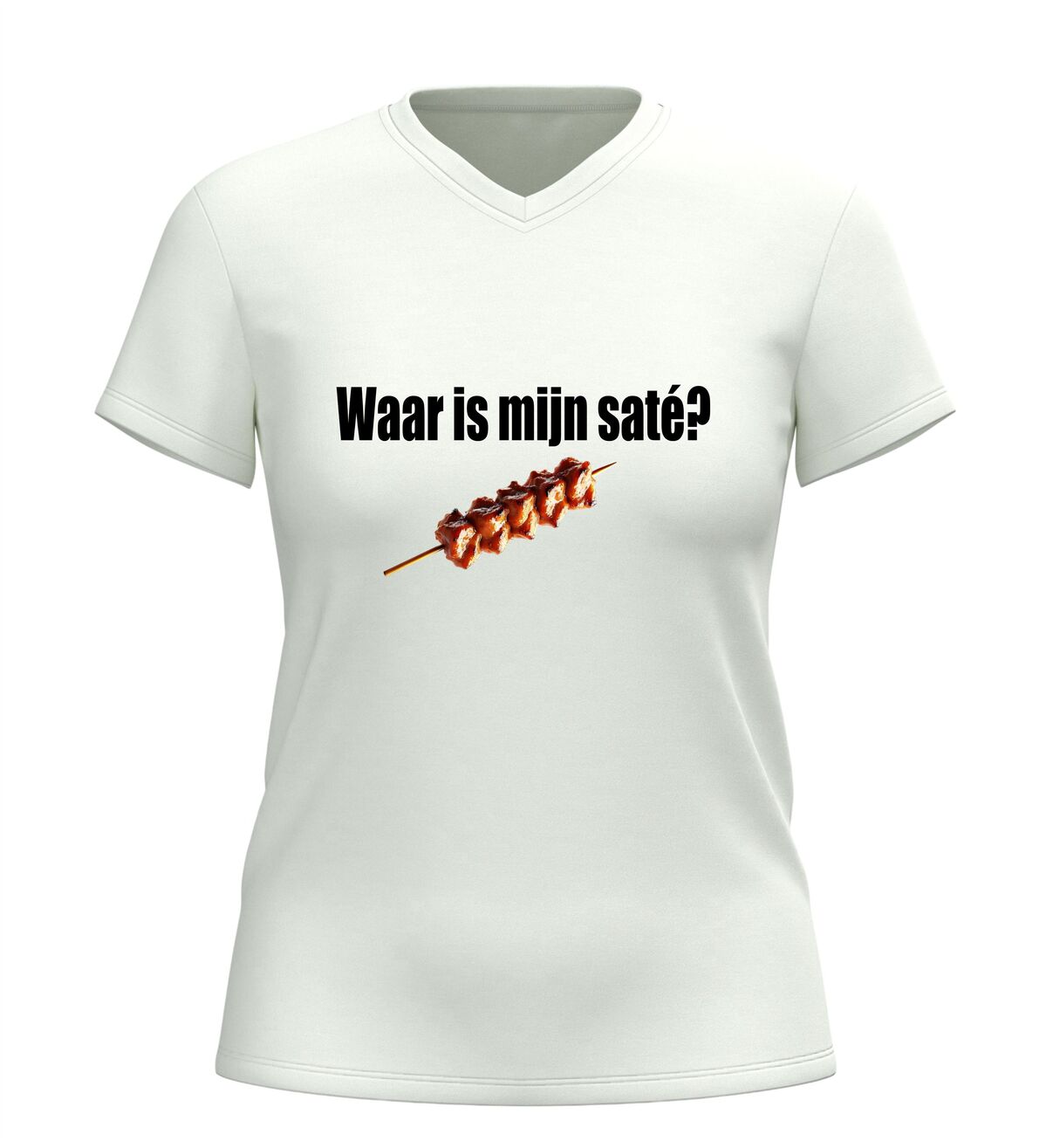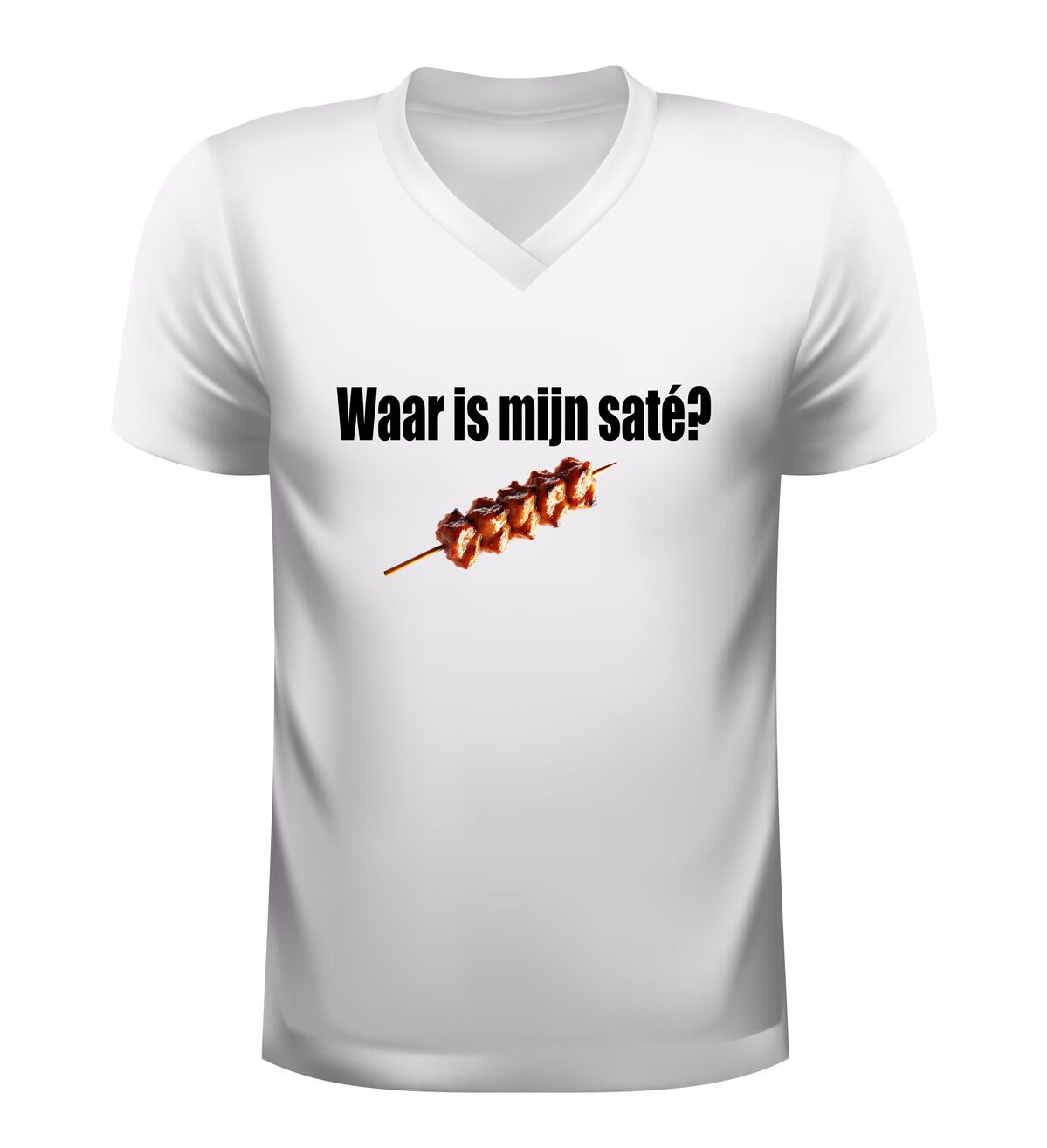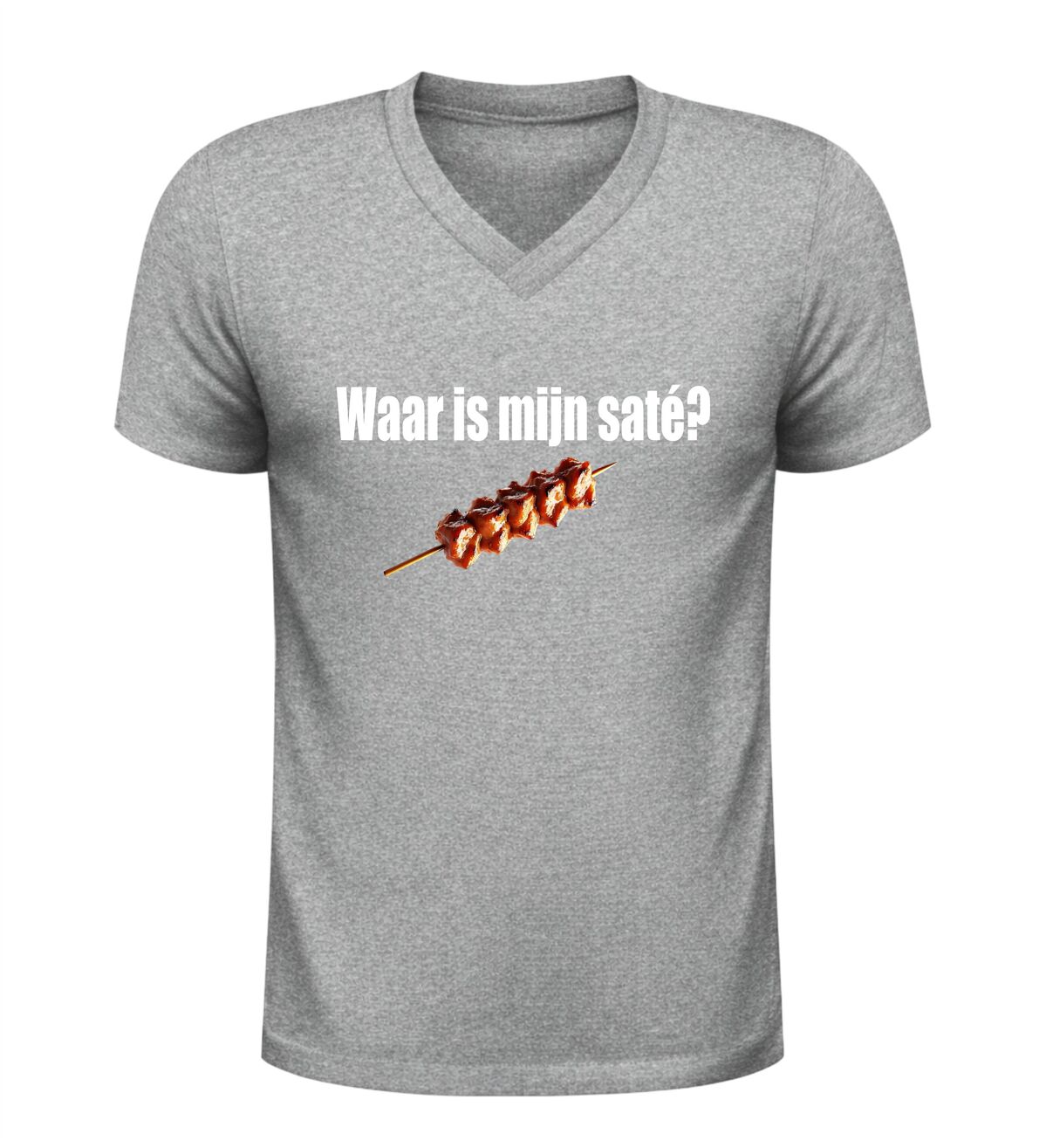 Dit V-hals T-shirt met de tekst Waar is mijn saté? en een duidelijke saté-afbeelding is perfect voor iedereen met een grote liefde voor eten, humor en gezelligheid. Saté is niet zomaar eten, het is een begrip, en dat zie je meteen terug in dit grappige shirt. De combinatie van de herkenbare tekst en de afbeelding van een saté(spies) zorgt voor een humoristische uitstraling die direct de aandacht trekt. Dit maakt het shirt ideaal voor mensen die houden van eten, barbecueën, festivals en een goede dosis zelfspot.