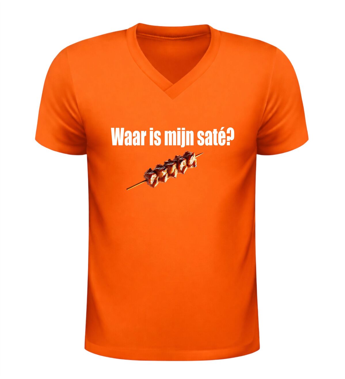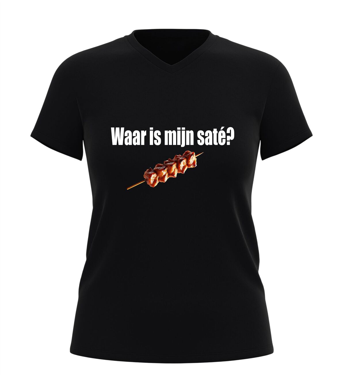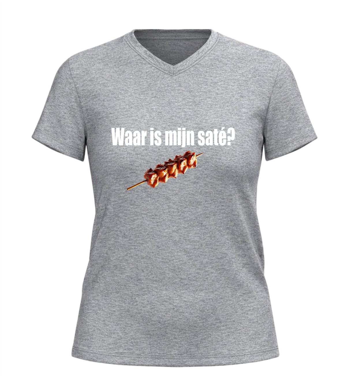 Dit V-hals T-shirt met de tekst Waar is mijn saté? en een duidelijke saté-afbeelding is perfect voor iedereen met een grote liefde voor eten, humor en gezelligheid. Saté is niet zomaar eten, het is een begrip, en dat zie je meteen terug in dit grappige shirt. De combinatie van de herkenbare tekst en de afbeelding van een saté(spies) zorgt voor een humoristische uitstraling die direct de aandacht trekt. Dit maakt het shirt ideaal voor mensen die houden van eten, barbecueën, festivals en een goede dosis zelfspot.