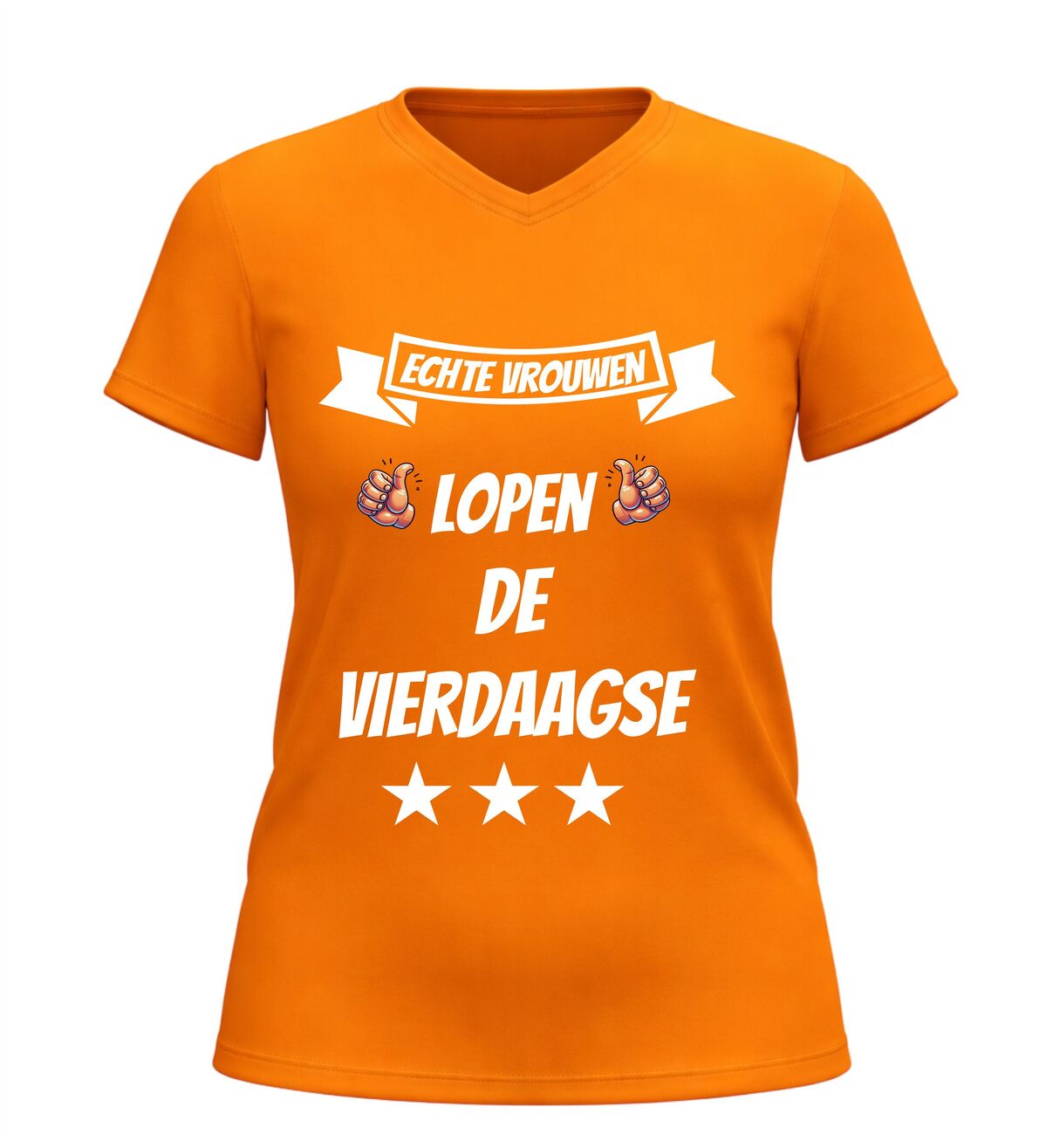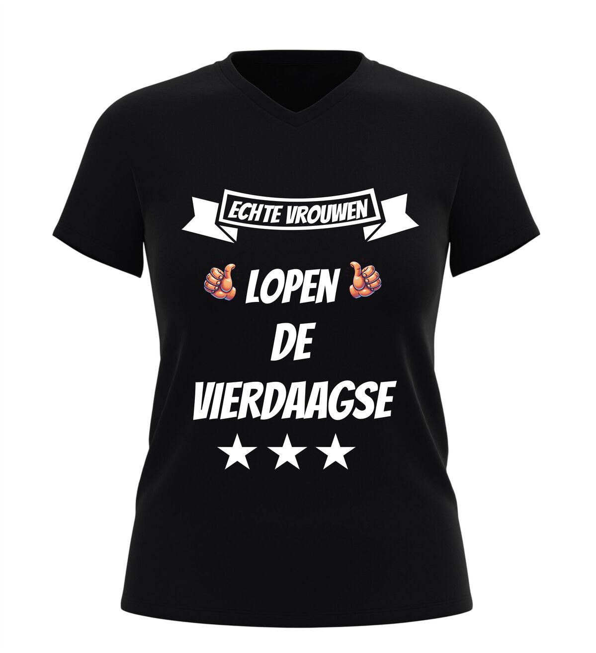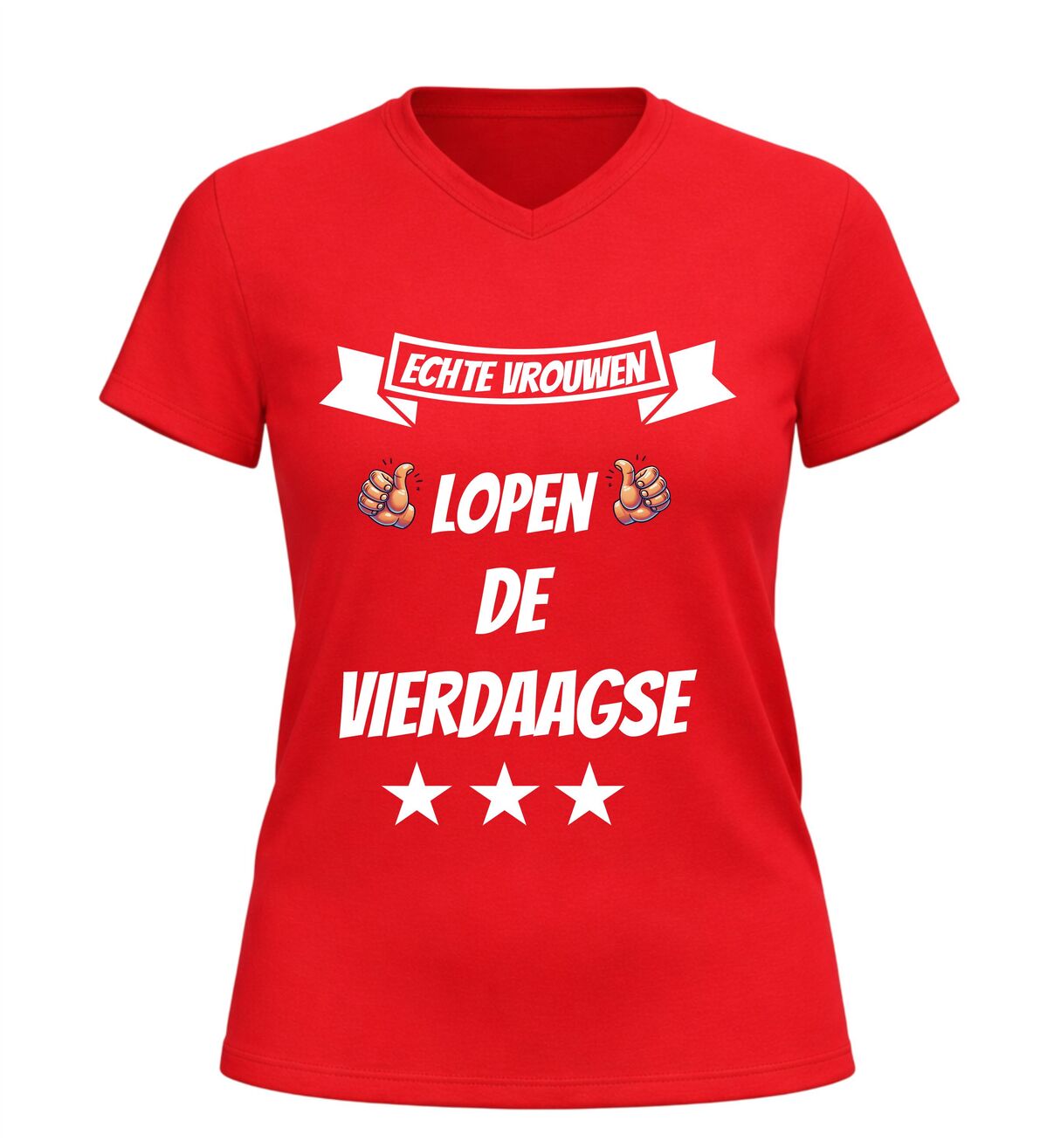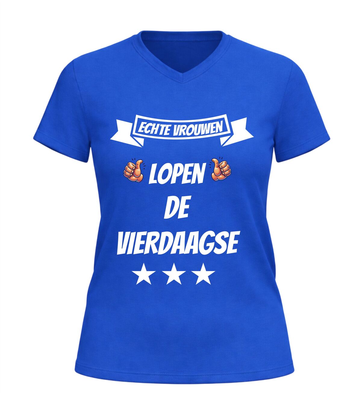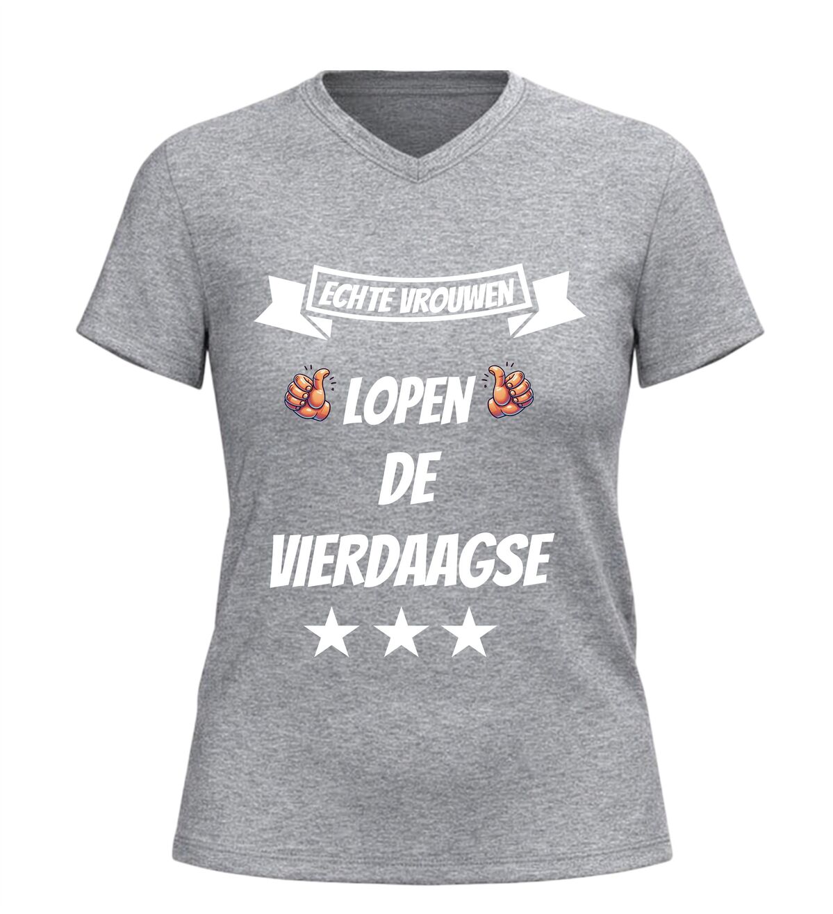 De Nijmeegse Vierdaagse is meer dan alleen wandelen. Het is doorzettingsvermogen, kracht en trots. Met dit dames V-hals t-shirt met de tekst echte vrouwen lopen de vierdaagse laat je zien dat jij precies weet wat dat betekent. Dit Vierdaagse shirt is gemaakt voor vrouwen die niet opgeven en die vier dagen lang laten zien wat ze kunnen.