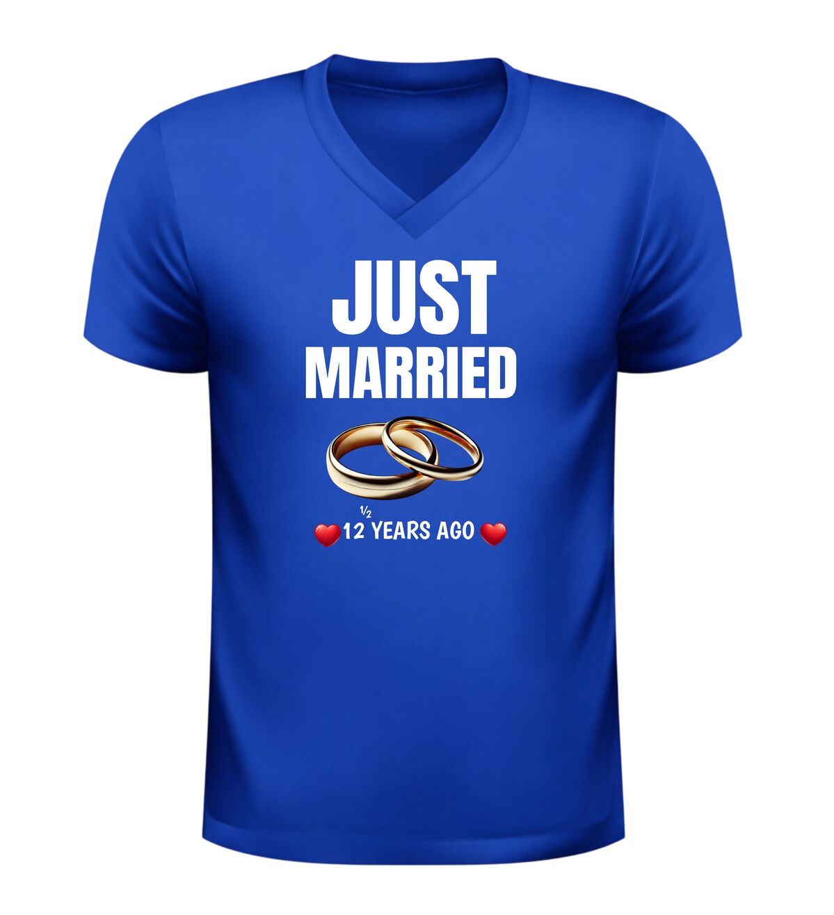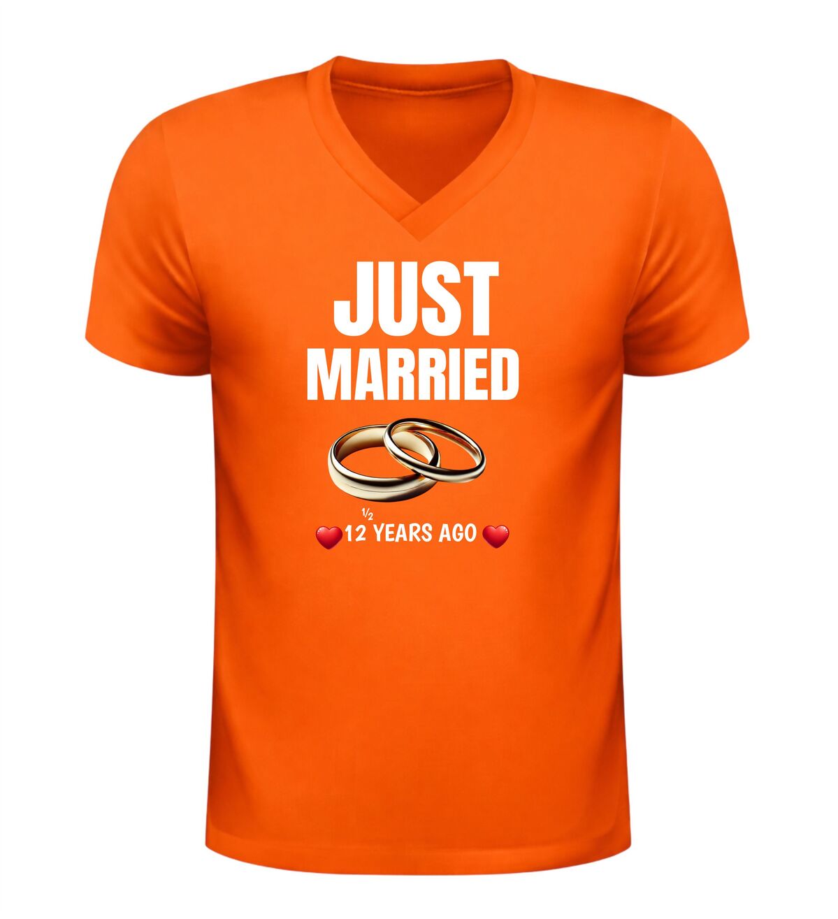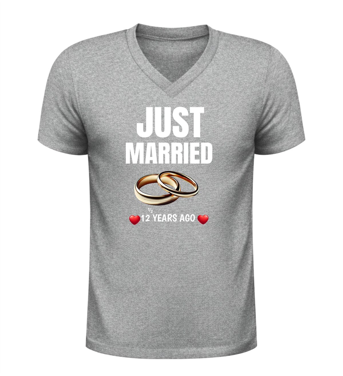 Dit V-hals T-shirt met de tekst: just married 12 and a half years ago en pas getrouwd twaalf en half jaar geleden is het perfecte shirt voor een 12,5 jarig huwelijksjubileum. De koperen bruiloft is een bijzondere mijlpaal en met dit grappige 12,5 jaar getrouwd shirt vier je deze dag op een originele en luchtige manier. Ideaal om te dragen tijdens een jubileumfeest, diner of feestelijke bijeenkomst met familie en vrienden.