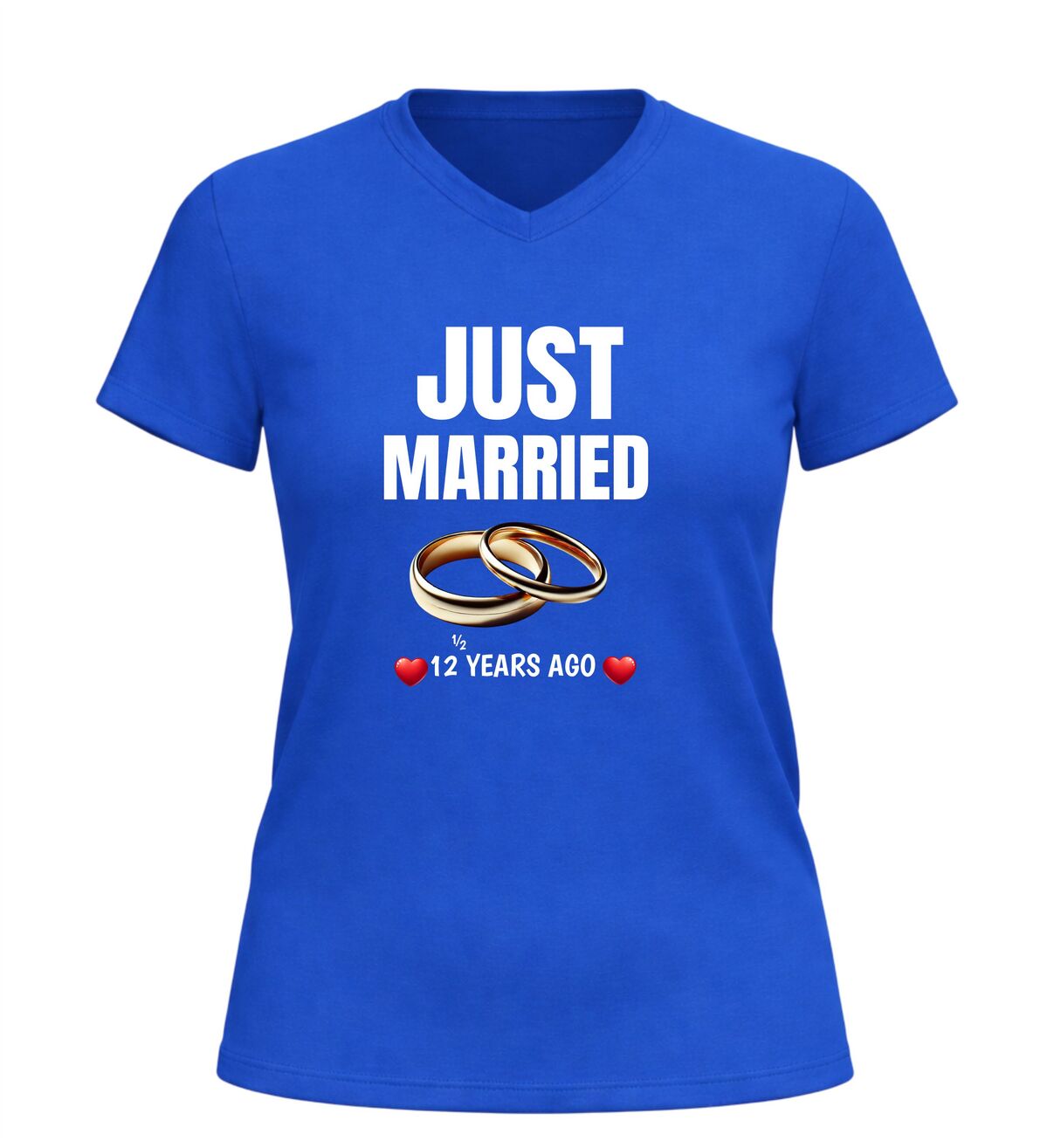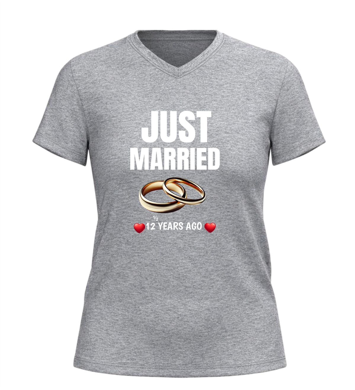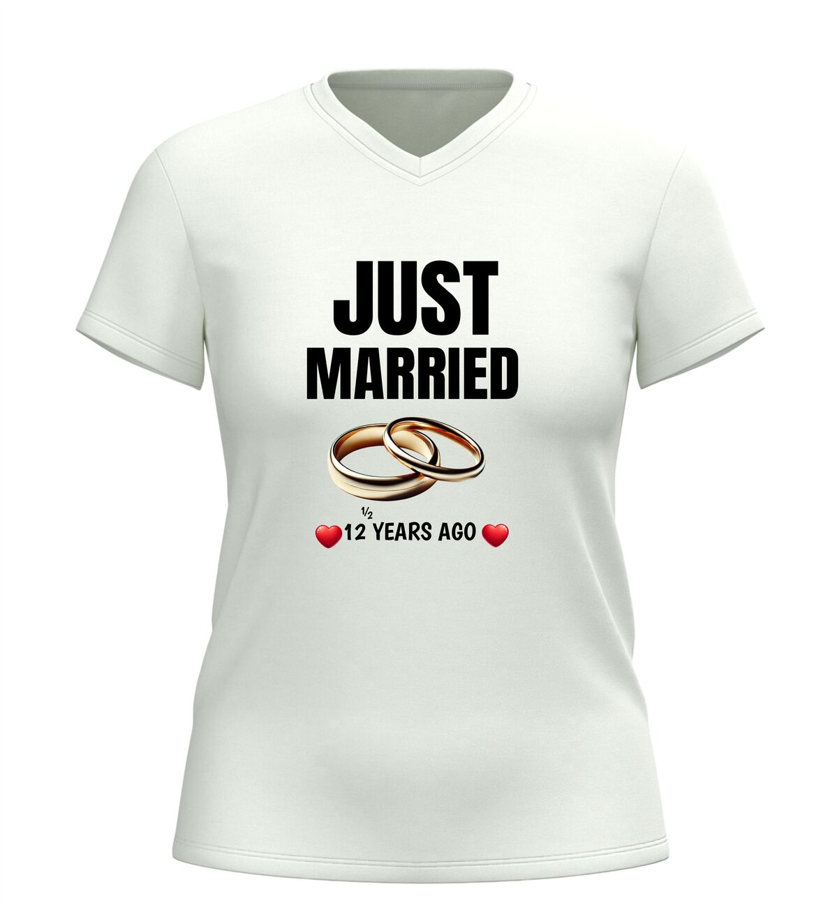 Dit V-hals T-shirt met de tekst: just married 12 and a half years ago en pas getrouwd twaalf en half jaar geleden is het perfecte shirt voor een 12,5 jarig huwelijksjubileum. De koperen bruiloft is een bijzondere mijlpaal en met dit grappige 12,5 jaar getrouwd shirt vier je deze dag op een originele en luchtige manier. Ideaal om te dragen tijdens een jubileumfeest, diner of feestelijke bijeenkomst met familie en vrienden.