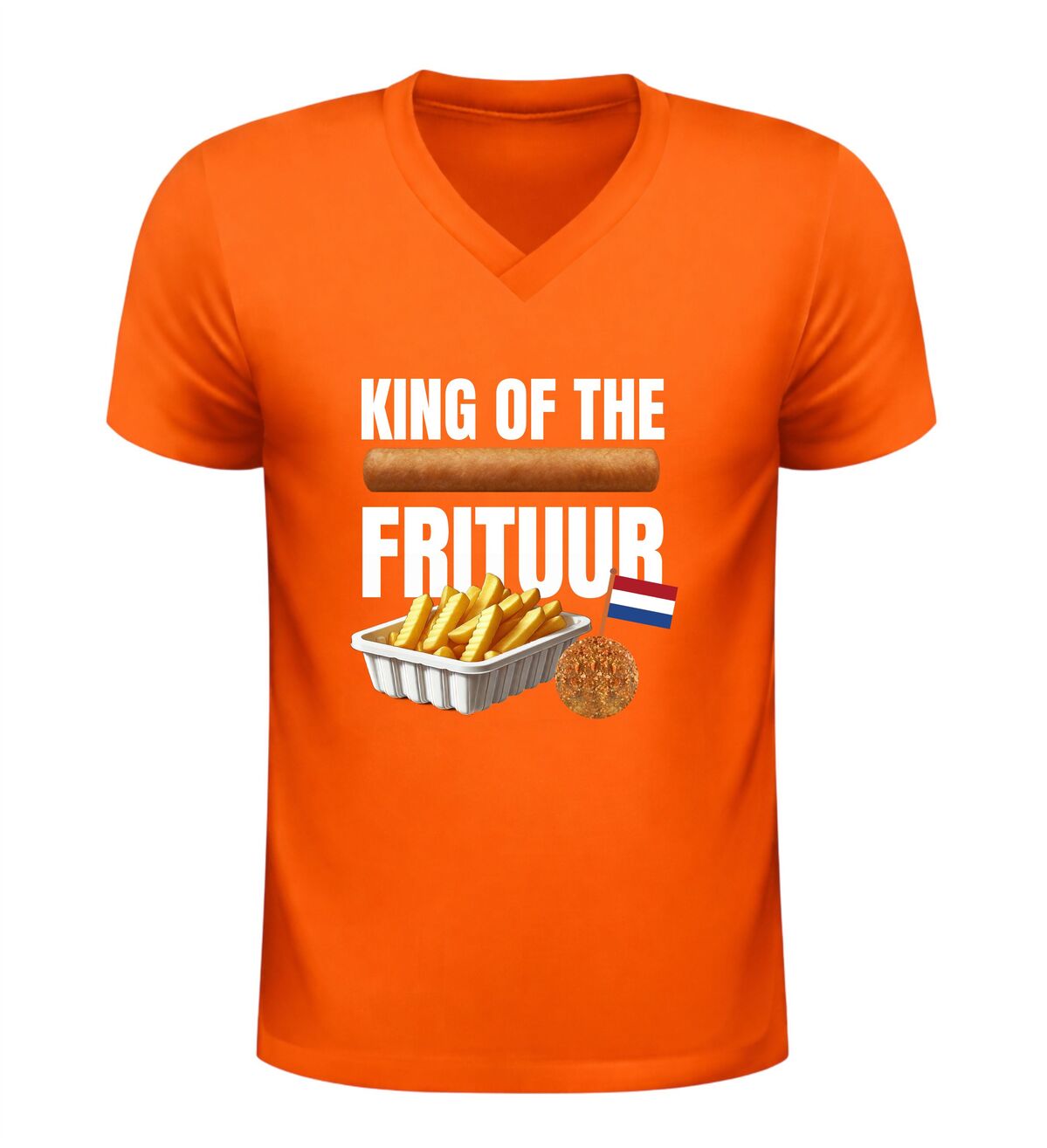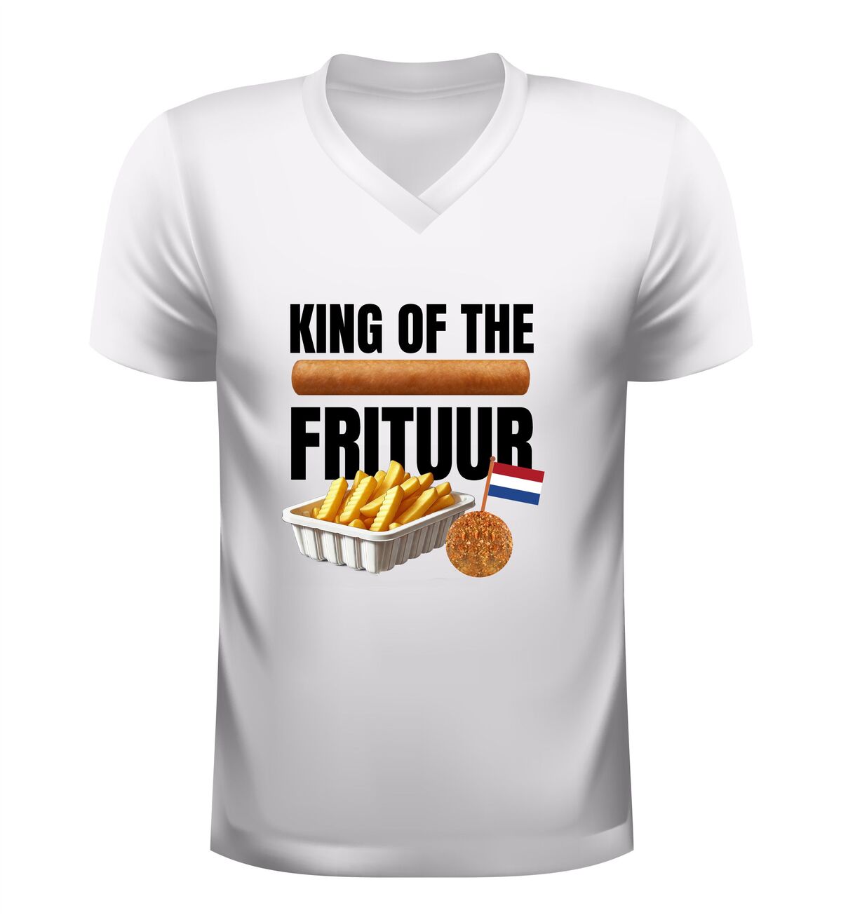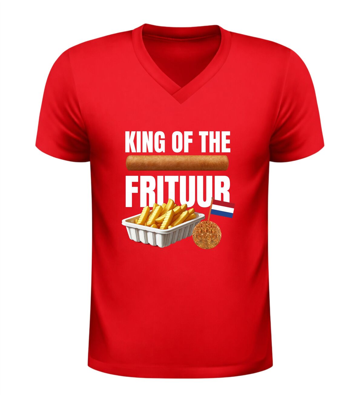 Dit V-hals T-shirt Koning Frituur is gemaakt voor echte liefhebbers van friet en snacks. Met de opvallende afbeelding van een bakje friet, een frikandel en een bitterbal straalt dit shirt pure snacktrots uit. Perfect voor iedereen die zichzelf met een knipoog tot koning van de frituur verklaart en dat graag laat zien tijdens feestelijke momenten. Dit shirt is ideaal voor carnaval, festivals, borrels en feestavonden en is een laagdrempelig alternatief voor een verkleedpak, terwijl je toch volledig in thema bent.