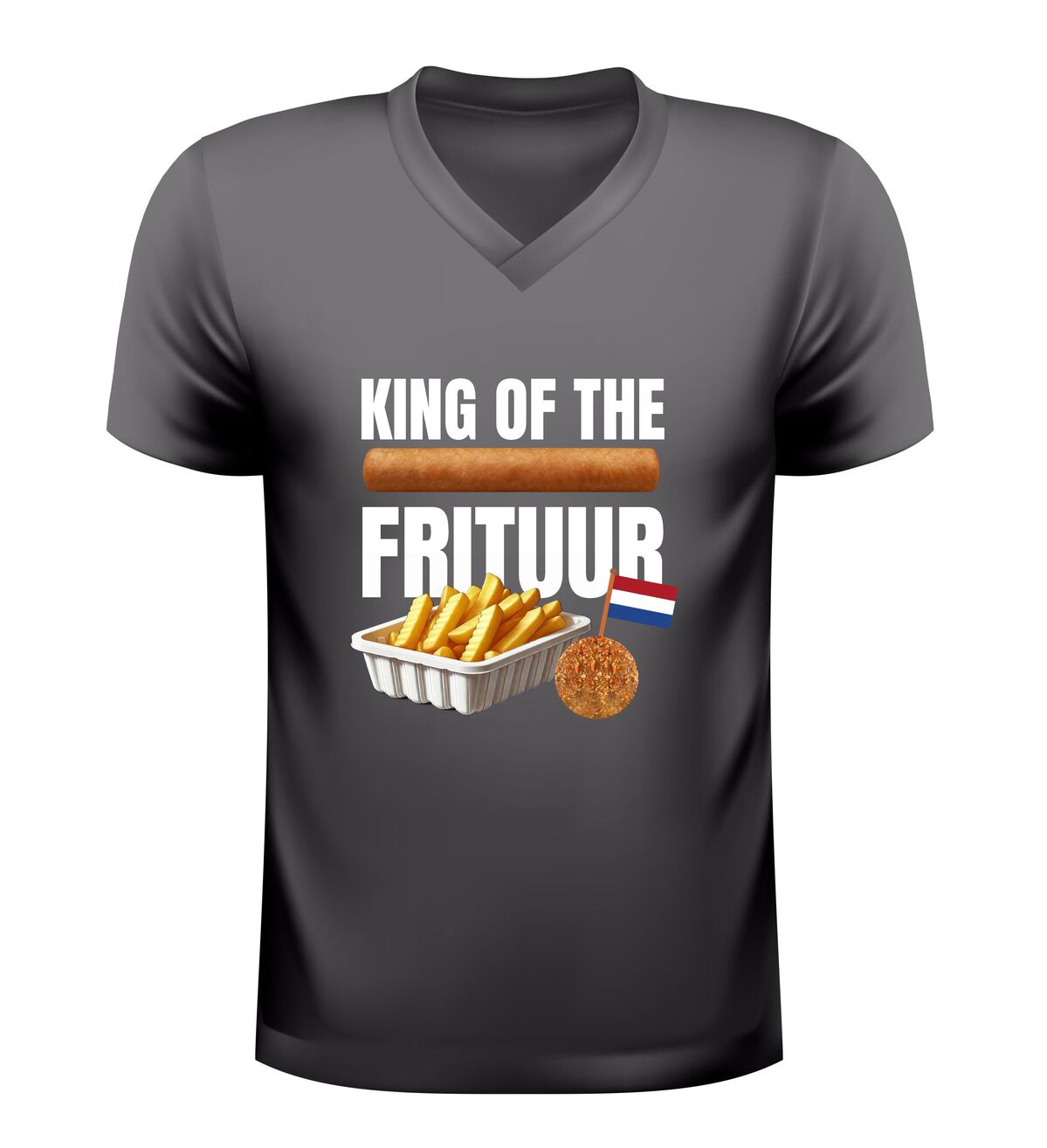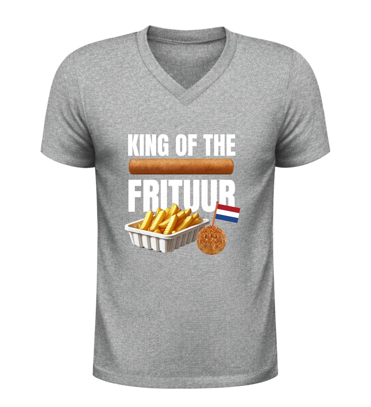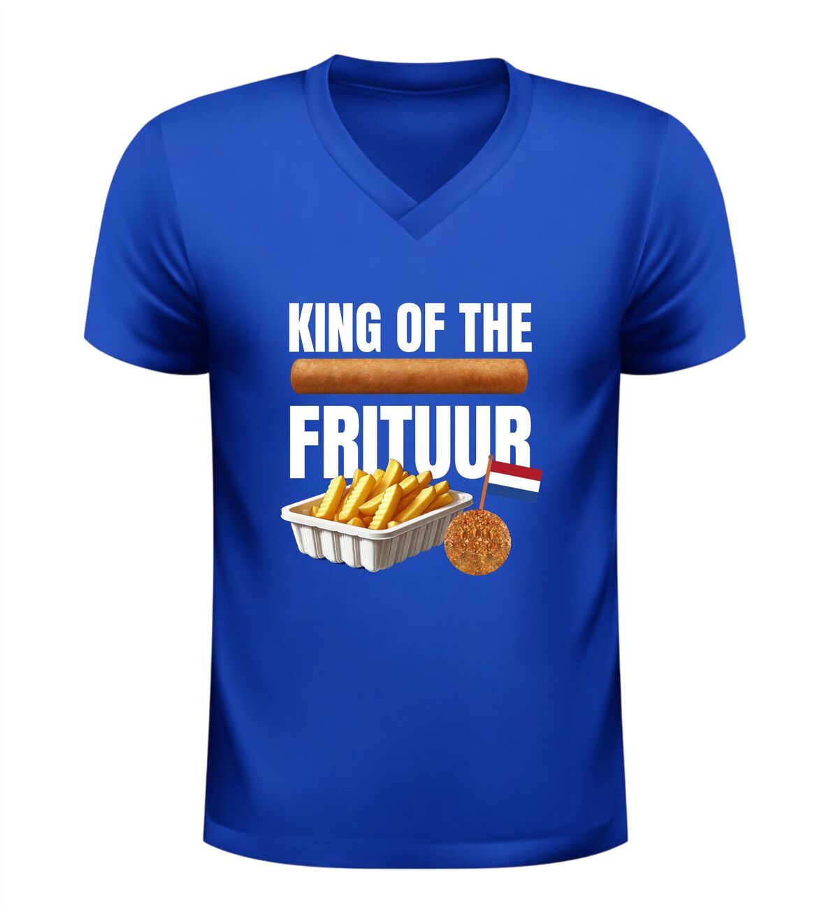 Dit V-hals T-shirt Koning Frituur is gemaakt voor echte liefhebbers van friet en snacks. Met de opvallende afbeelding van een bakje friet, een frikandel en een bitterbal straalt dit shirt pure snacktrots uit. Perfect voor iedereen die zichzelf met een knipoog tot koning van de frituur verklaart en dat graag laat zien tijdens feestelijke momenten. Dit shirt is ideaal voor carnaval, festivals, borrels en feestavonden en is een laagdrempelig alternatief voor een verkleedpak, terwijl je toch volledig in thema bent.