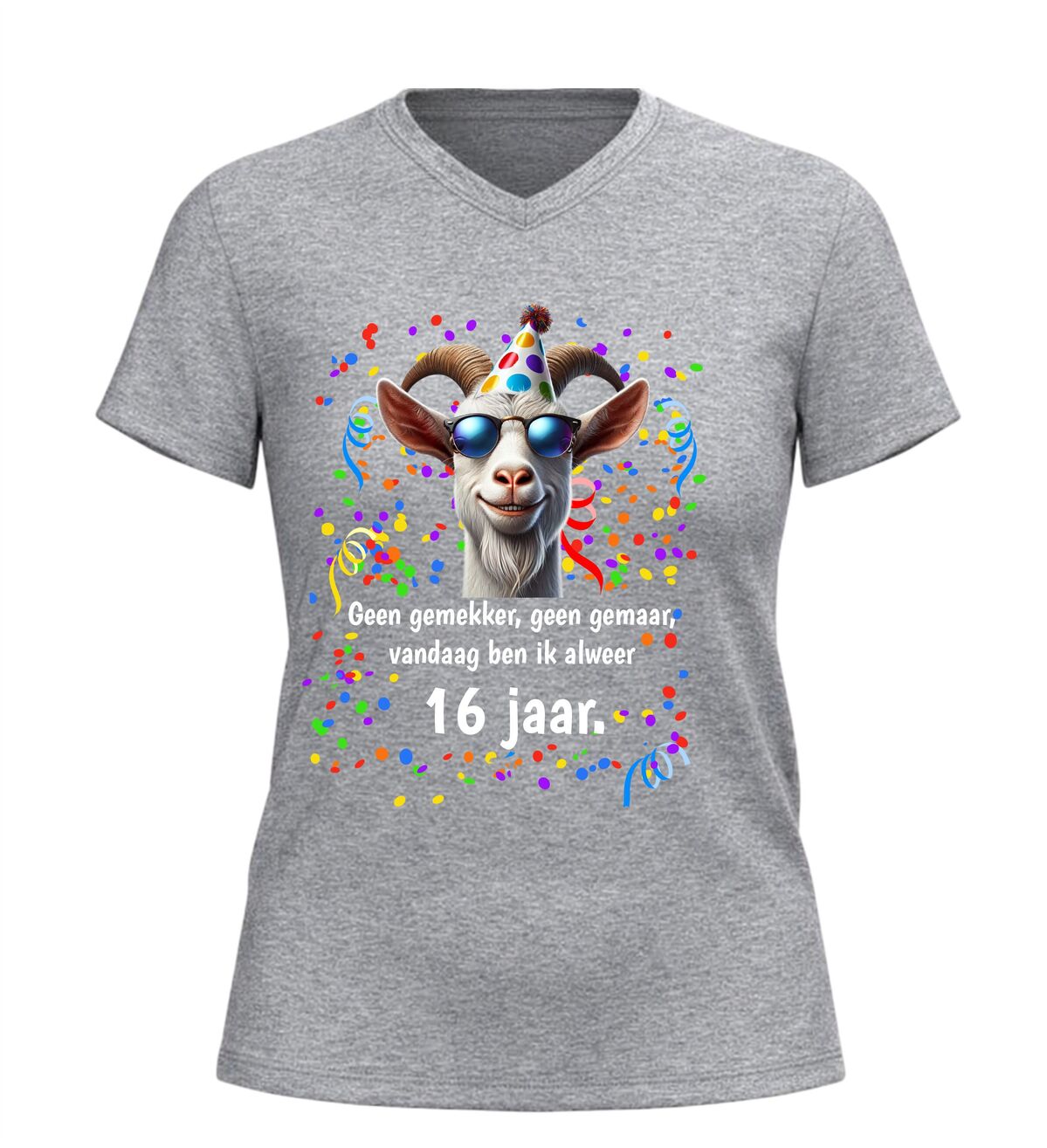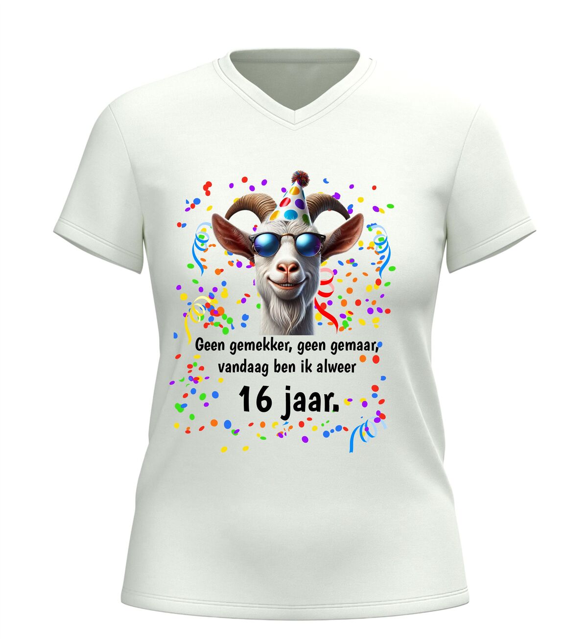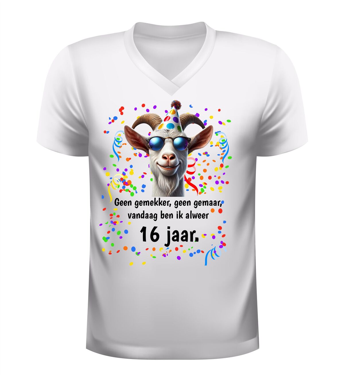 Ben je op zoek naar een grappig 16 jaar verjaardag shirt, een origineel cadeau voor een 16e verjaardag of een uniek V-hals T-shirt met humor? Dan is dit geen gemekker geen gemaar shirt met geit print de perfecte keuze. Een vrolijk en opvallend verjaardag shirt waarmee je zonder gemekker en gemaar laat zien dat jij alweer 16 jaar bent.