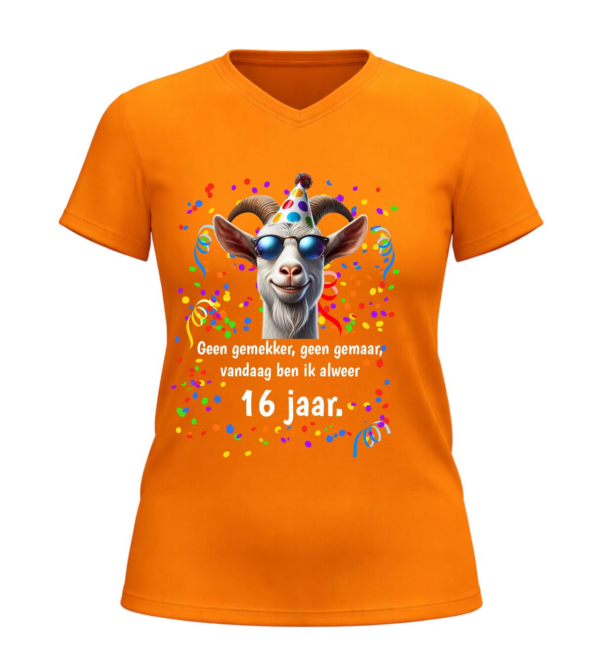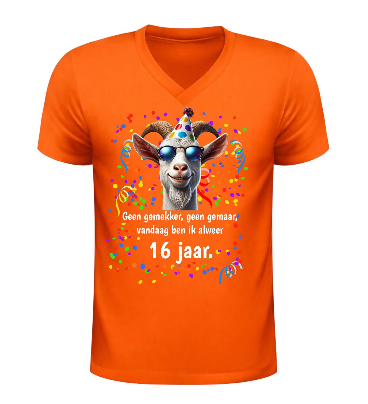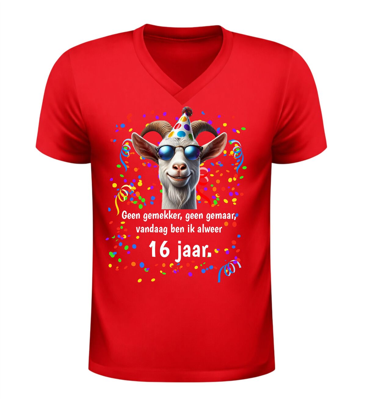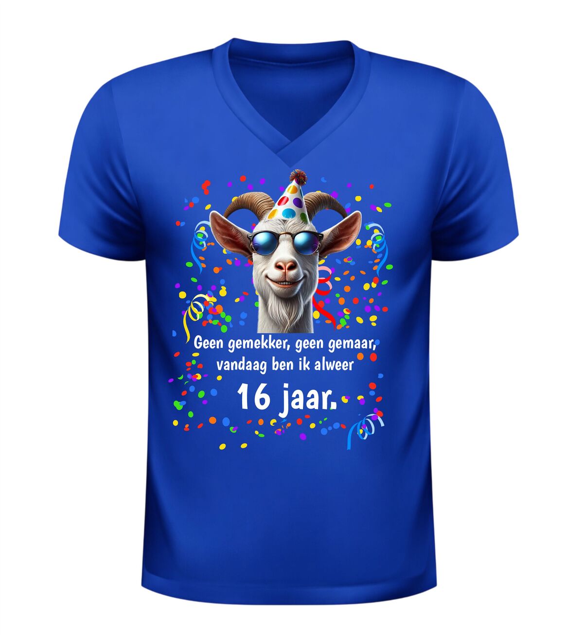 Ben je op zoek naar een grappig 16 jaar verjaardag shirt, een origineel cadeau voor een 16e verjaardag of een uniek V-hals T-shirt met humor? Dan is dit geen gemekker geen gemaar shirt met geit print de perfecte keuze. Een vrolijk en opvallend verjaardag shirt waarmee je zonder gemekker en gemaar laat zien dat jij alweer 16 jaar bent.