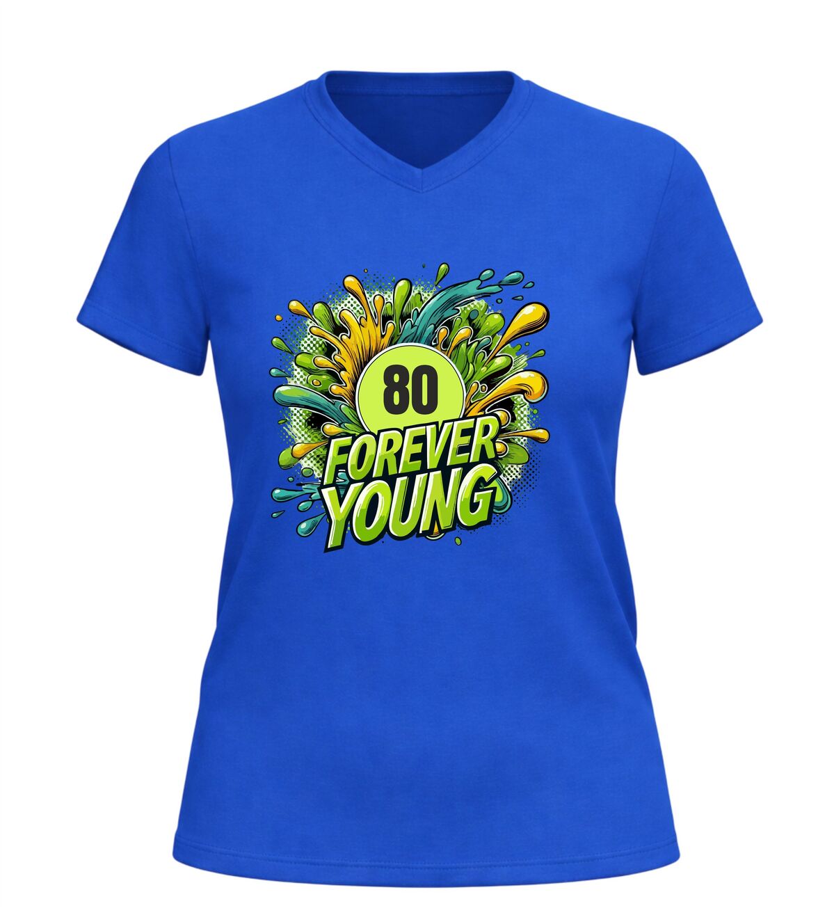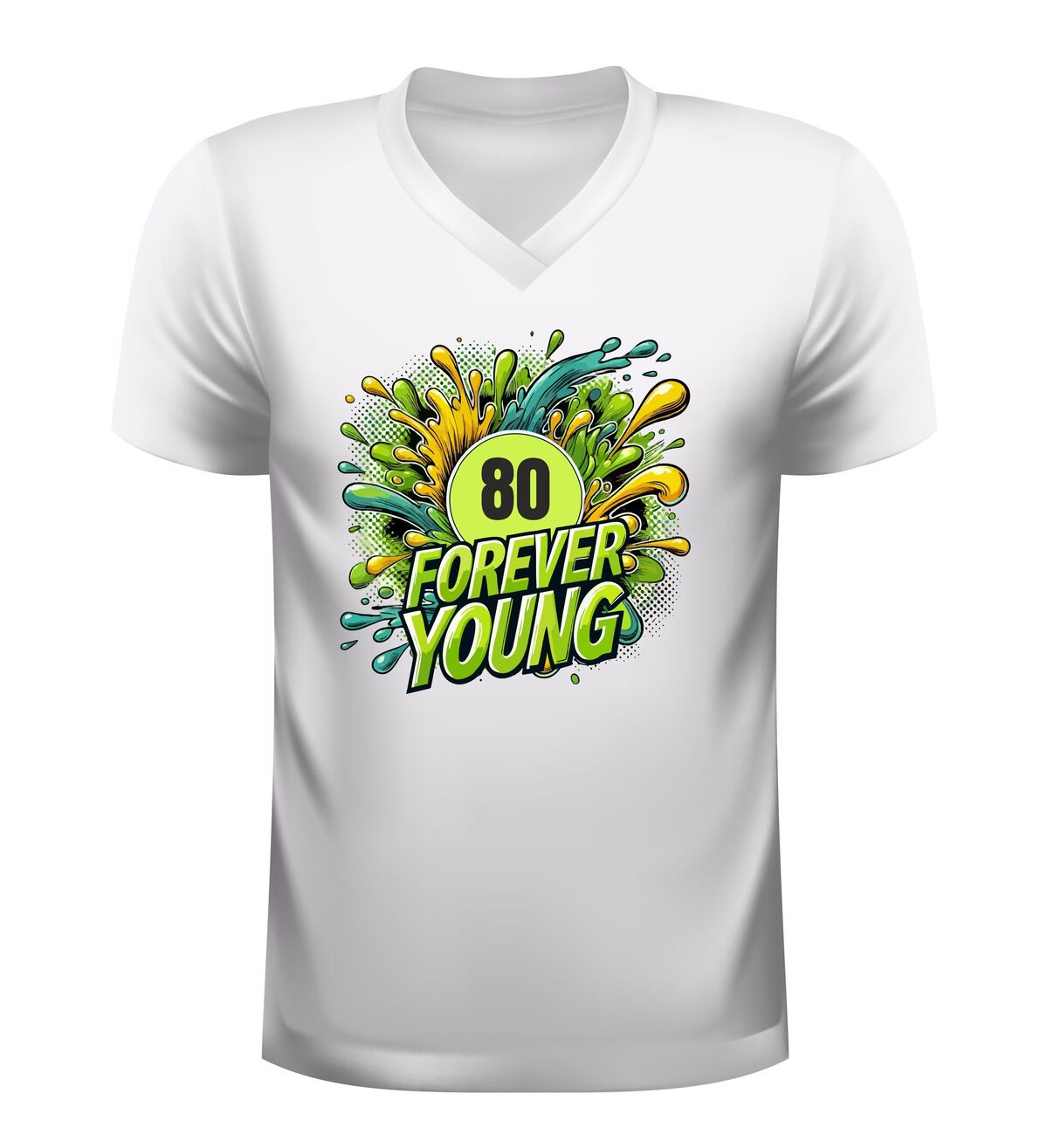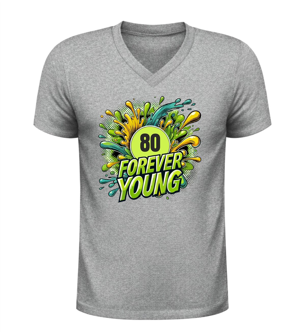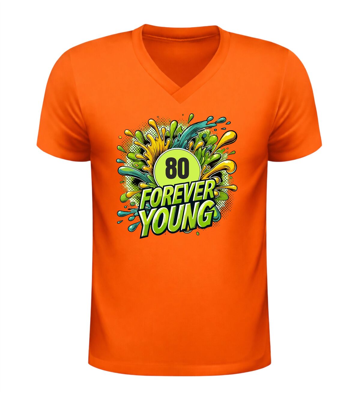 80 jaar worden is iets om trots op te zijn, en dat mag gezien worden. Dit v-hals verjaardag shirt met de tekst forever young en een feestelijke 80 jaar print is perfect voor iedereen die laat zien dat leeftijd geen invloed heeft op levenslust en humor. Het shirt straalt vrolijkheid uit en past perfect bij een feestelijke verjaardag, een gezellig familiefeest of een bijzonder jubileummoment.