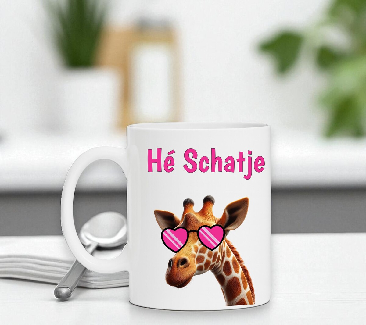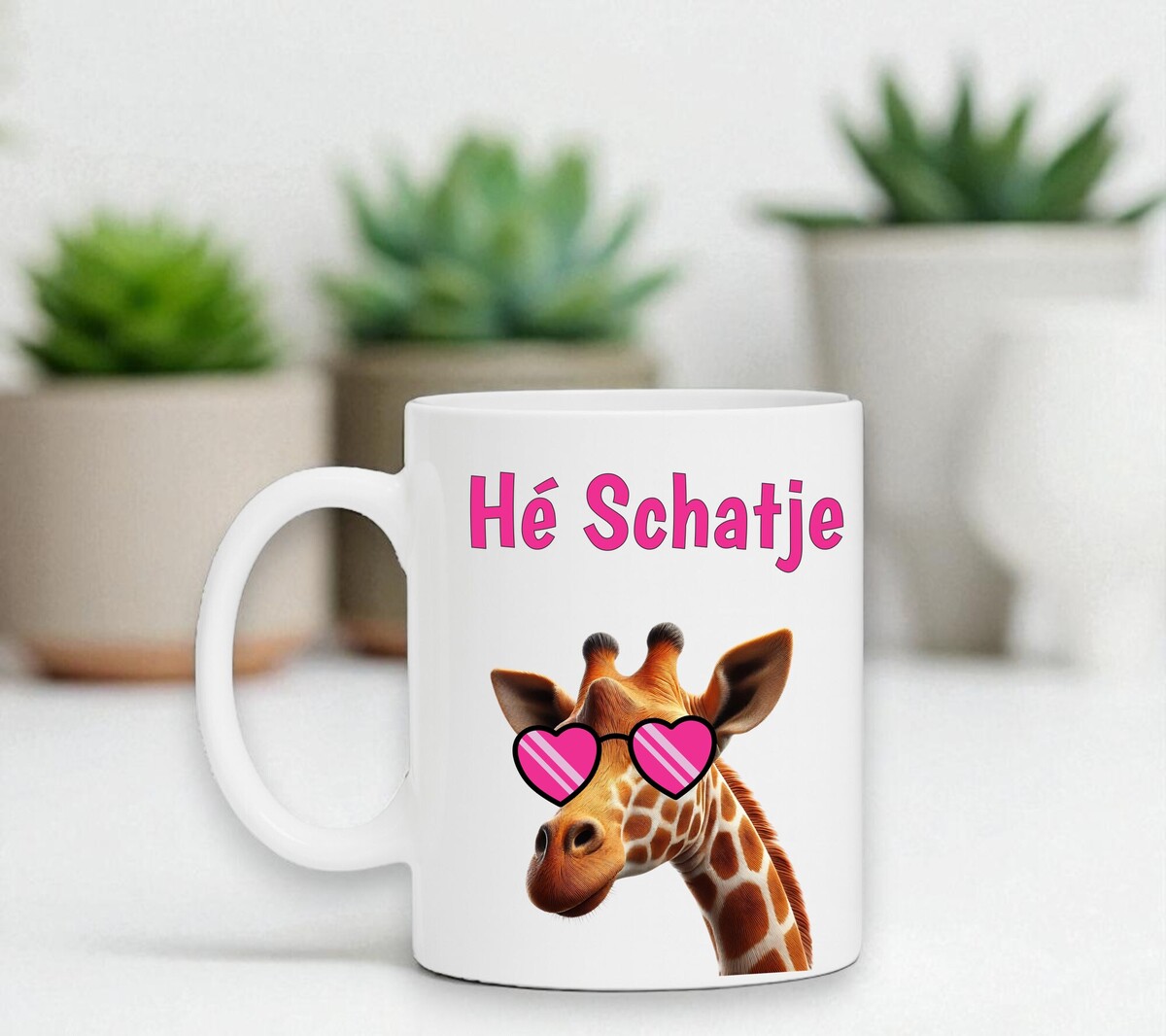 Valentijn mok met de opdruk he schatje. Onder de tekst is een verliefde giraffe gedrukt. De mok is magnetron en vaatwasserbestendig en de witte mok heeft een hoogte van 96mm en een diameter van 80mm.