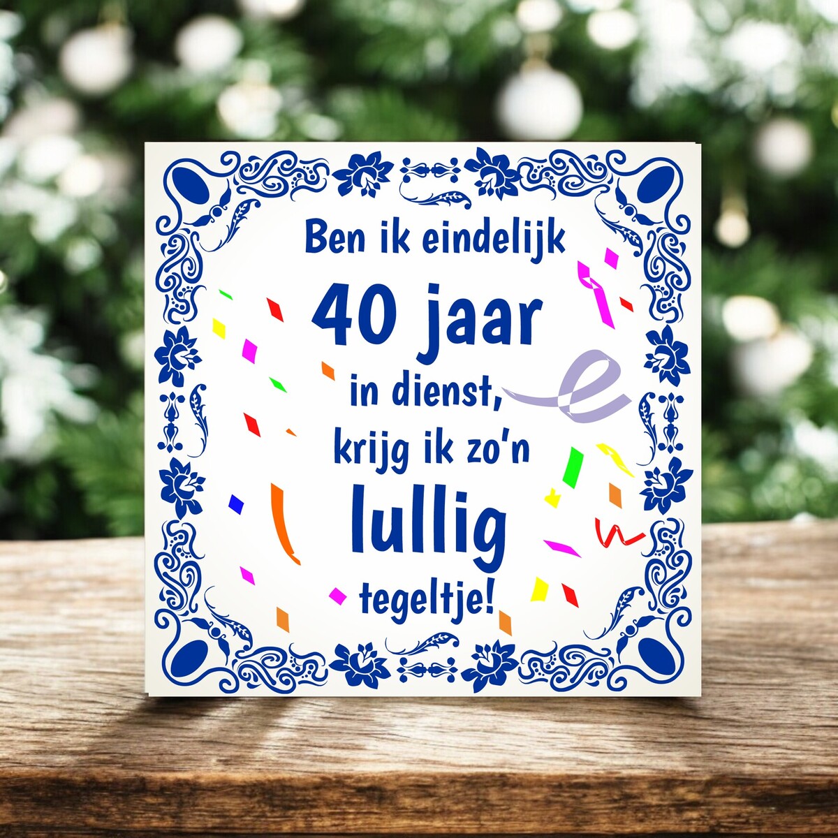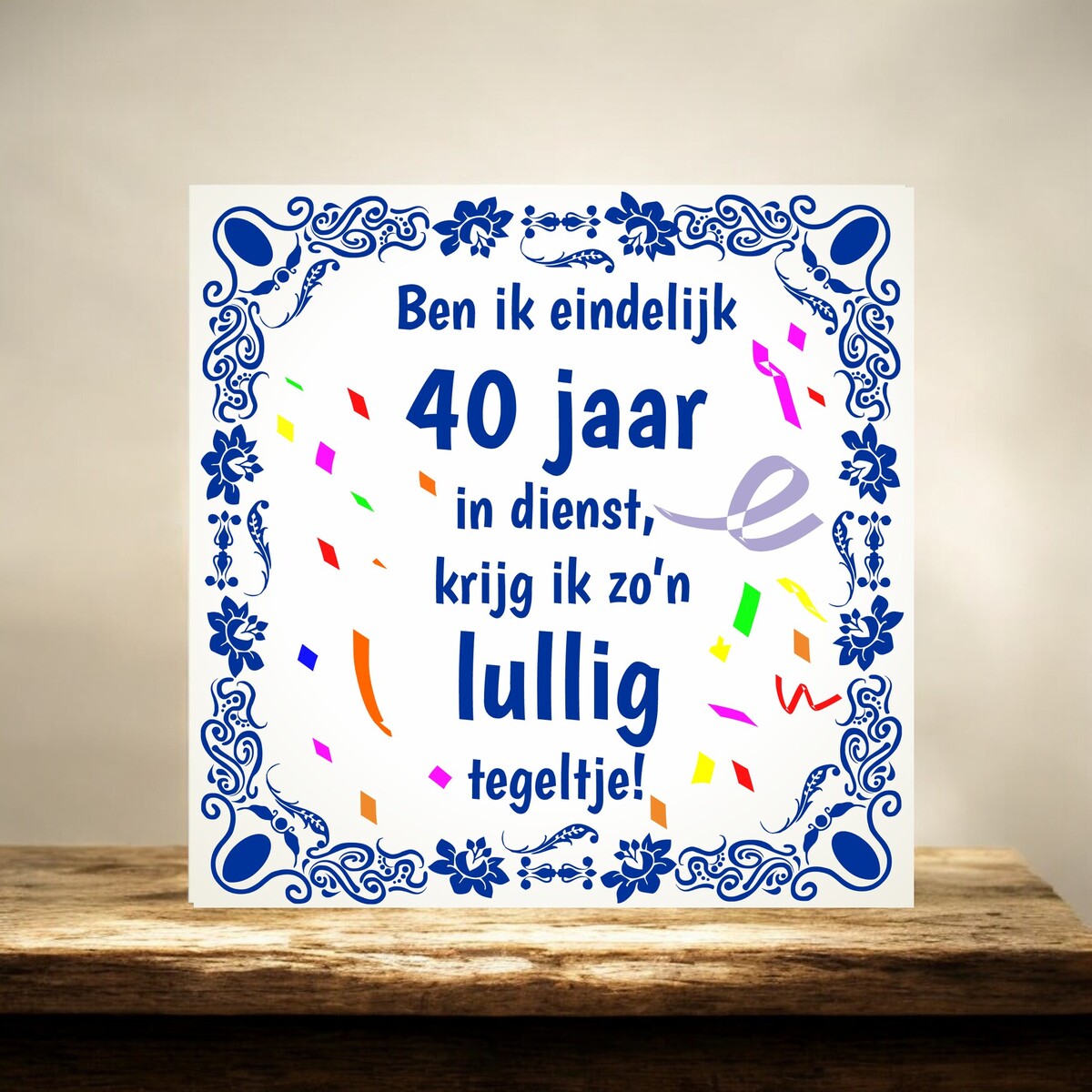 Deze feestelijke tegel met humoristiche spreuk is een leuk cadeau wanneer iemand 40 jaar in dienst is.