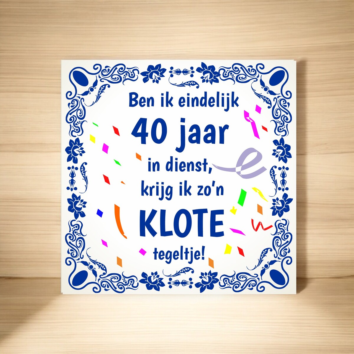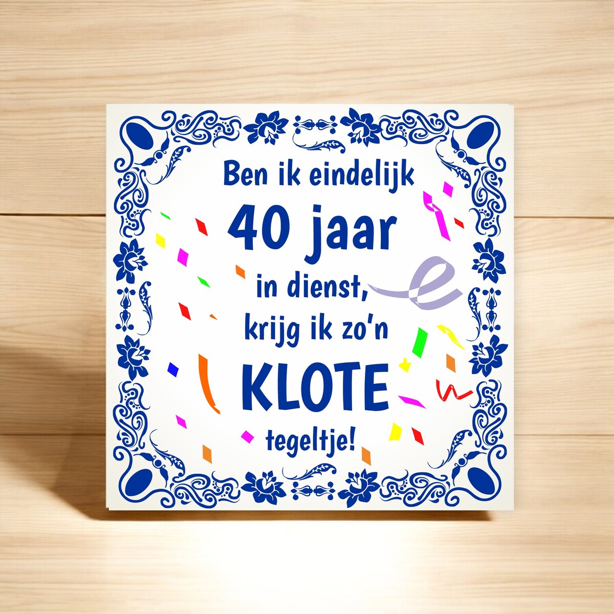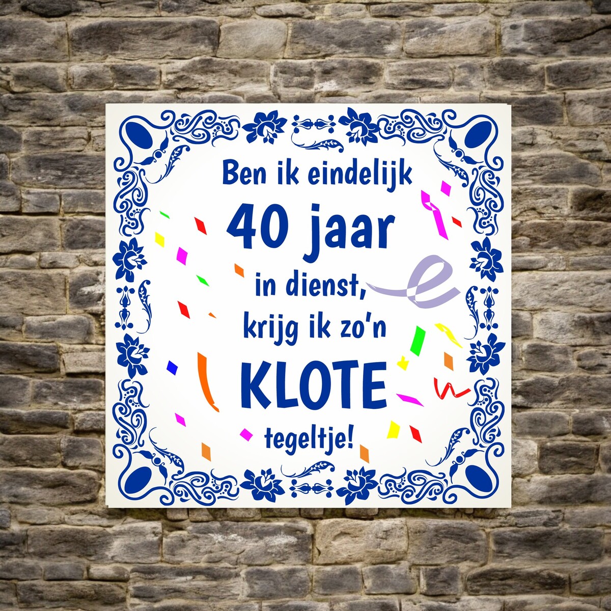 Leuke feestelijke tegel met de tekst: ben ik eindelijk 40 jaar in dienst krijg ik zo'n klote tegeltje.