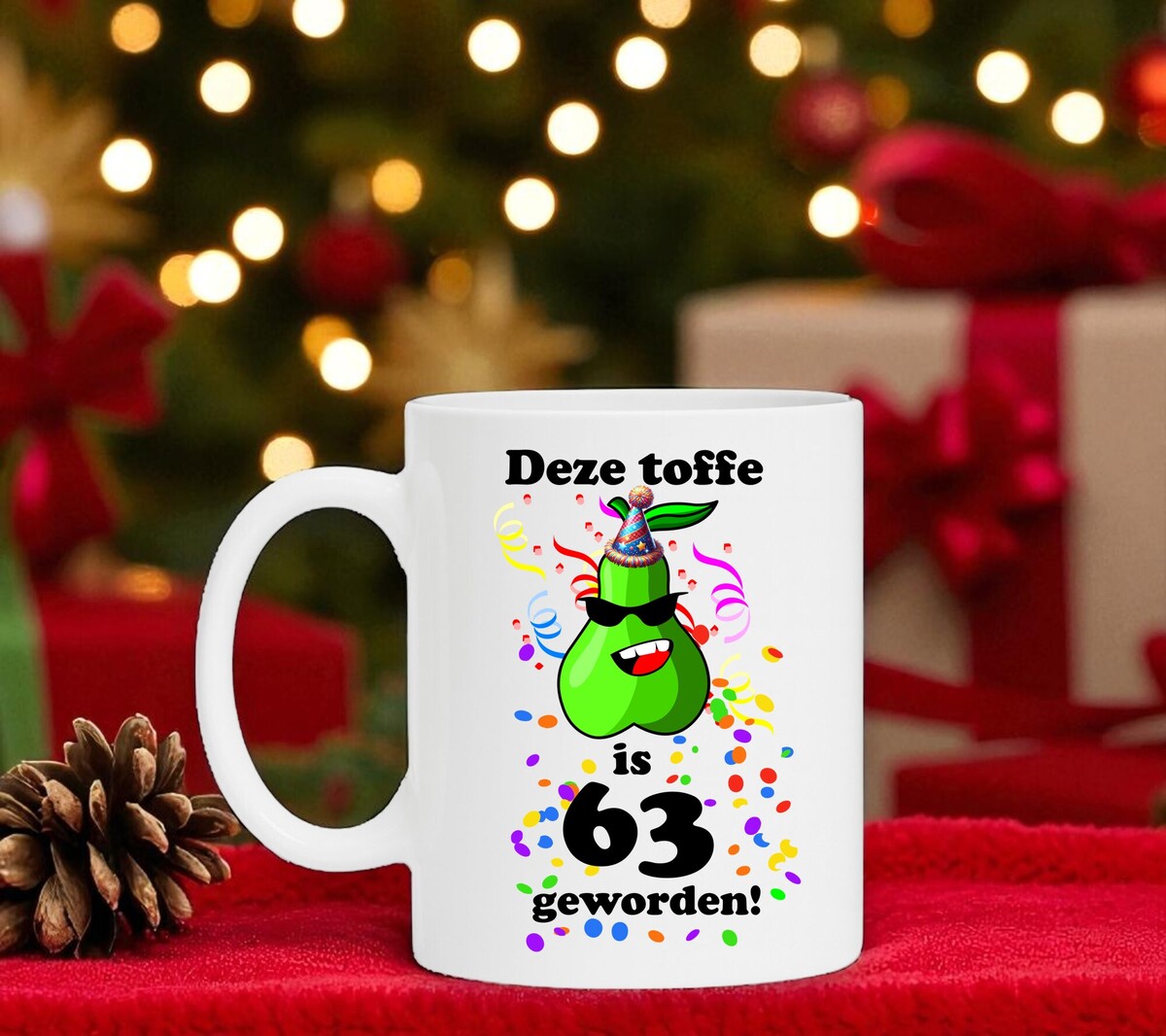 Deze mok is voor een toffe peer die 63 jaar wordt. Een leuk cadeau voor een betaalbare prijs.