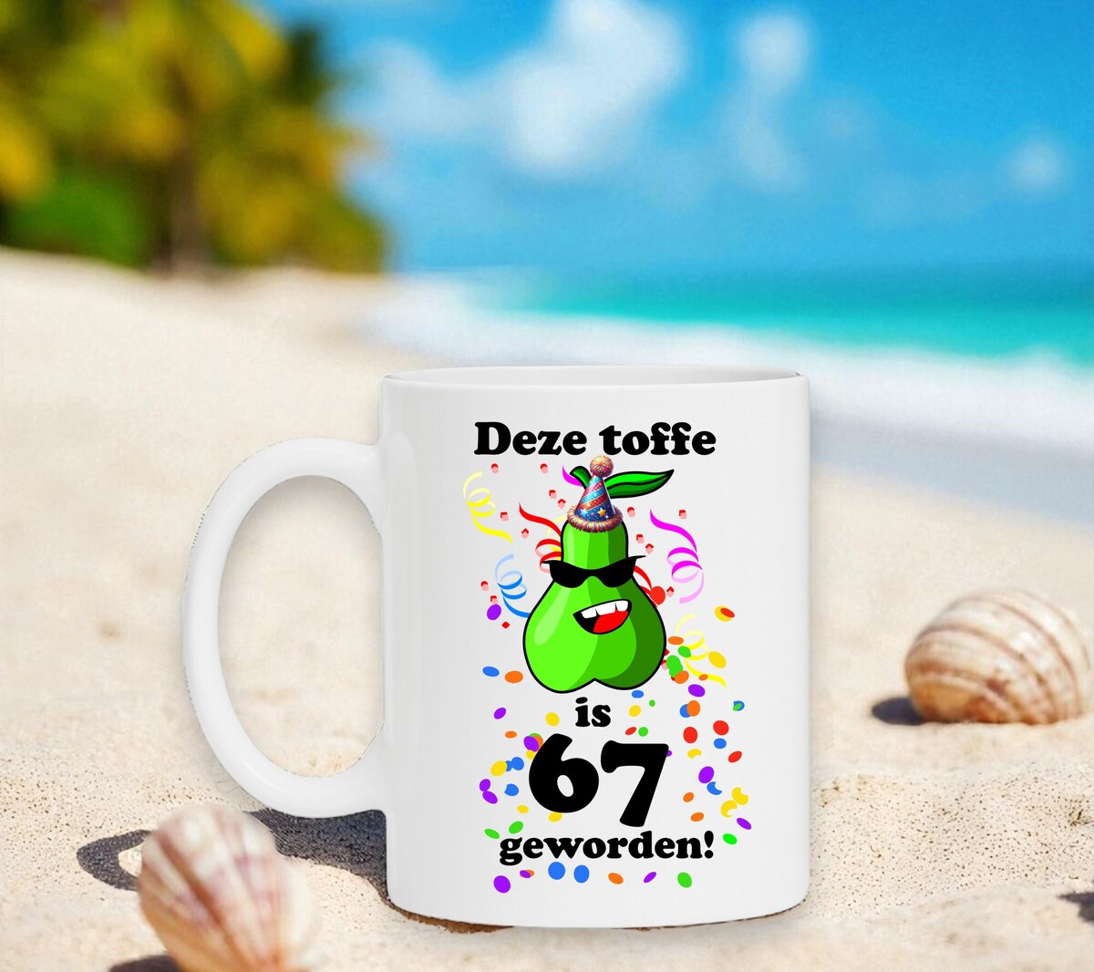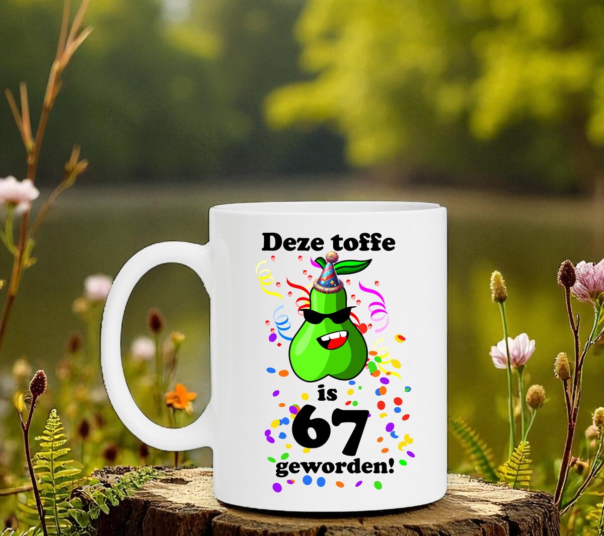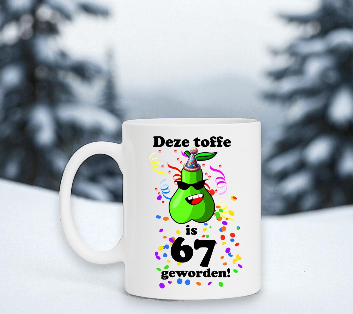 Op deze mok staat de leuke print en tekst: deze toffe peer is 67 geworden.