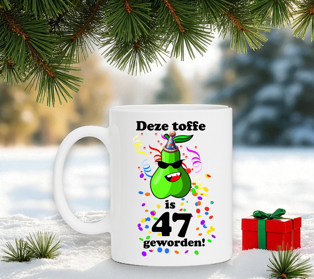 Op zoek na een leuke koffie of thee mok als cadeau voor een 47e verjaardag?. Dan is deze mok met full colour opdruk zeker een aanrader. Op deze mok staat de tekst en print: deze toffe peer is 47 geworden.