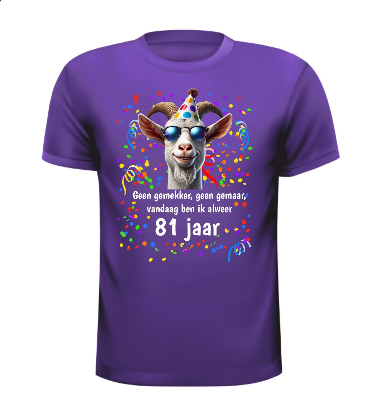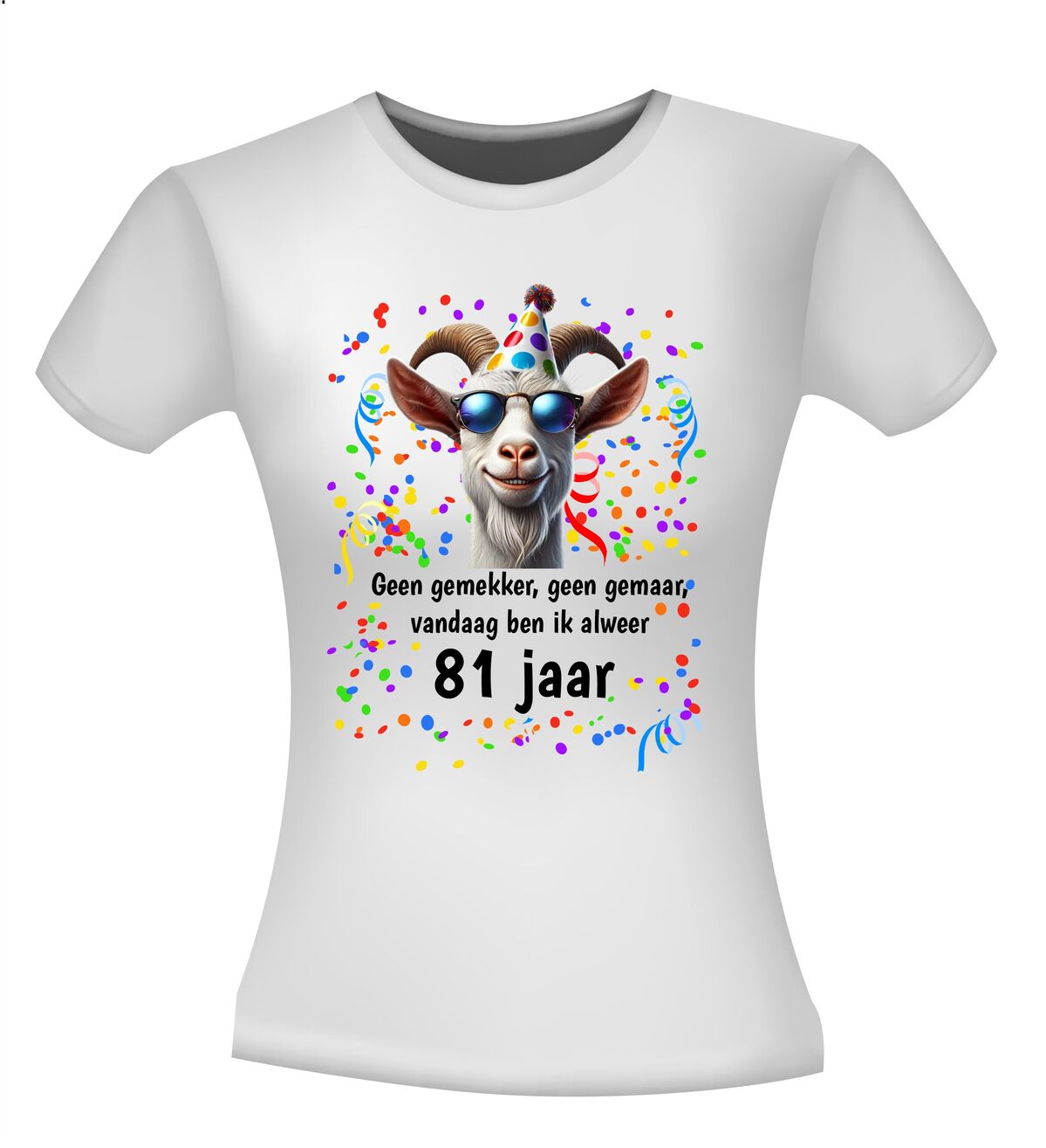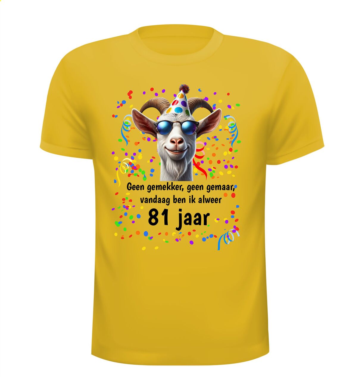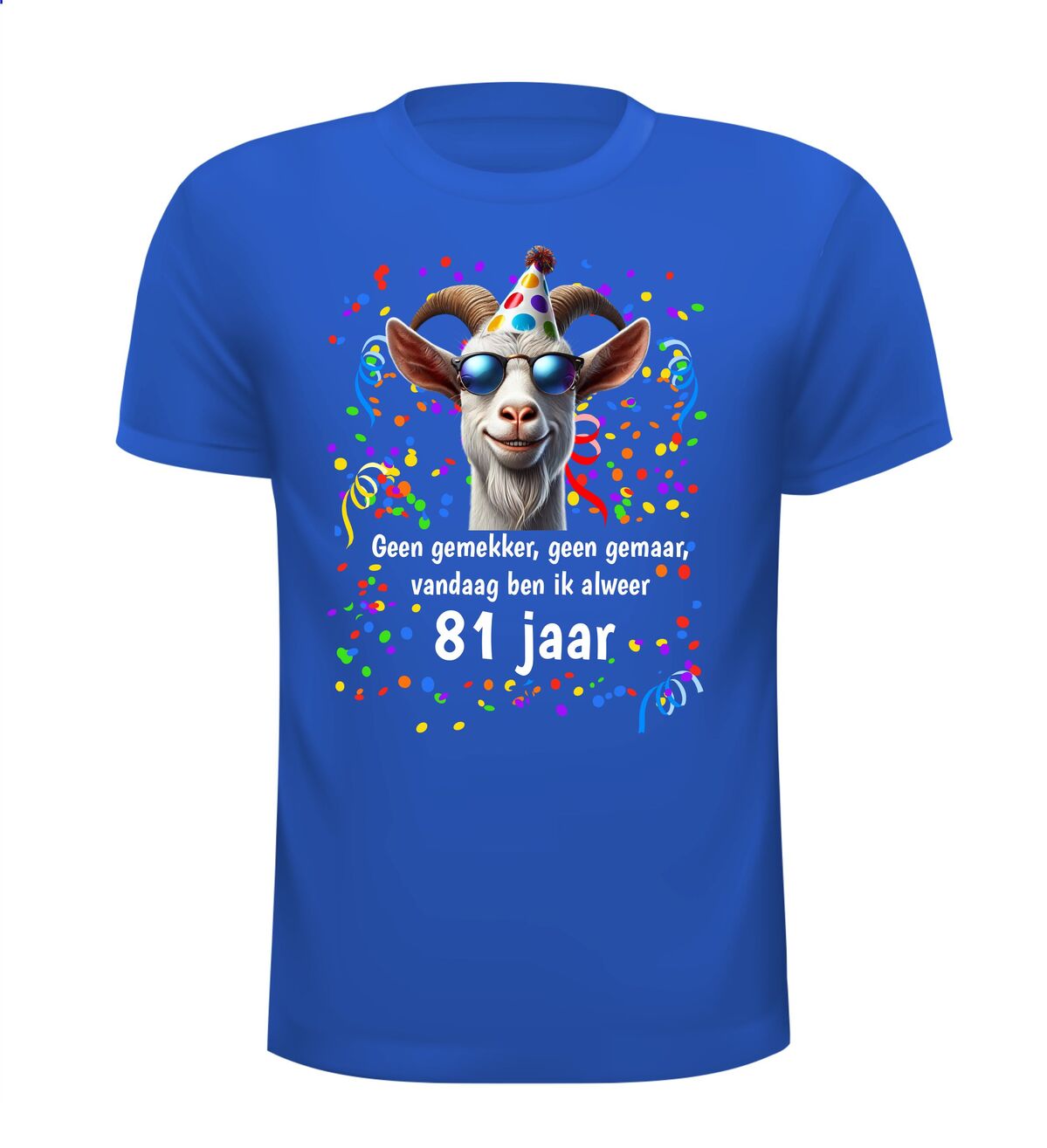 Op dit leuke en orginele verjaardag shirt voor de leeftijd van 81 jaar staat de leuke tekst: Geen gemekker,geen gemaar, vandaag ben ik 81 jaar.