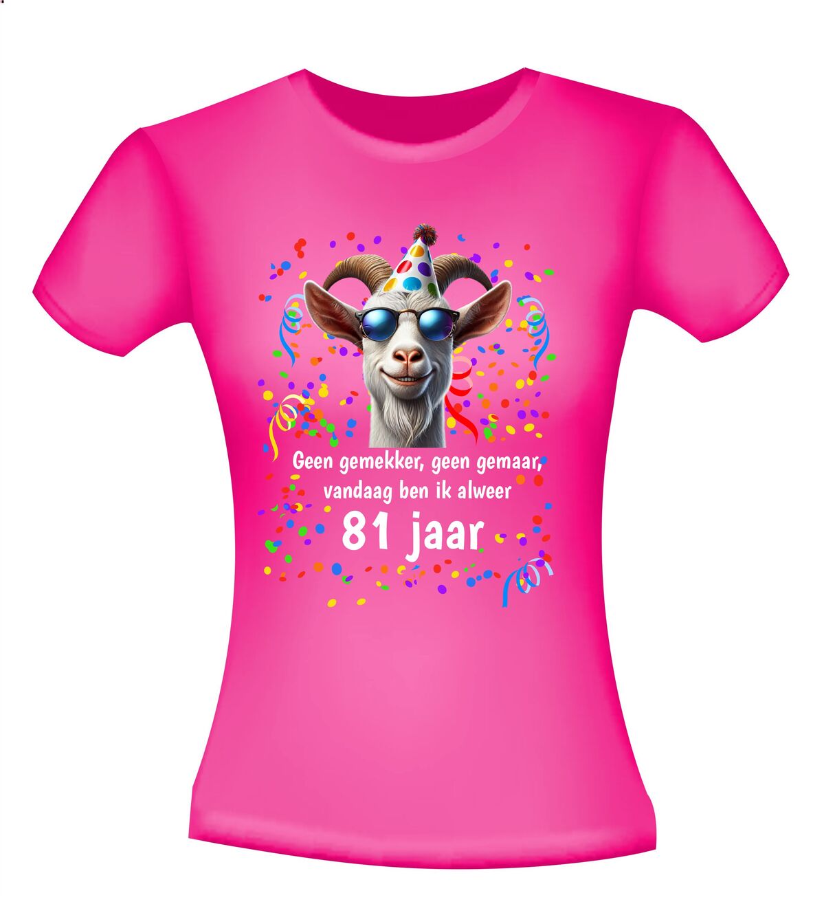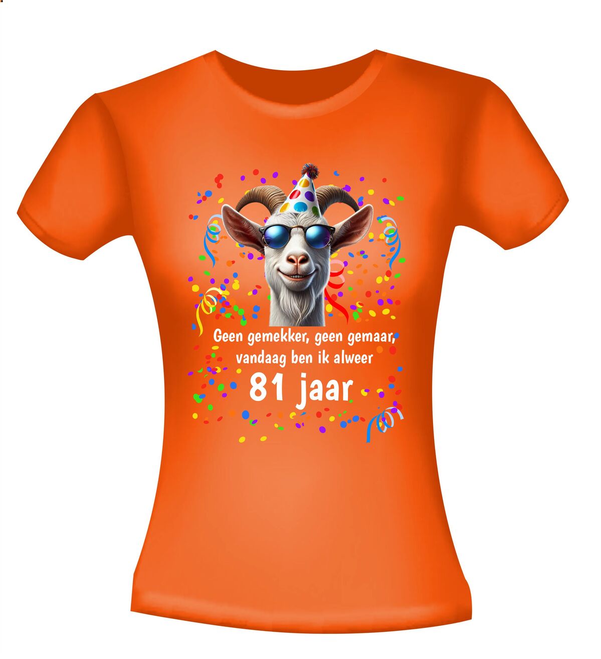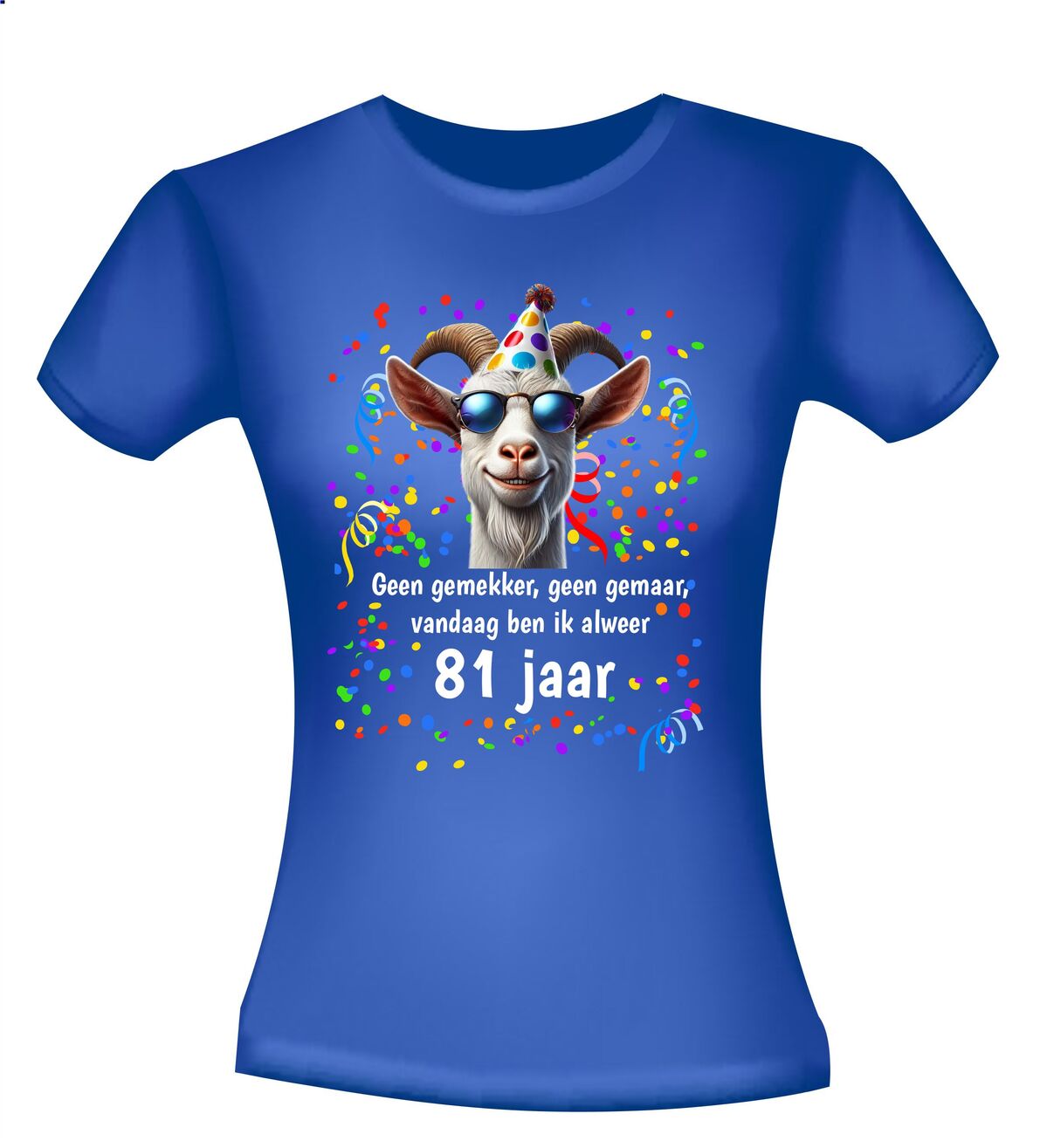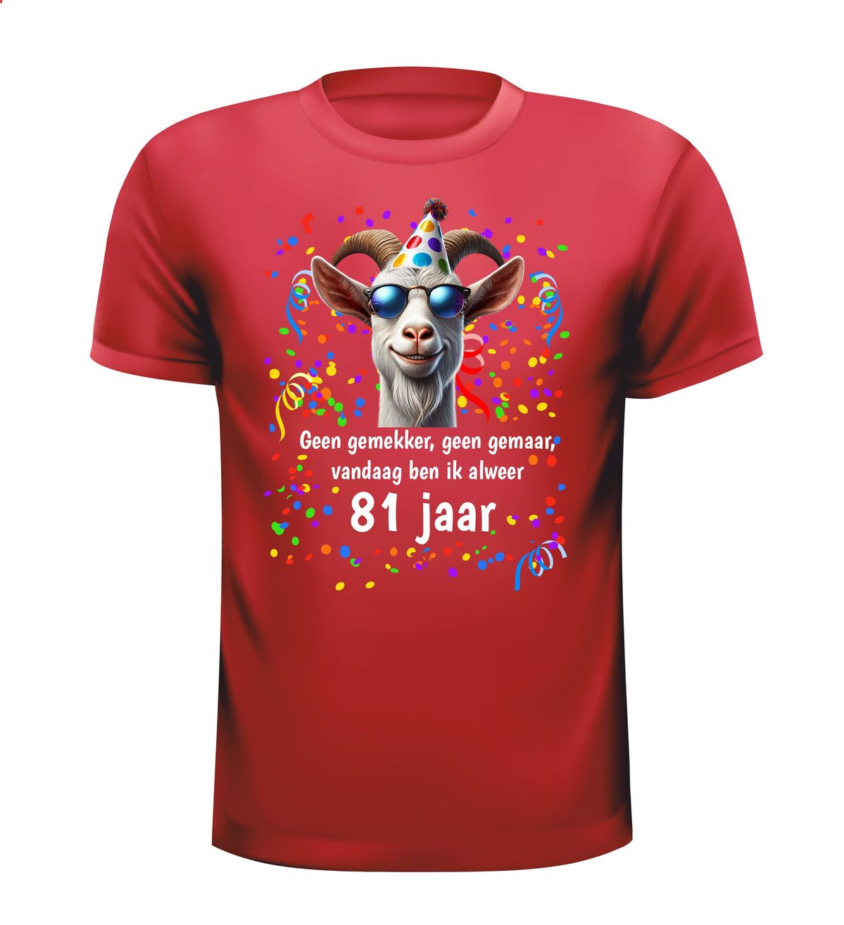 Op dit leuke en orginele verjaardag shirt voor de leeftijd van 81 jaar staat de leuke tekst: Geen gemekker,geen gemaar, vandaag ben ik 81 jaar.