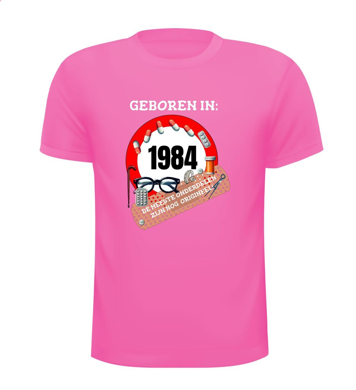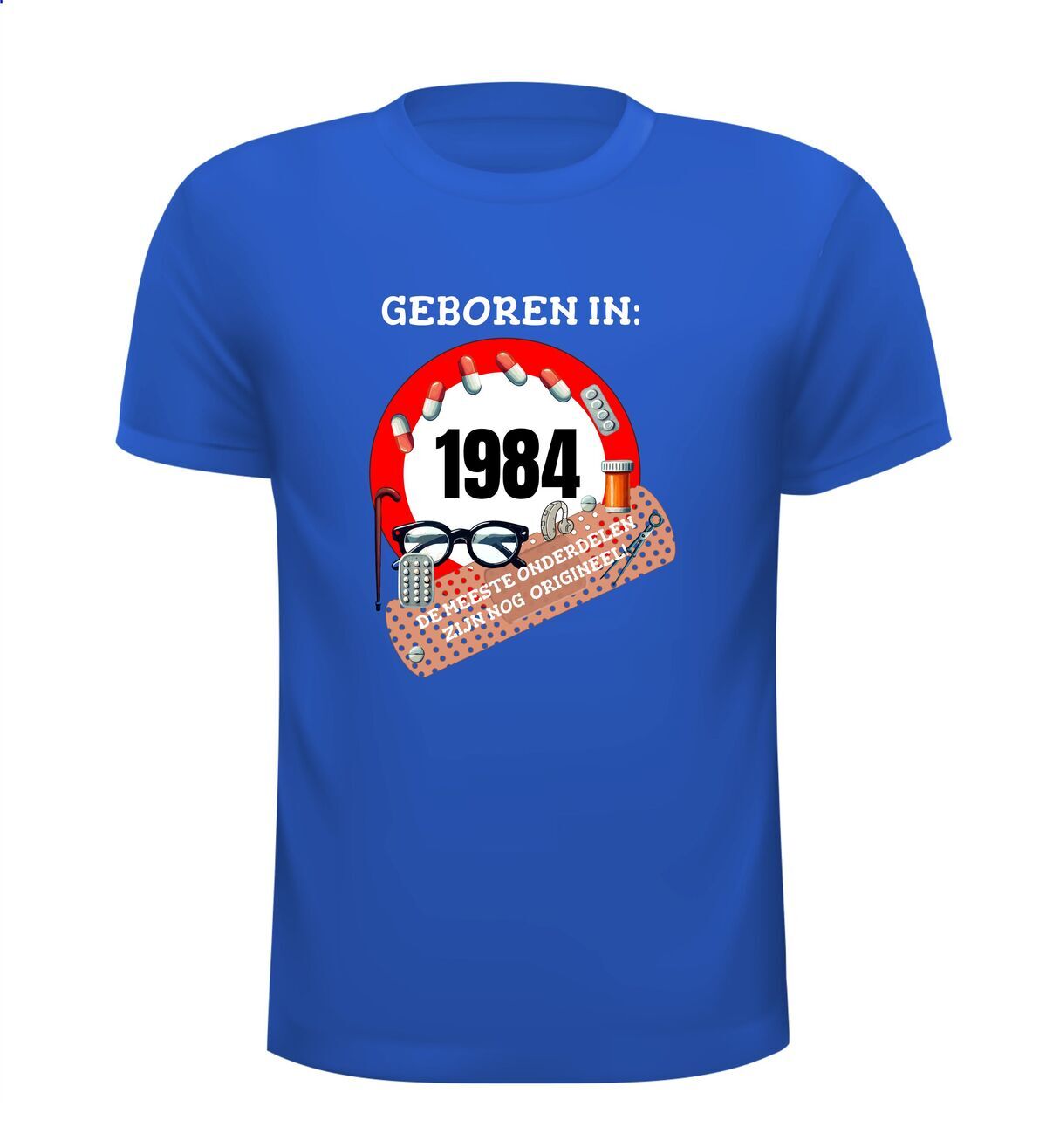 Geboren in 1984 de meeste onderdelen zijn nog orgineel t-shirt. Een leuk en grappig orgineel shirt voor een jarige die in 1984 geboren is. Wat is er nu grappiger en orgineler om het geboorte jaar van de jarige op het verjaardag shirt te hebben staan.