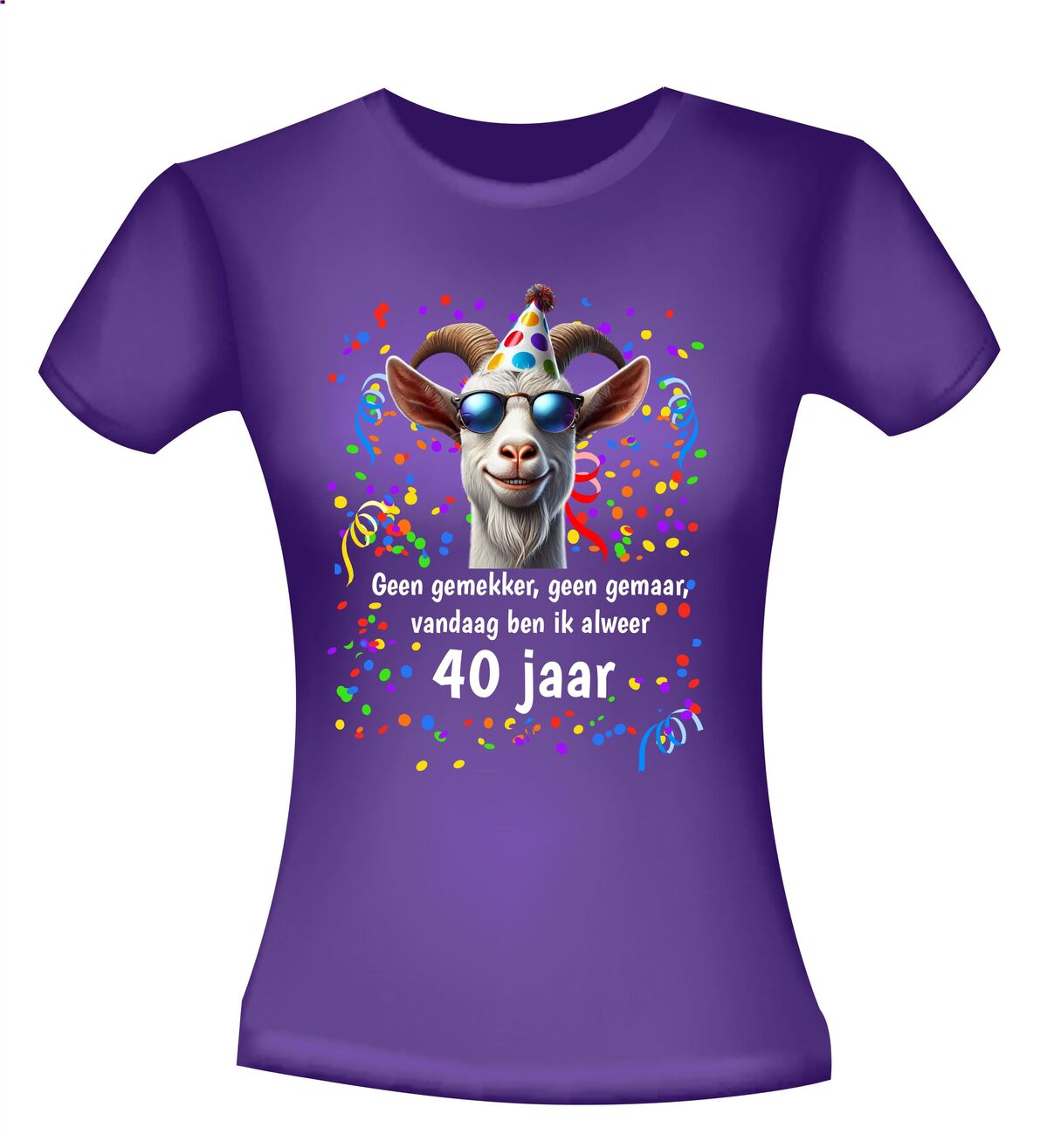 Dit leuke en orginele full colour shirt voor een 40e verjaardag is erg leuk om te geven, maar ook om te krijgen wanneer iemand 40 jaar wordt. Dit shirt met grappige tekst en mooie print kan worden geleverd in dames en heren maat.