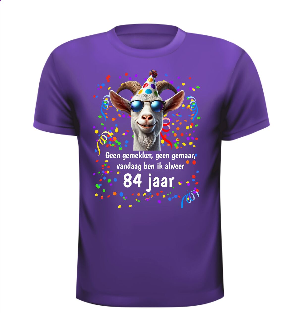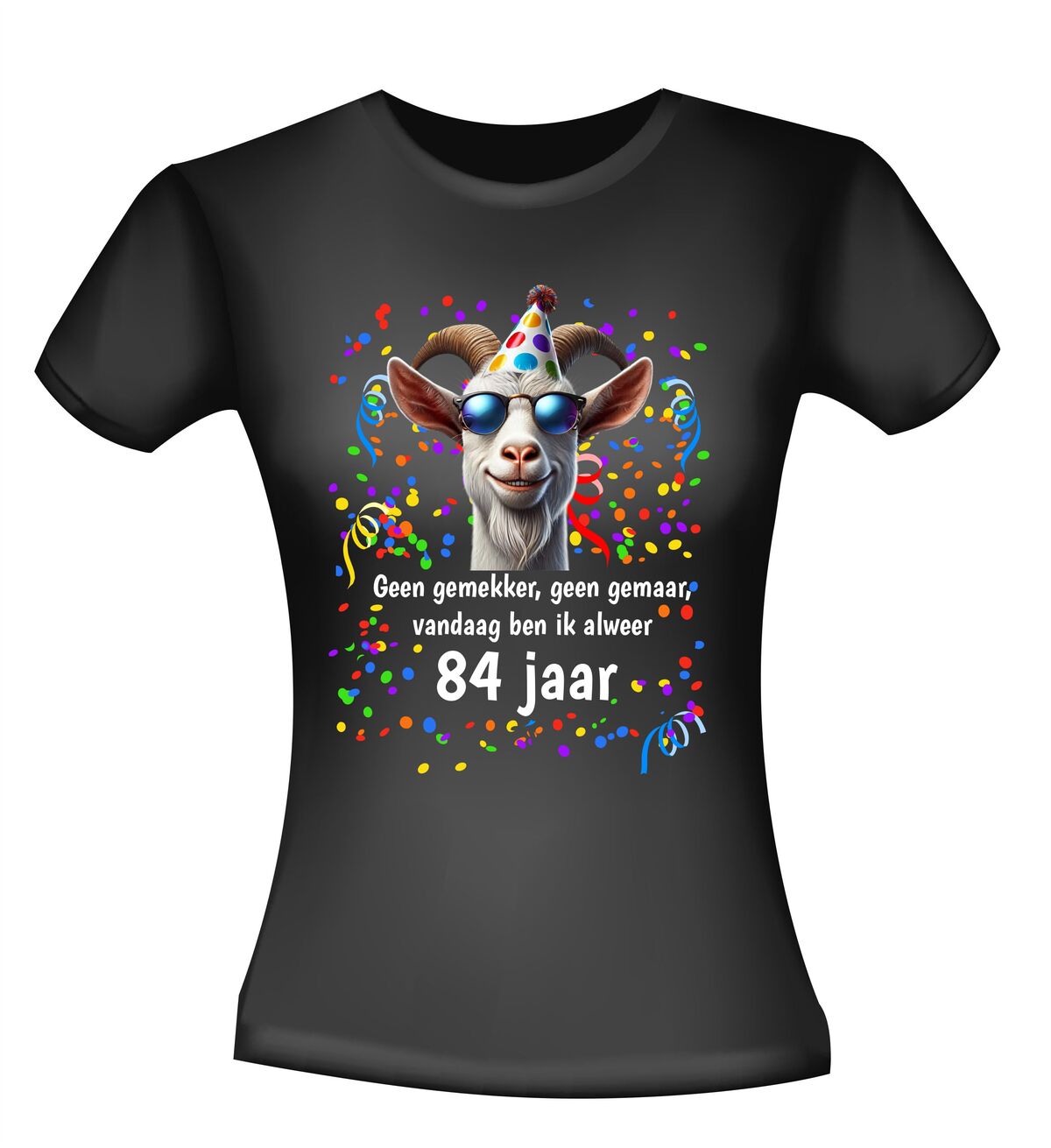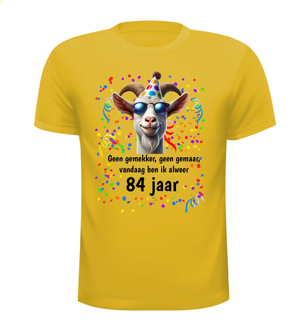 Dit leuke feestelijke shirt is een grappig en orgineel cadeau voor een 84e verjaardag. Op dit leuke shirt voor dames en heren staat de grappige tekst: geen gemekker, geen gemaar vandaag ben ik 84 jaar.