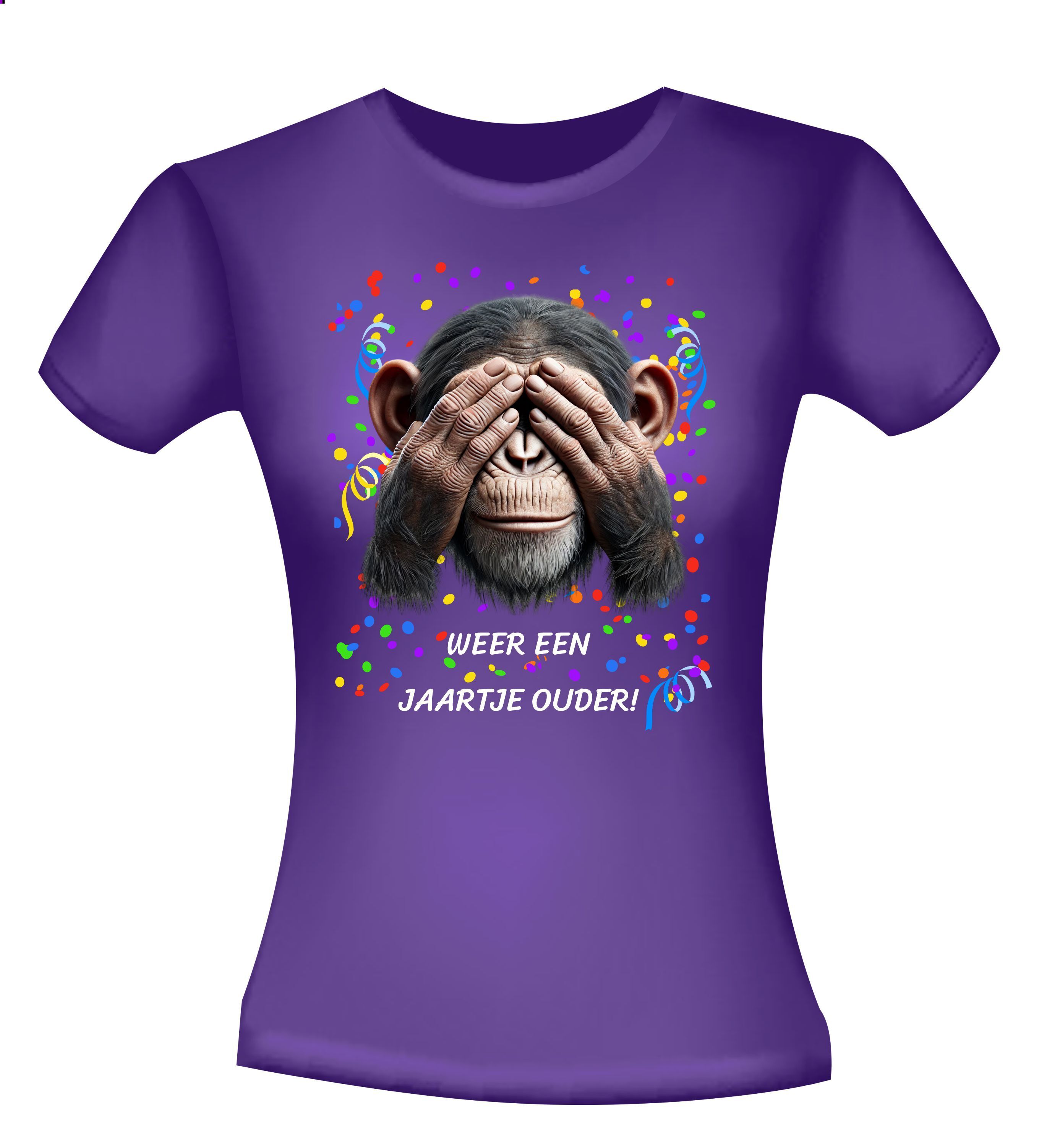 Vier je verjaardag met humor en stijl in dit unieke T-shirt! Een realistische foto van een chimpansee die zijn handen voor zijn ogen houdt, omringd door feestelijke versieringen en de speelse tekst 'Al weer een jaartje ouder'. Dit T-shirt is de perfecte manier om je leeftijd met een knipoog te dragen en zorgt gegarandeerd voor een glimlach op het gezicht van iedereen die het ziet. Een perfect cadeau voor jezelf of iemand anders die het leven met humor viert!