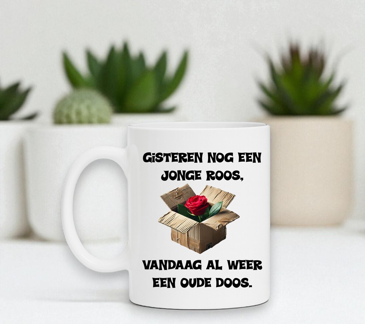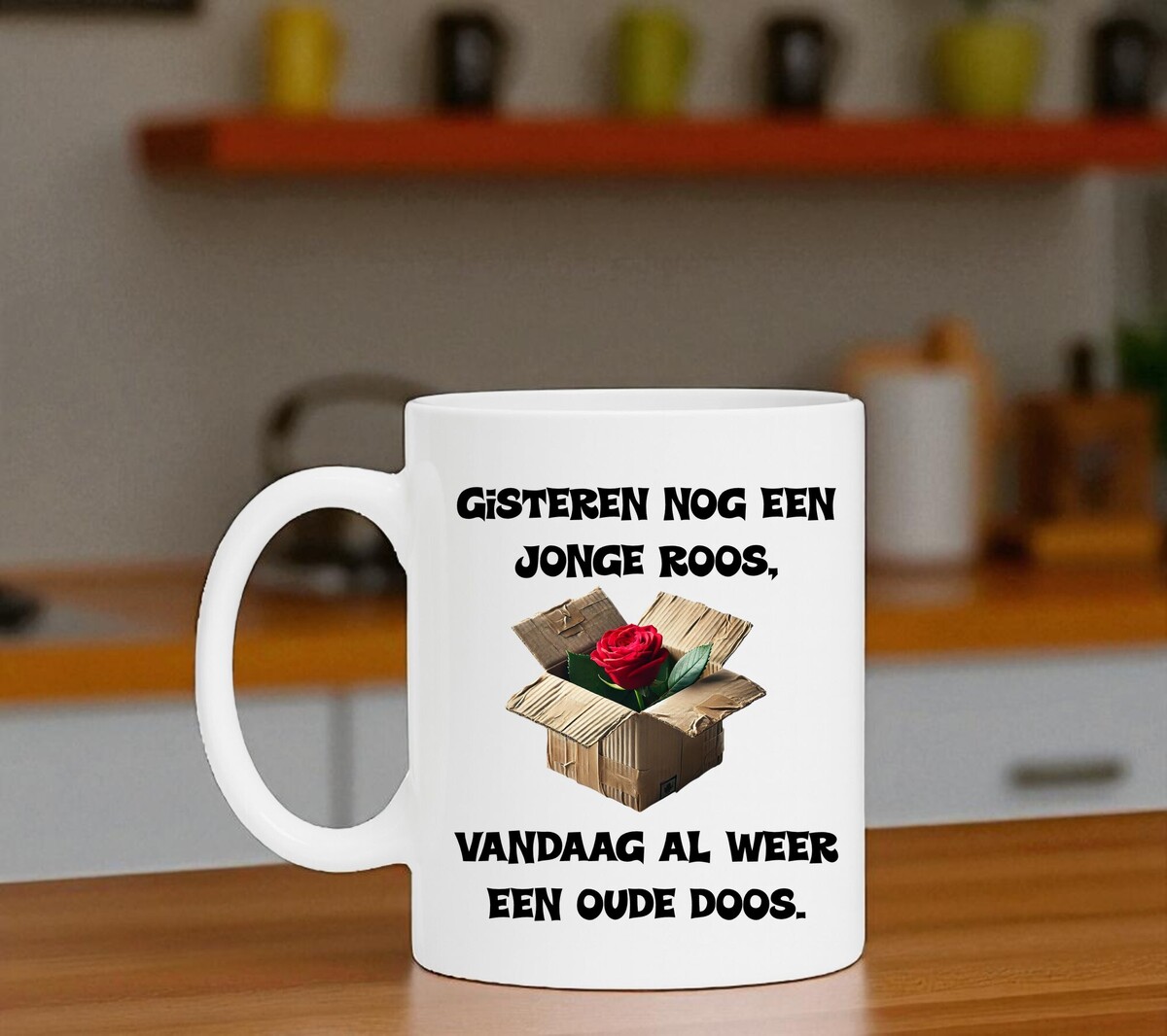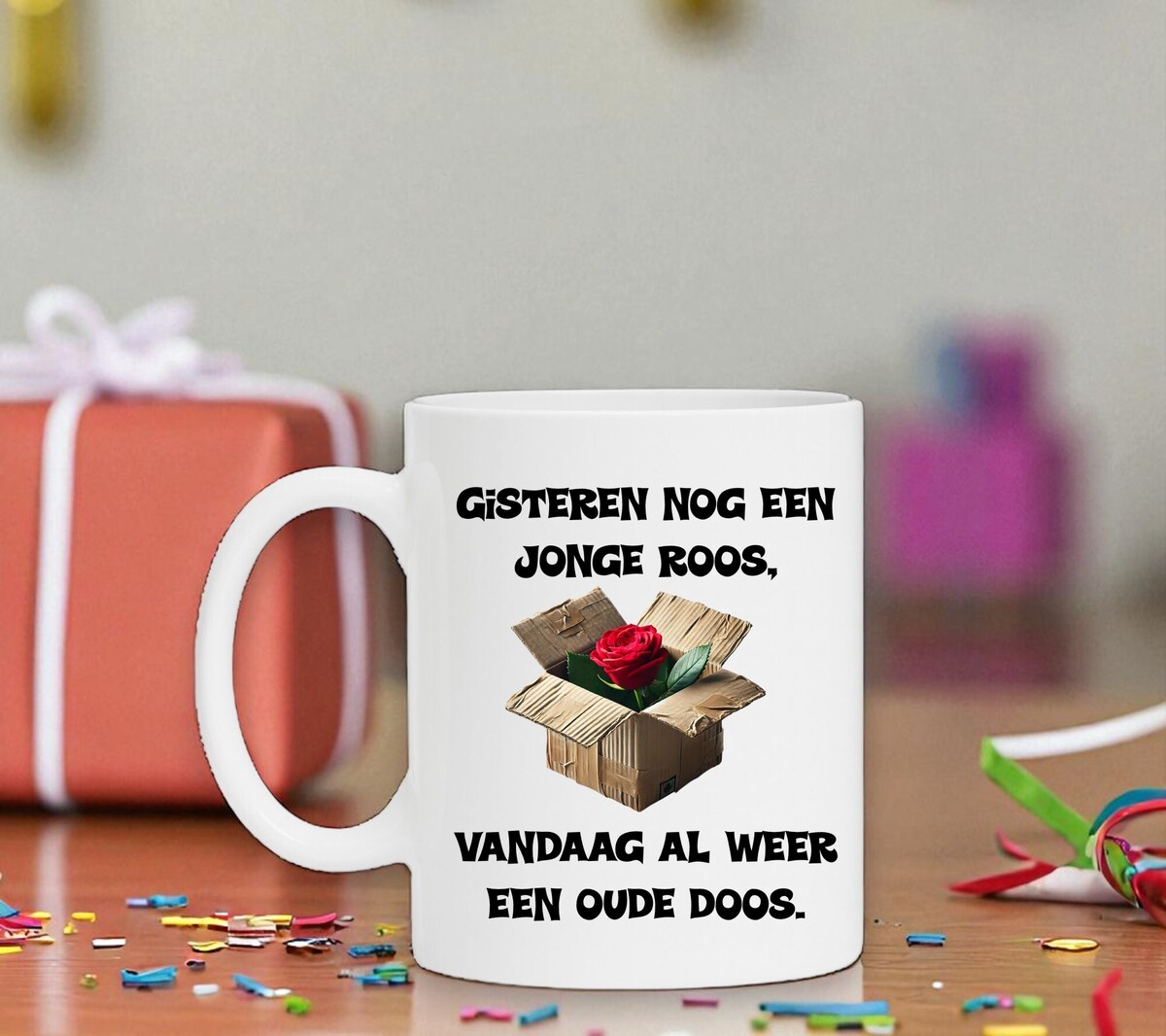 Deze grappige verjaardagsmok is het perfecte cadeau voor iemand met zelfspot. Met de tekst “Gisteren nog een jonge roos, vandaag alweer een oude doos!” zorgt de mok gegarandeerd voor een glimlach bij het ontbijt of op kantoor. Een speelse knipoog naar het ouder worden, zonder het te zwaar te maken. Ideaal om cadeau te geven aan een vriend, vriendin, collega of familielid die jarig is en humor kan waarderen. De mok is geschikt voor dagelijks gebruik en maakt van elk koffiemoment een vrolijk herinnering aan een bijzondere verjaardag.