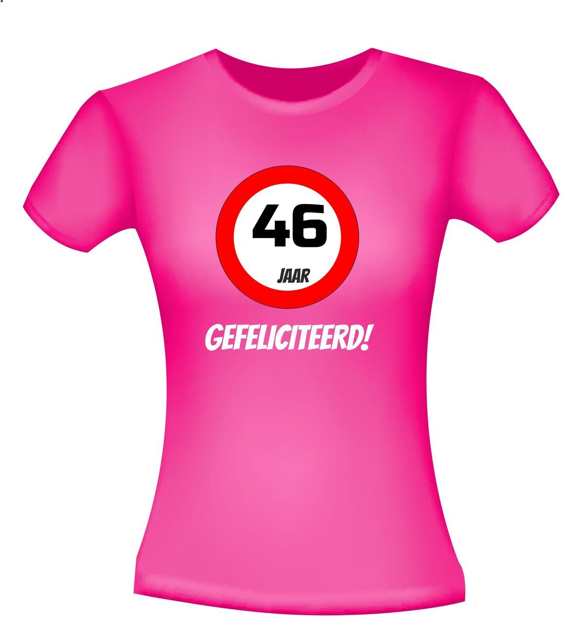 Hoe leuk is het niet om een leeftijds T-shirt cadeau te krijgen voor je 46ste verjaardag? Dit T-shirt is voorzien van een verbodsbord met de leeftijd erin. Onder het verkeersbord staat gefeliciteerd om het feest helemaal compleet te maken.