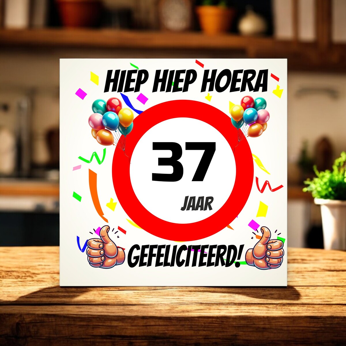 Geef de jarige een grappig en kleurijk spreuken tegeltje kado. Dit vrolijke leeftijd tegeltje is voorzien van een superleuk tekst: Hiep Hiep Hoera 37 jaar gefeliciteerd. De kleurrijke confetti en ballonen maak het geheel helemaal af.