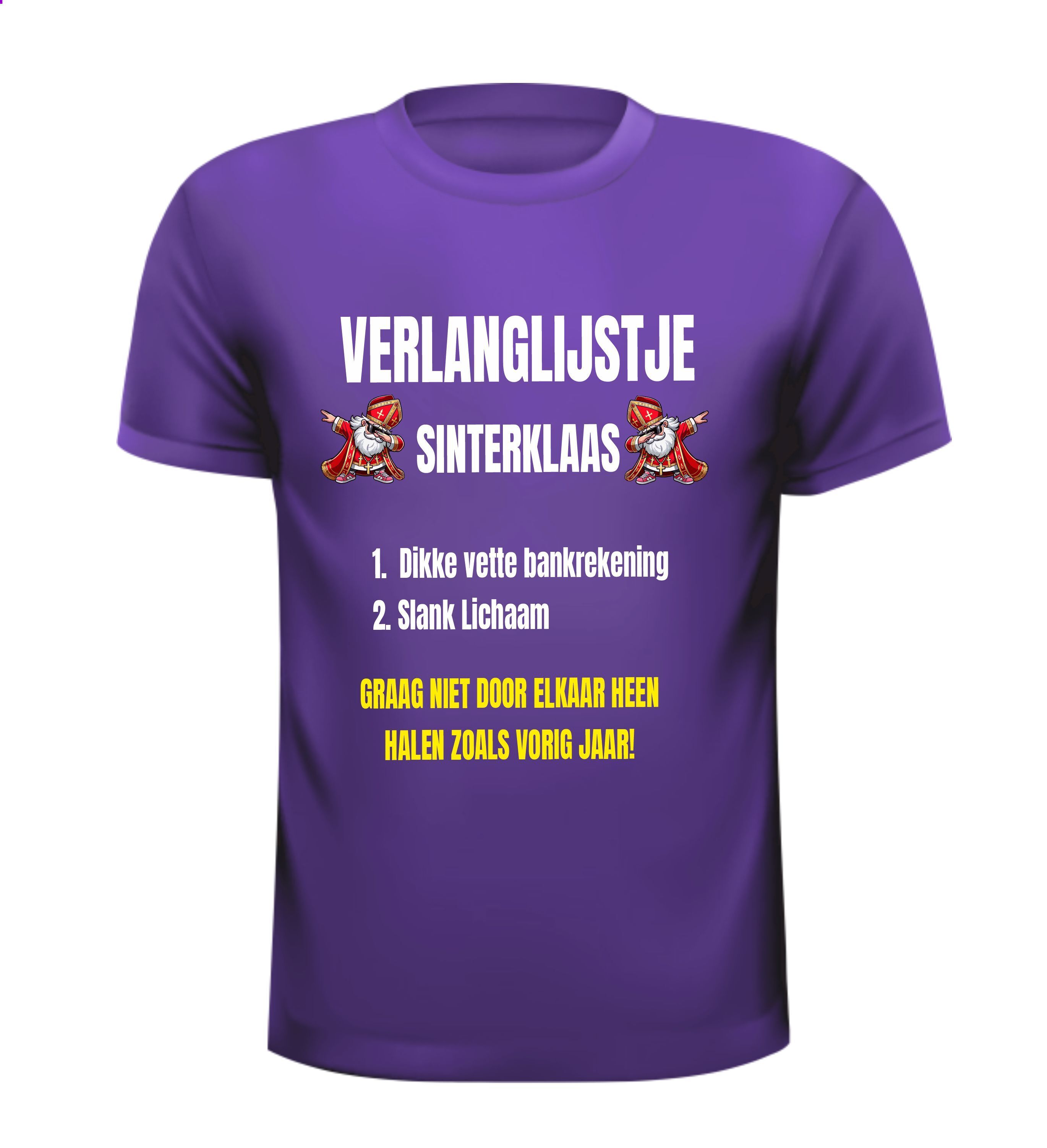 Helaas maak Sinterklaas ook weleens een foutje in het geven van cadeautjes. Om dit te voorkomen hebben wij een mooi T-shirt voor jouw ontworpen. Zo kan de Sinterklaas de dikke vette bankrekening niet verwisselen met een slank lichaam. Moet jij beloven niet te veel pepernoten te eten!