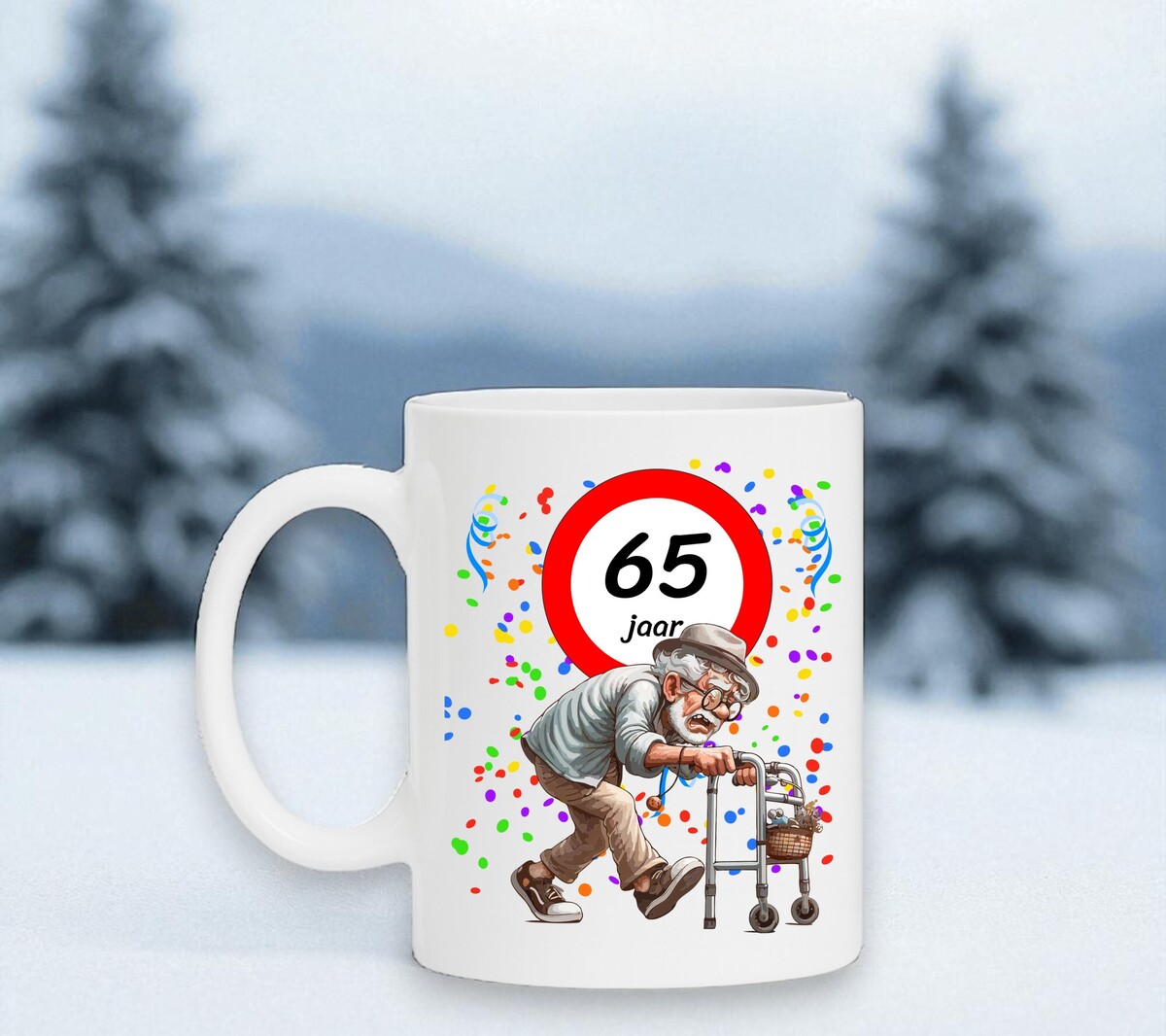 Lachen Gegarandeerd: De hilarische afbeelding van een oude opa met een rollator zorgt voor een onmiddellijke glimlach. Deze mok neemt de 65-jarige verjaardag niet al te serieus en geeft een komische draai aan ouder worden!