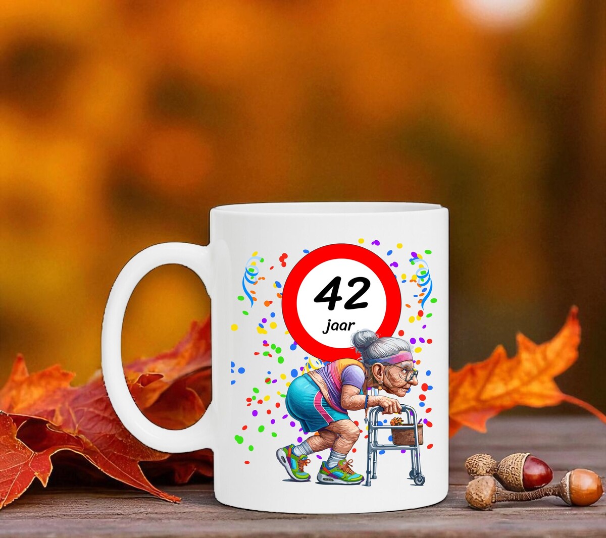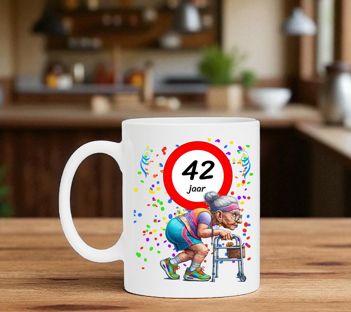 Grappige Illustratie van een "Oud Vrouwtje" – De mok heeft een speelse en humoristische afbeelding van een schattig oud dametje met een rollator. De tekst erbij laat subtiel doorschemeren dat de 42-jarige nu officieel de eerste stapjes richting "oude dag" zet – maar natuurlijk met een knipoog! Want laten we eerlijk zijn, 42 is het nieuwe 32, toch?
