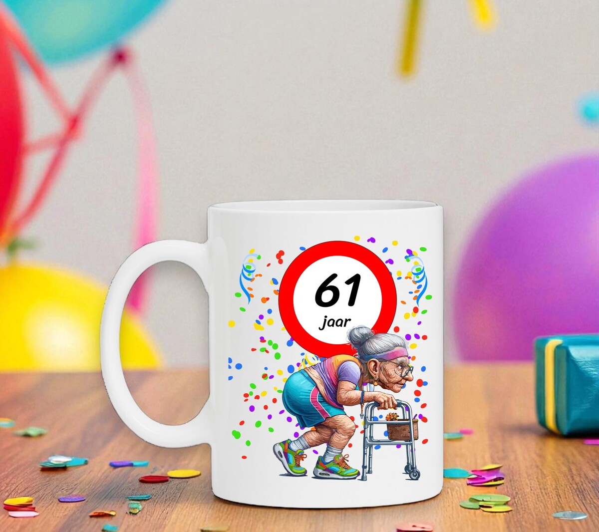 Ben je op zoek naar een cadeau dat zowel praktisch als hilarisch is voor een speciale dame die 61 jaar wordt? Zoek niet verder! Deze mok, met een humoristische afbeelding van een oma met een rollator, is dé perfecte manier om haar te laten lachen op haar verjaardag en daarna.