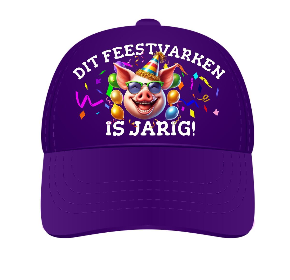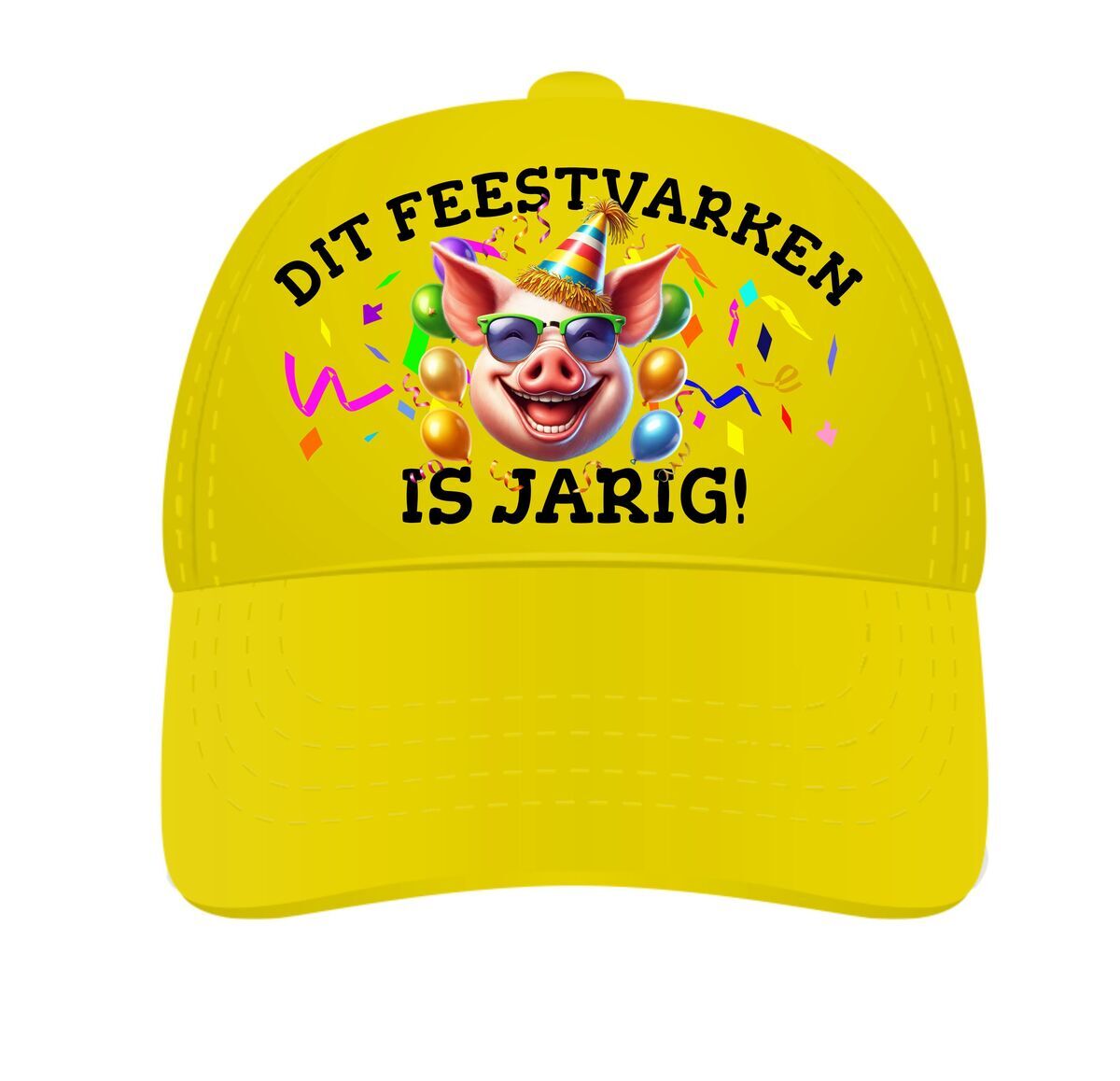 Leuke pet voor een verjaardag. Deze caps zijn verstelbaar en leverbaar in diverse kleuren. Op deze pet staat een full colour print en de tekst: dit feestvarken is jarig!