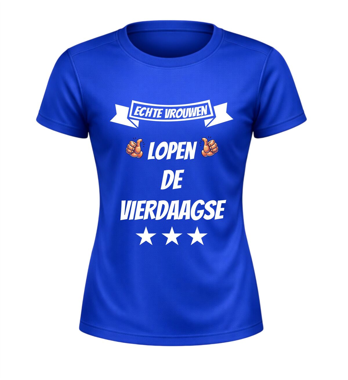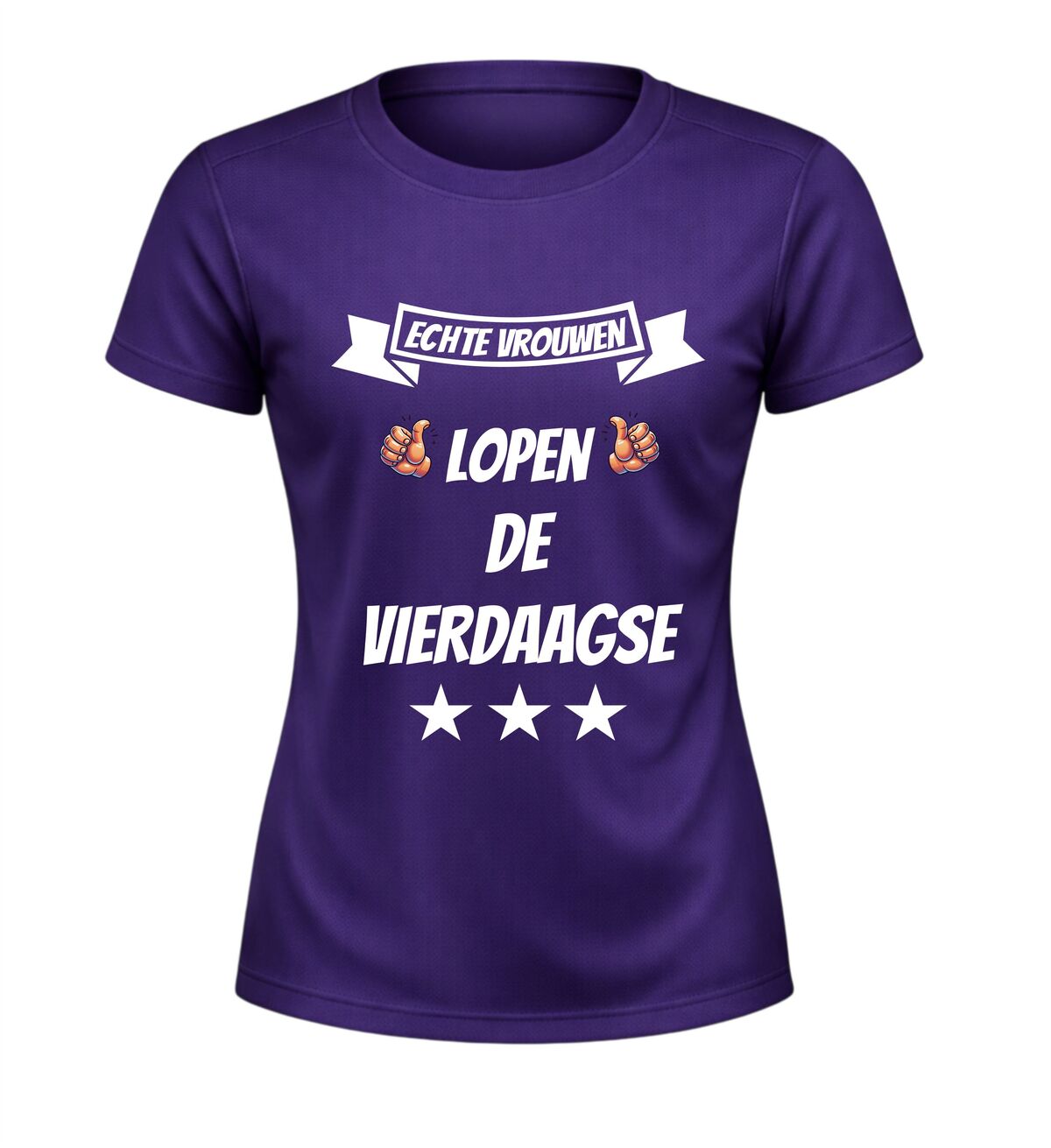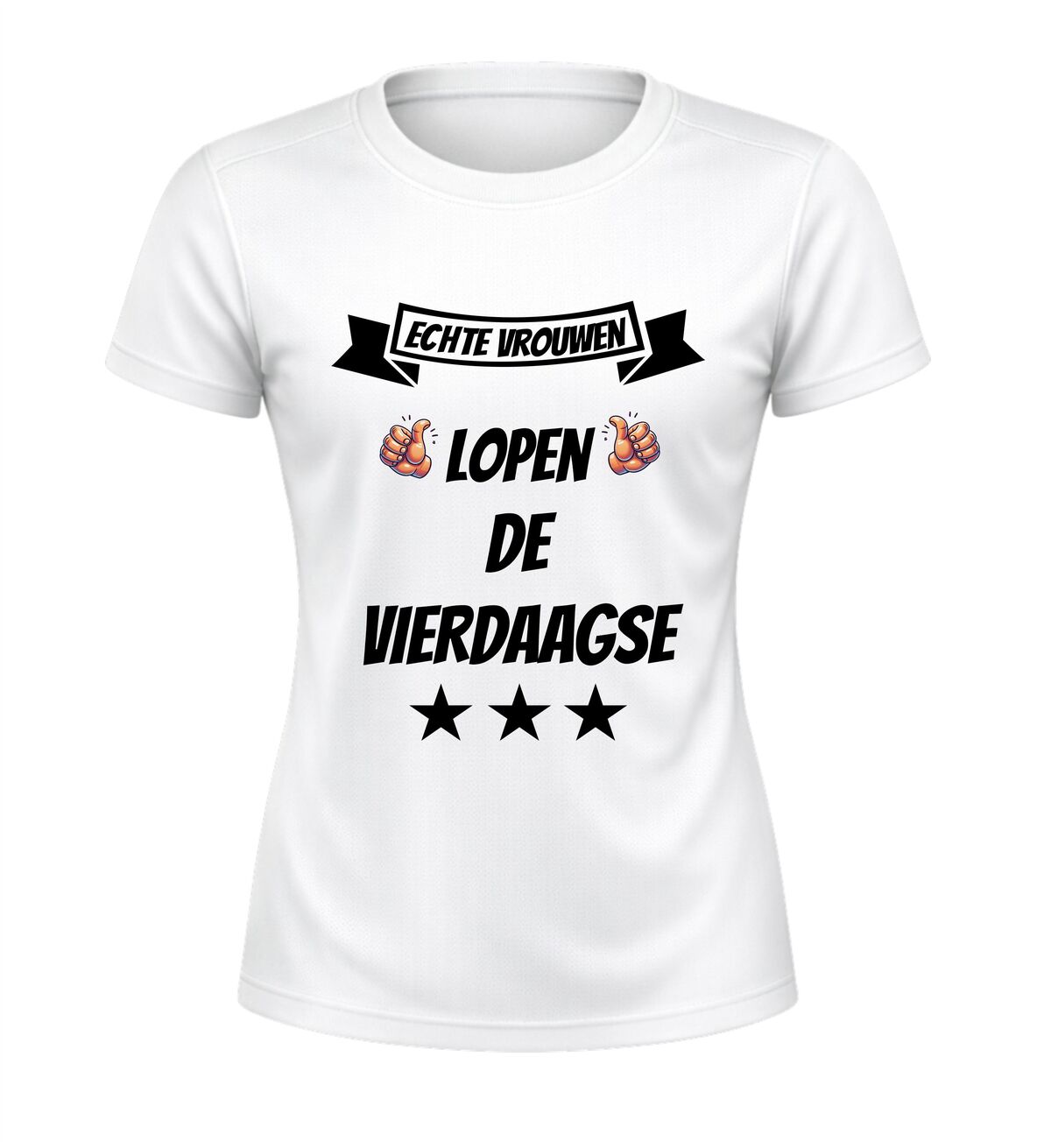 Dit dames sportshirt met de tekst echte vrouwen lopen de vierdaagse is perfect voor vrouwen die met trots deelnemen aan de Vierdaagse of zich voorbereiden op lange wandeltochten. Het shirt is gemaakt van lichtgewicht en ademend sportmateriaal dat vocht snel afvoert en comfortabel blijft aanvoelen, zelfs tijdens intensieve inspanning en warme dagen. De sportieve pasvorm sluit mooi aan en biedt optimale bewegingsvrijheid, waardoor dit shirt ideaal is als wandelshirt, hardloopshirt of trainingsshirt voor dames. Dankzij de krachtige en herkenbare opdruk is dit Vierdaagse shirt niet alleen functioneel, maar ook een motiverend statement. Geschikt voor training, deelname aan de Vierdaagse of als origineel cadeau voor een sportieve vrouw die van doorzetten houdt.