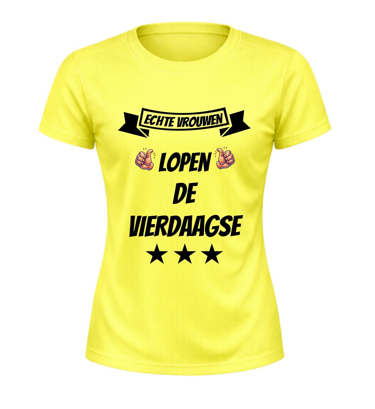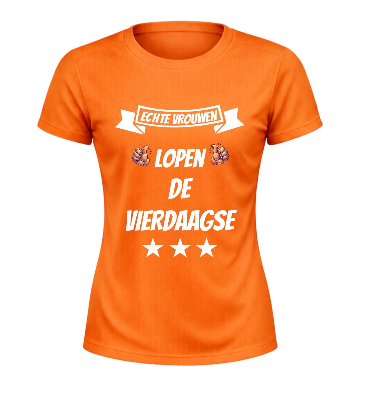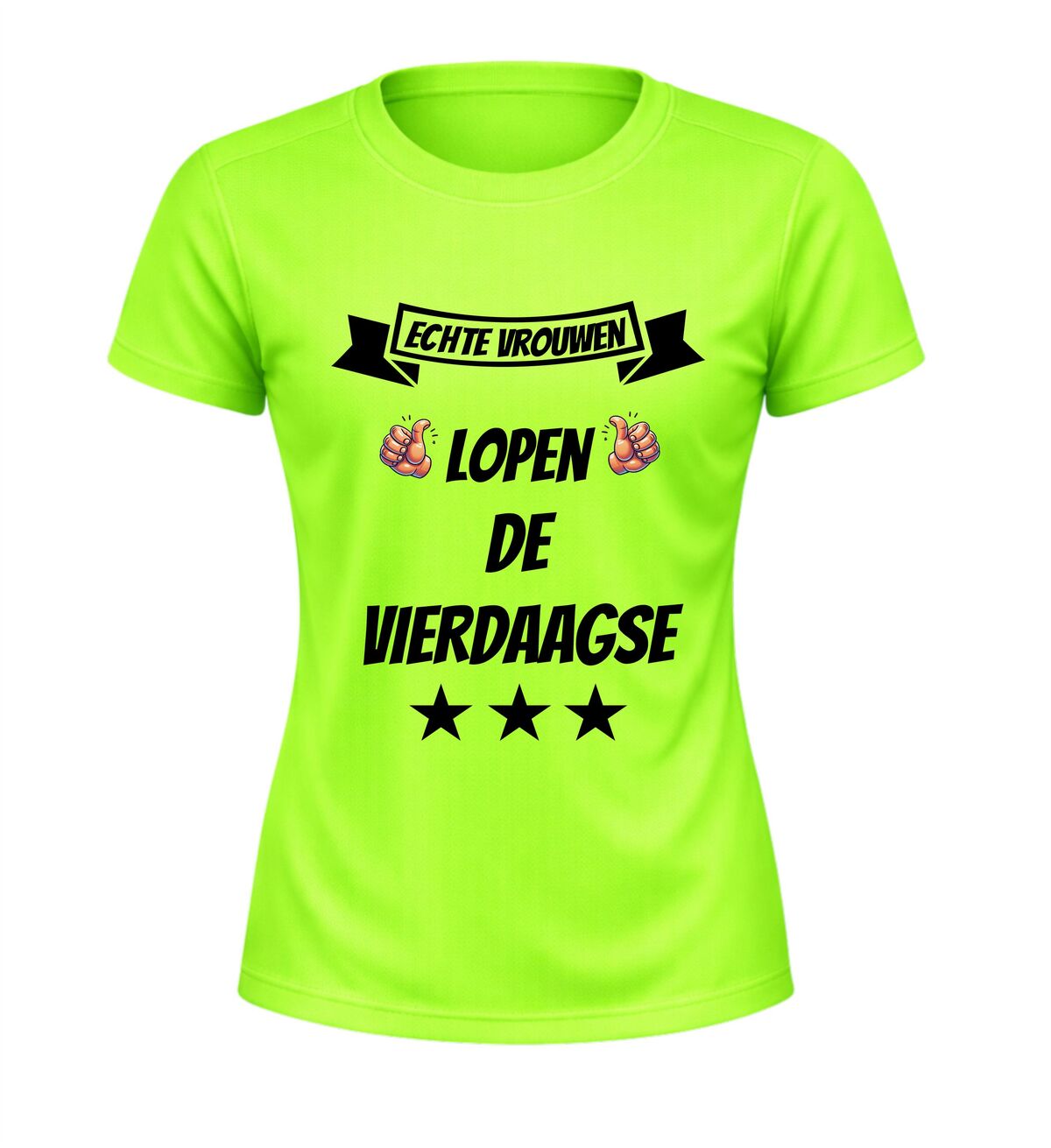 Dit dames sportshirt met de tekst echte vrouwen lopen de vierdaagse is perfect voor vrouwen die met trots deelnemen aan de Vierdaagse of zich voorbereiden op lange wandeltochten. Het shirt is gemaakt van lichtgewicht en ademend sportmateriaal dat vocht snel afvoert en comfortabel blijft aanvoelen, zelfs tijdens intensieve inspanning en warme dagen. De sportieve pasvorm sluit mooi aan en biedt optimale bewegingsvrijheid, waardoor dit shirt ideaal is als wandelshirt, hardloopshirt of trainingsshirt voor dames. Dankzij de krachtige en herkenbare opdruk is dit Vierdaagse shirt niet alleen functioneel, maar ook een motiverend statement. Geschikt voor training, deelname aan de Vierdaagse of als origineel cadeau voor een sportieve vrouw die van doorzetten houdt.