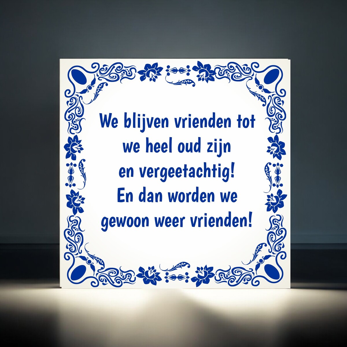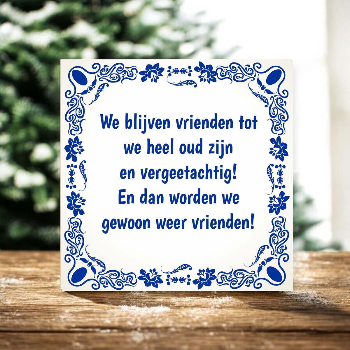 Een leuk vriendschap tegeltje met een formaat van 15cm x 15cm. Op het tegeltje staaat de opdruk 'We blijven vrienden tot we heel oud zijn en vergeetachtig! En dan worden we gewoon weer vrienden!'.