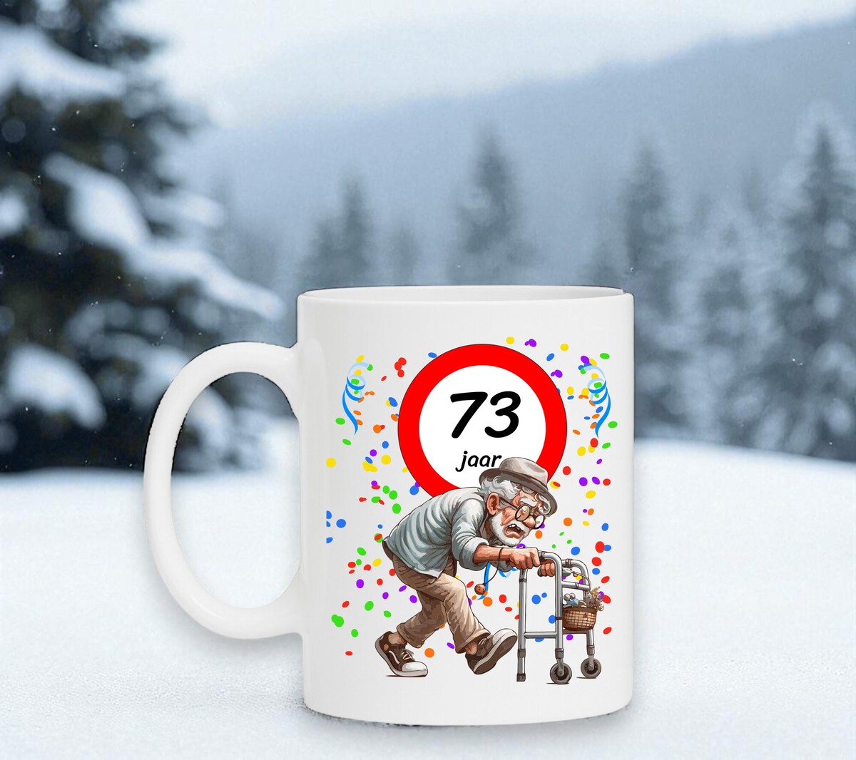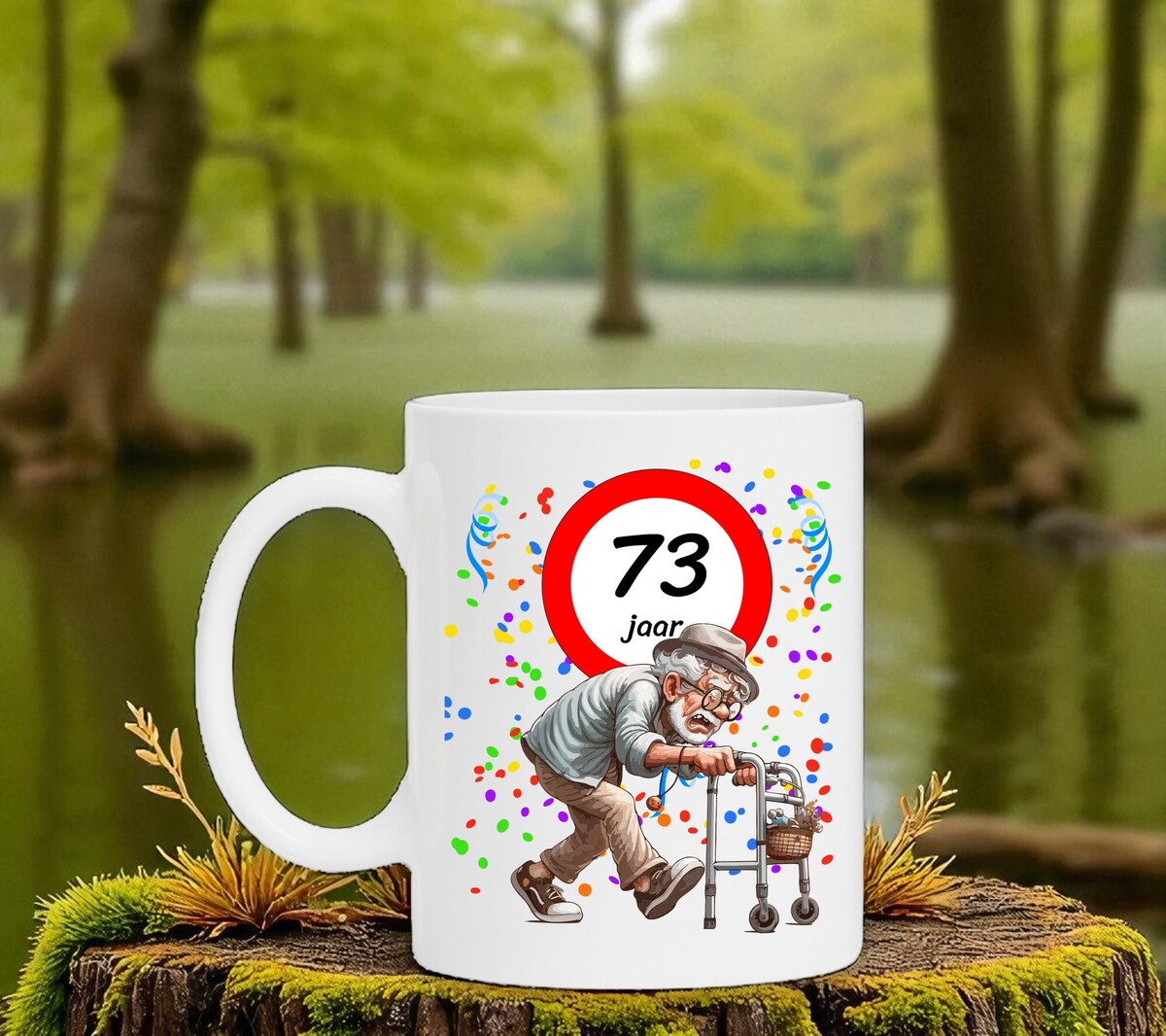 Verras de 73-jarige met een glimlach en een mok die hem eraan herinnert dat leeftijd slechts een getal is. Een perfect cadeau voor de man met humor!