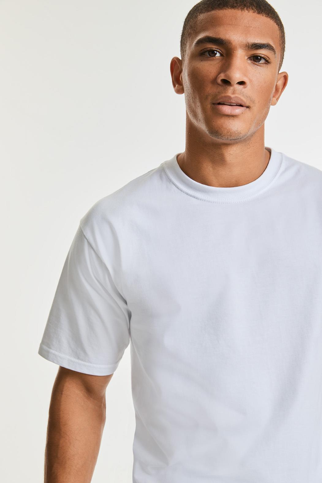 Zwaar T-shirt wit rondgebreid korte mouw en met schouder tot schouder nekband. Is een basic shirt maar wel van bijzondere zware kwaliteit. Deze kwaliteit is zeer goed te bedrukken en zelf goed met een kleine borduring. Merk: Russell Classic Heavyweight T-Shirt. Materiaal:100% Combed Ringspun katoen. Land van herkomst: Morocco. Dikte: 210 g/m2. De foto met het model is bedoeld om de sfeer weer te geven. Let alstublieft niet op de kleur.