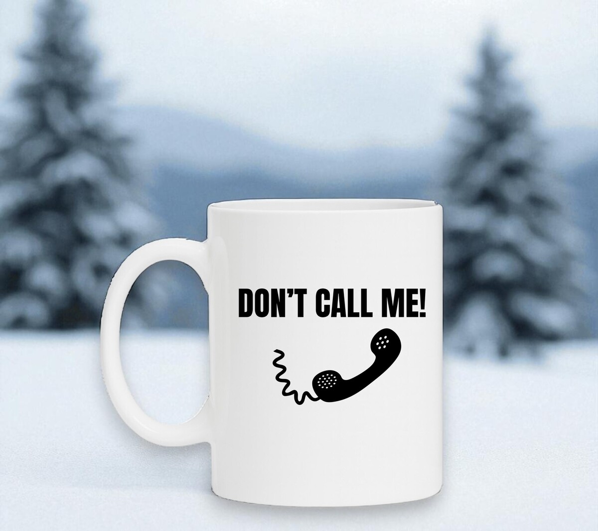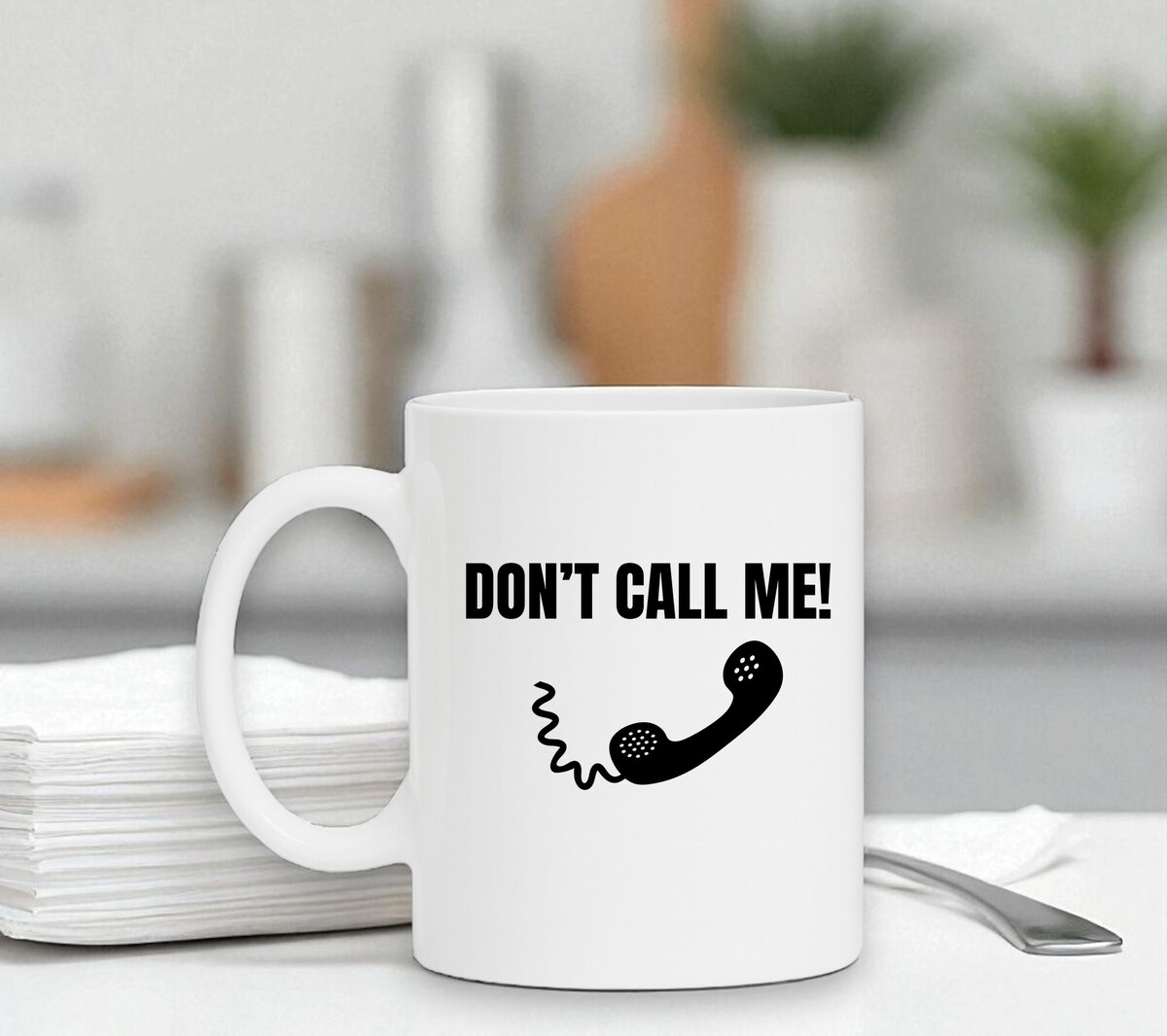 Wiite koffie of thee mok met de opdruk van een ouderwetse telefoonhoorn en de tekst don't call me! De mok is magnetron en vaatwasserbestendig en de witte mok heeft een hoogte van 96mm en een diameter van 80mm.