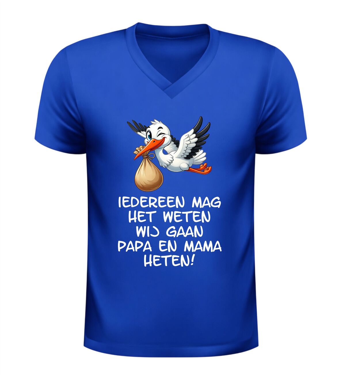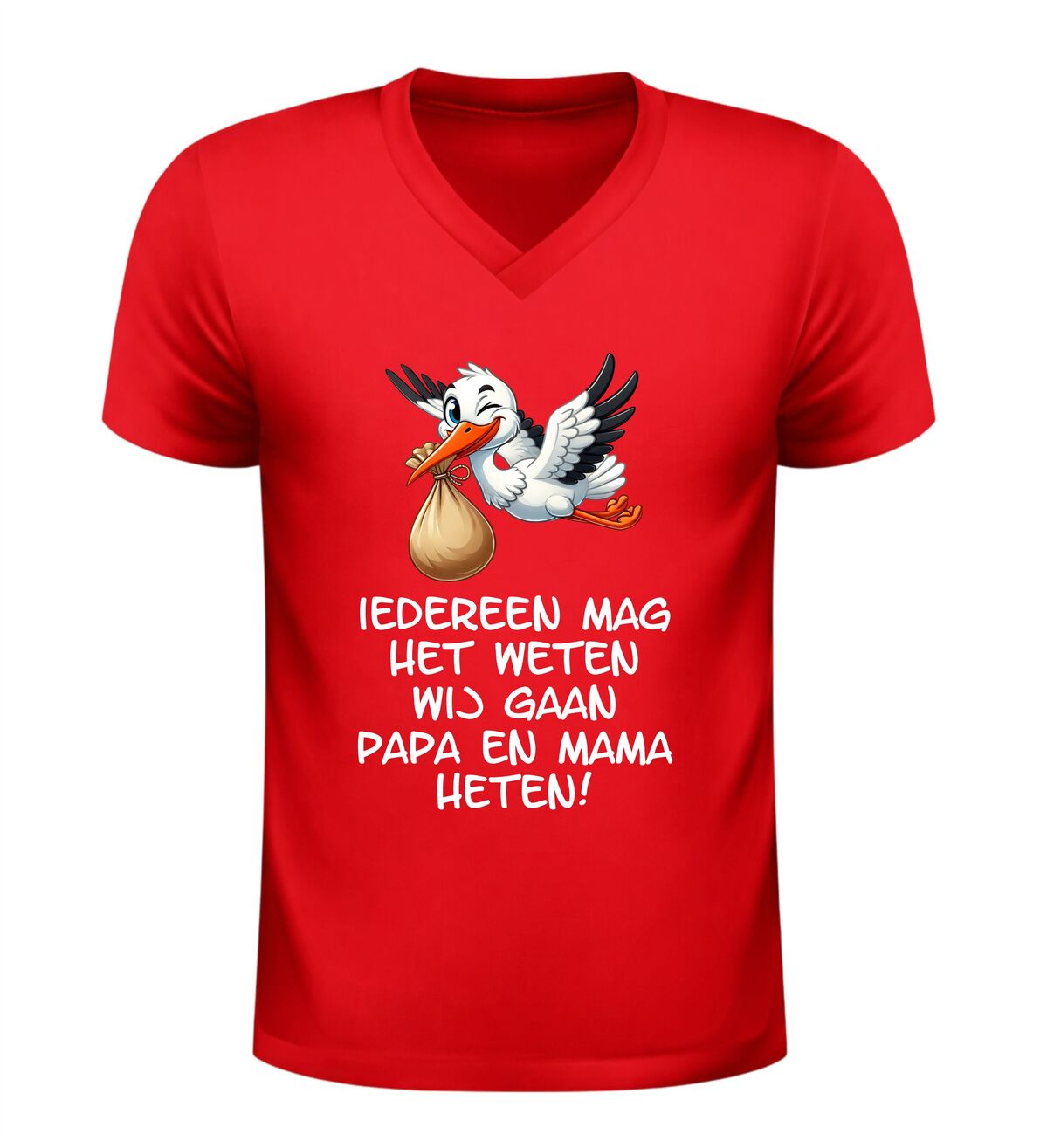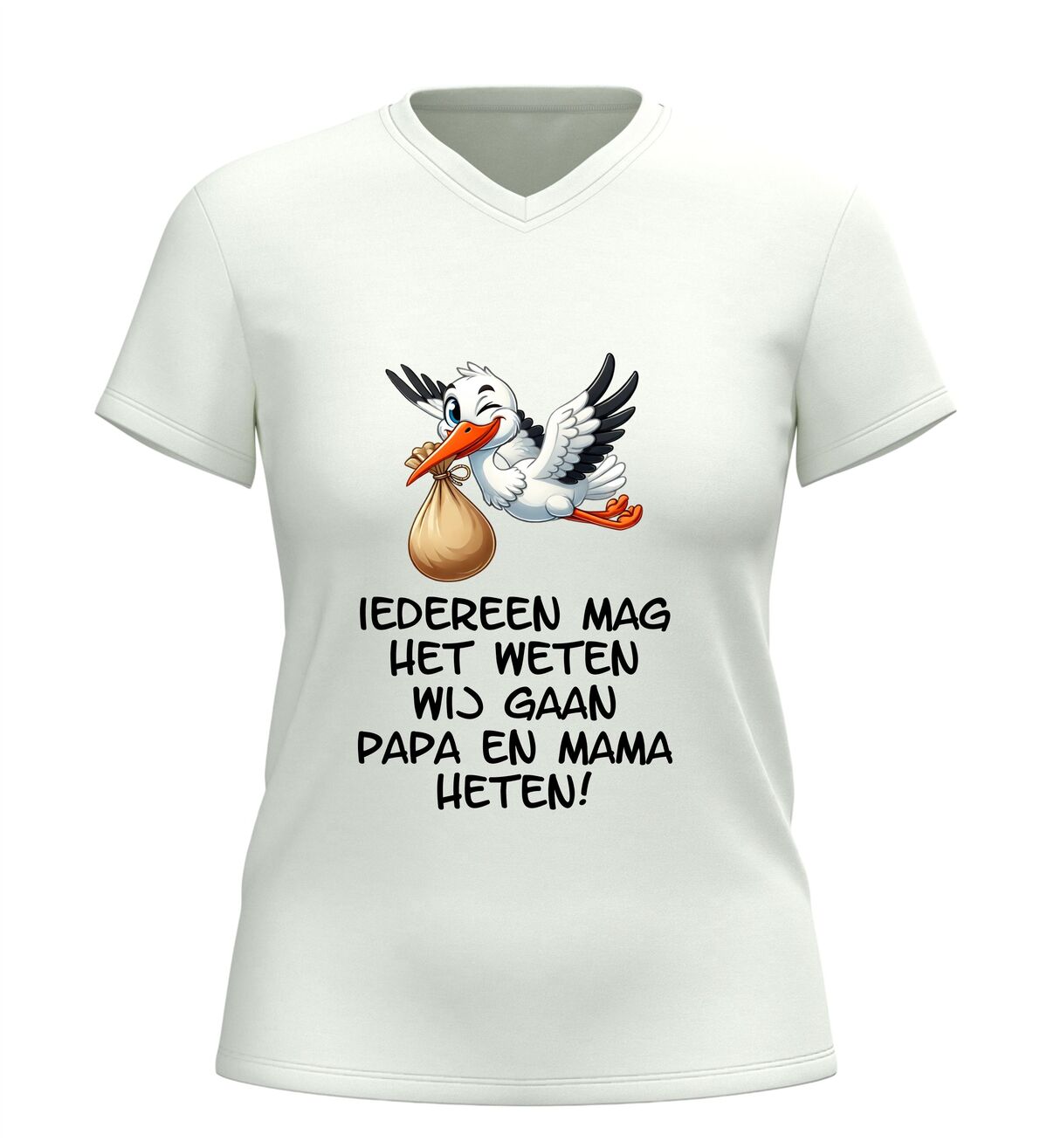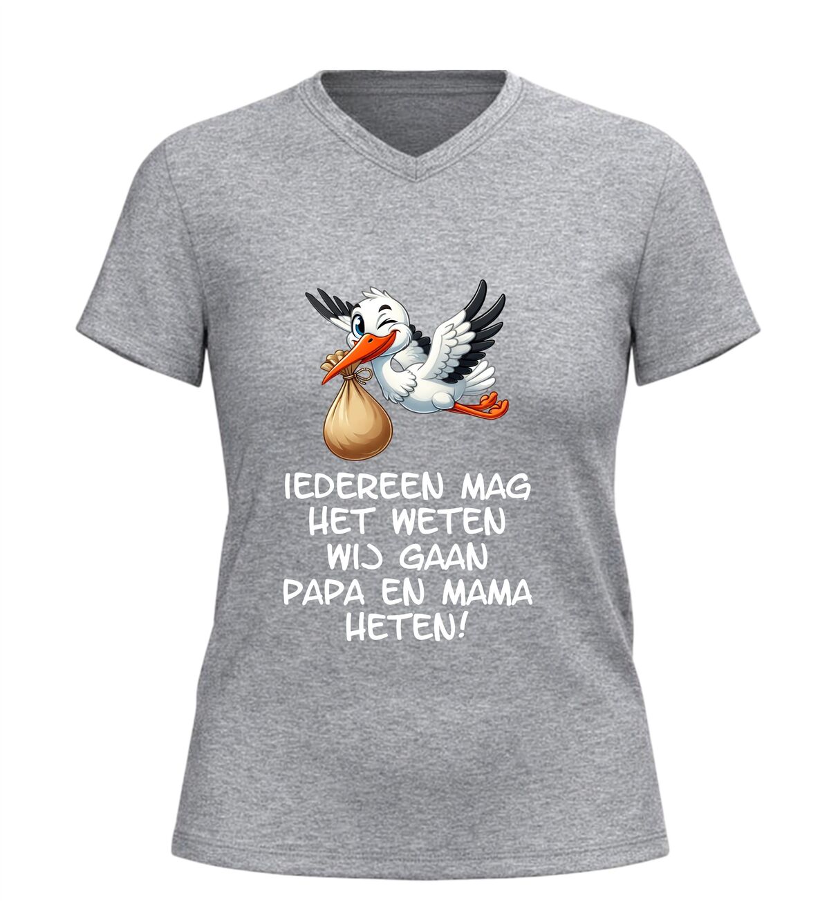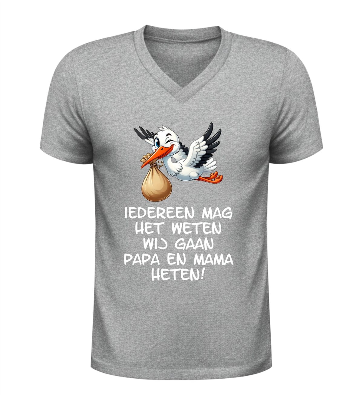 Dit Iedereen mag het weten wij gaan papa en mama heten v-hals t-shirt is een bijzonder en liefdevol shirt om een zwangerschap aan te kondigen. De ontroerende tekst Iedereen mag het weten wij gaan papa en mama heten in combinatie met een schattige afbeelding van een ooievaar maakt dit V-hals shirt met zwangerschap aankondiging perfect om het grote nieuws op een originele manier te delen.