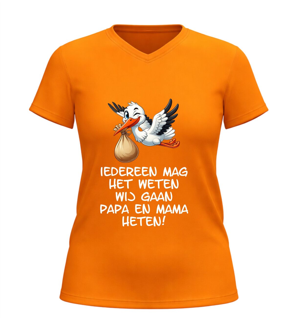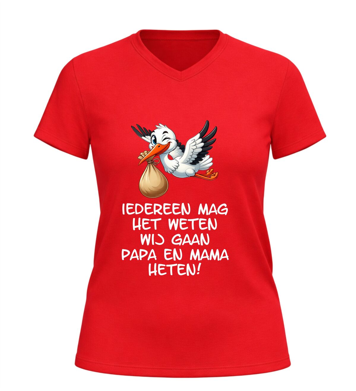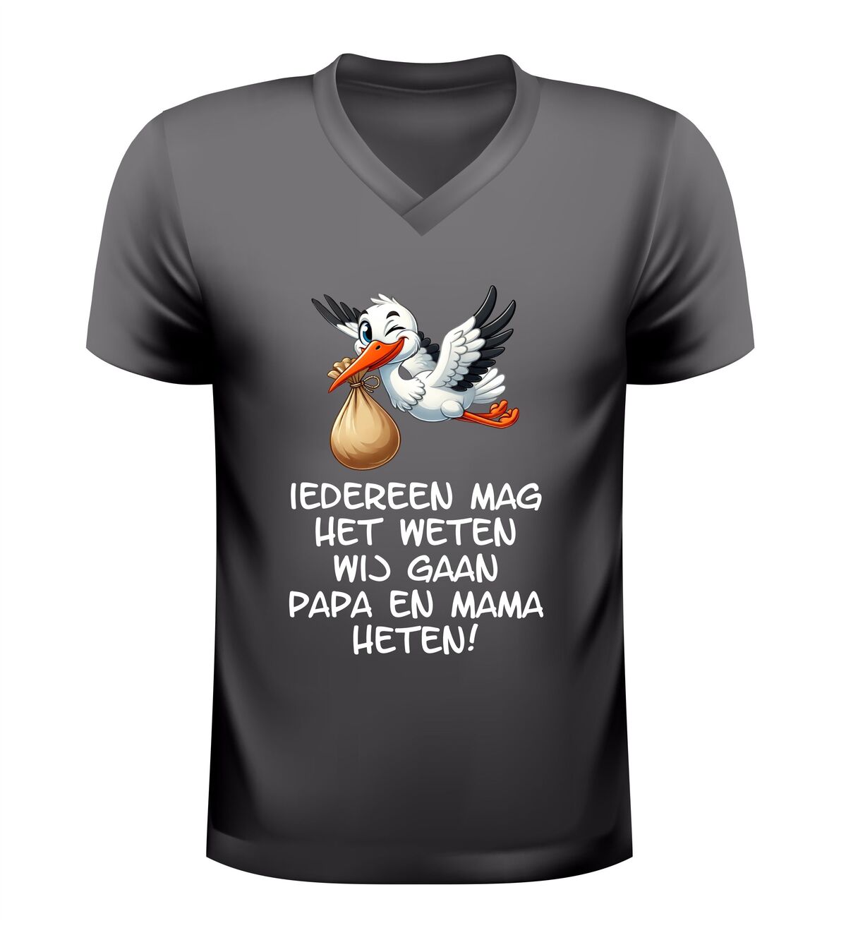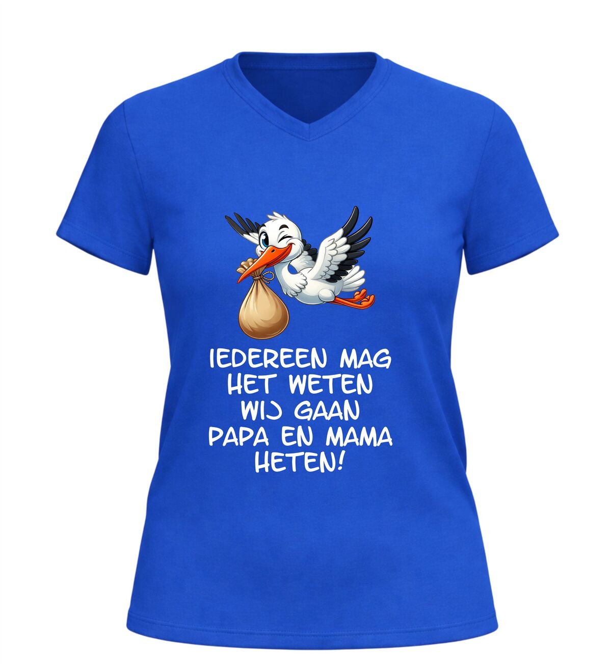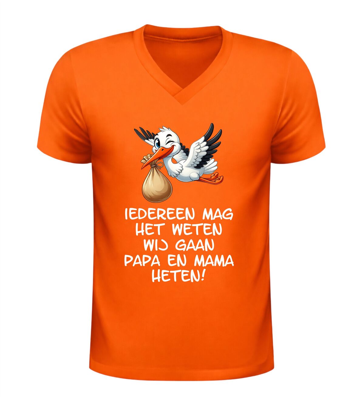 Dit Iedereen mag het weten wij gaan papa en mama heten v-hals t-shirt is een bijzonder en liefdevol shirt om een zwangerschap aan te kondigen. De ontroerende tekst Iedereen mag het weten wij gaan papa en mama heten in combinatie met een schattige afbeelding van een ooievaar maakt dit V-hals shirt met zwangerschap aankondiging perfect om het grote nieuws op een originele manier te delen.
