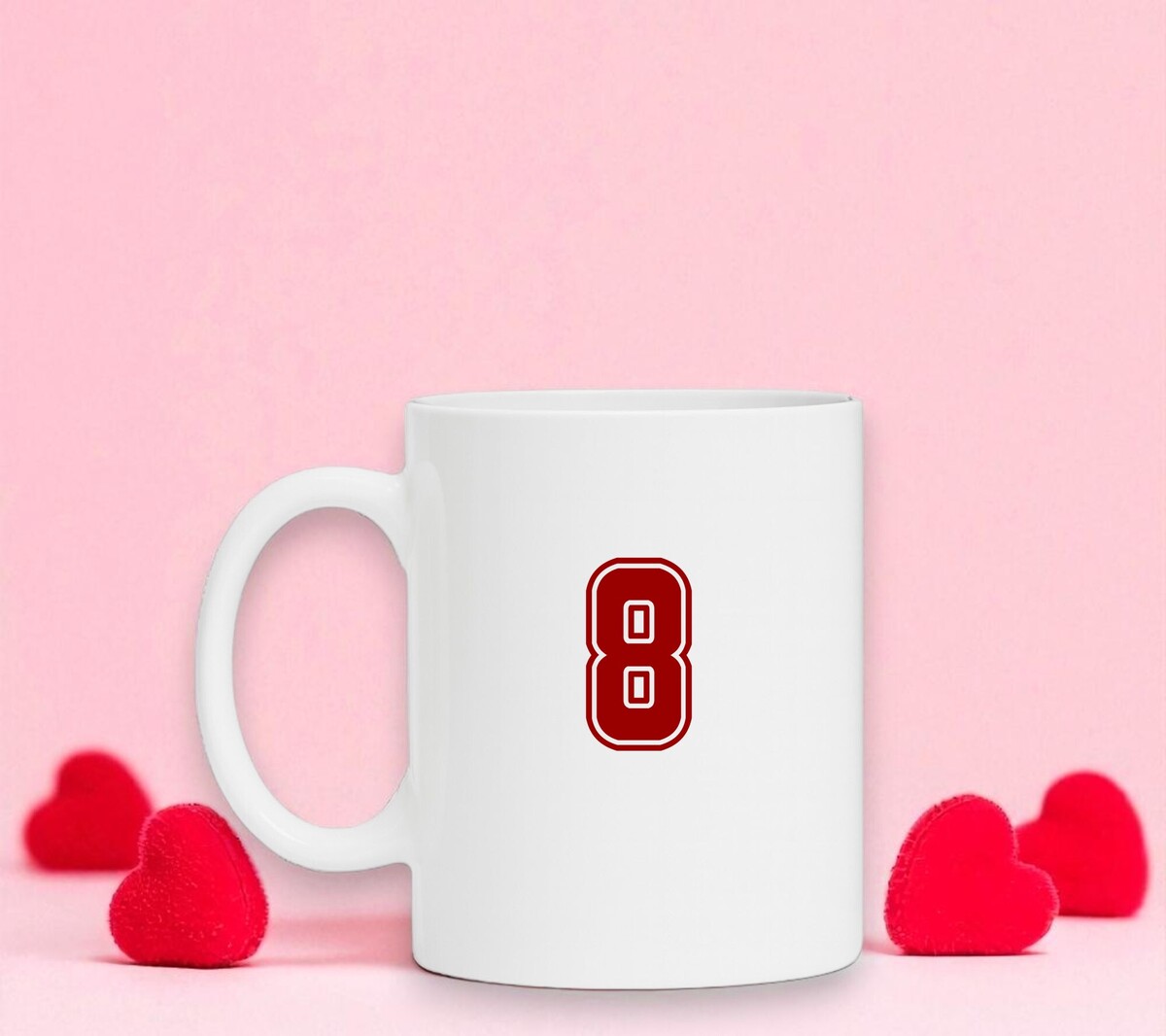 Wit koffiemok met het getal 8 erop gedrukt.