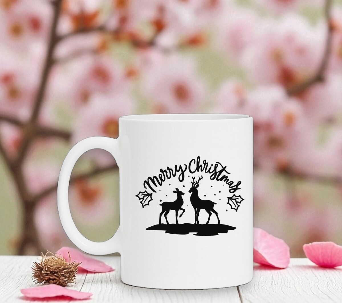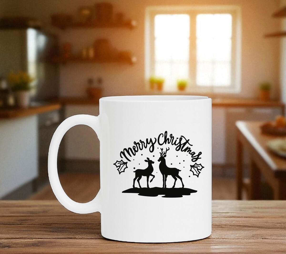 Witte kerst mok Merry Christmas met herten opdruk. De mok is magnetron en vaatwasserbestendig en de witte mok heeft een hoogte van 96mm en een diameter van 80mm.
