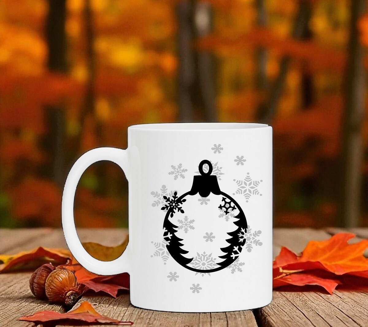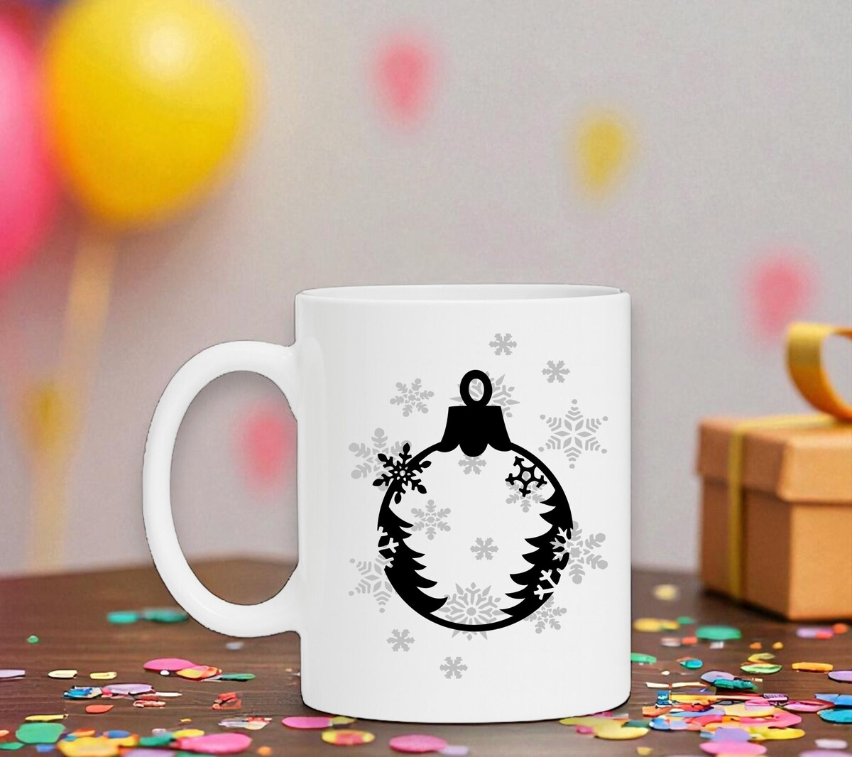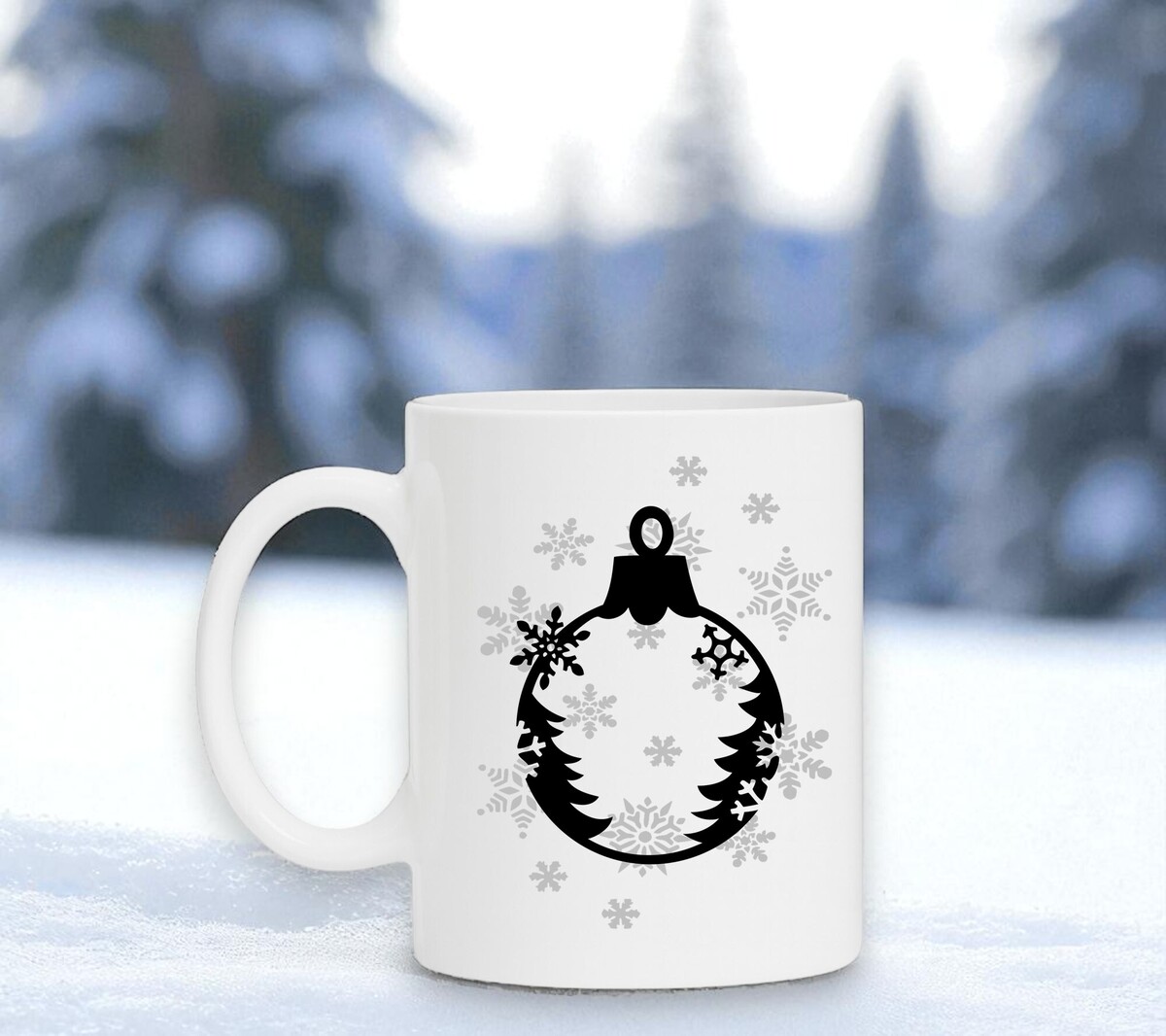 Witte kerst mok met kerstbal en winterse opdruk. De mok is magnetron en vaatwasserbestendig en de witte mok heeft een hoogte van 96mm en een diameter van 80mm.