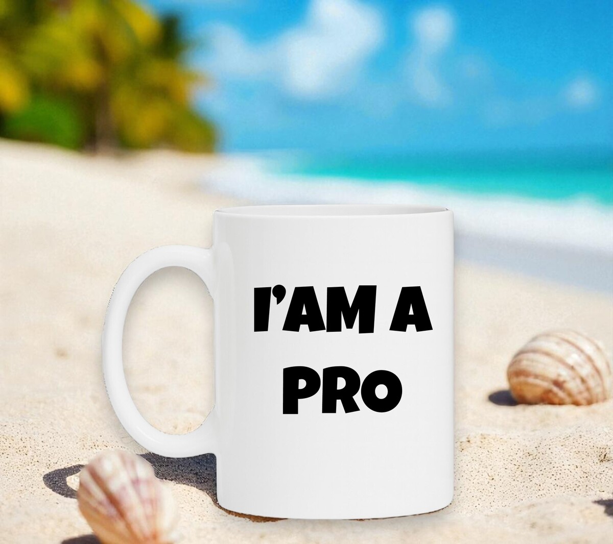 Witte koffie of thee mok i'am a pro mok professioneel. De mok is vaatwasserbestendig en heeft een hoogte van 96mm en een diameter van 80mm.